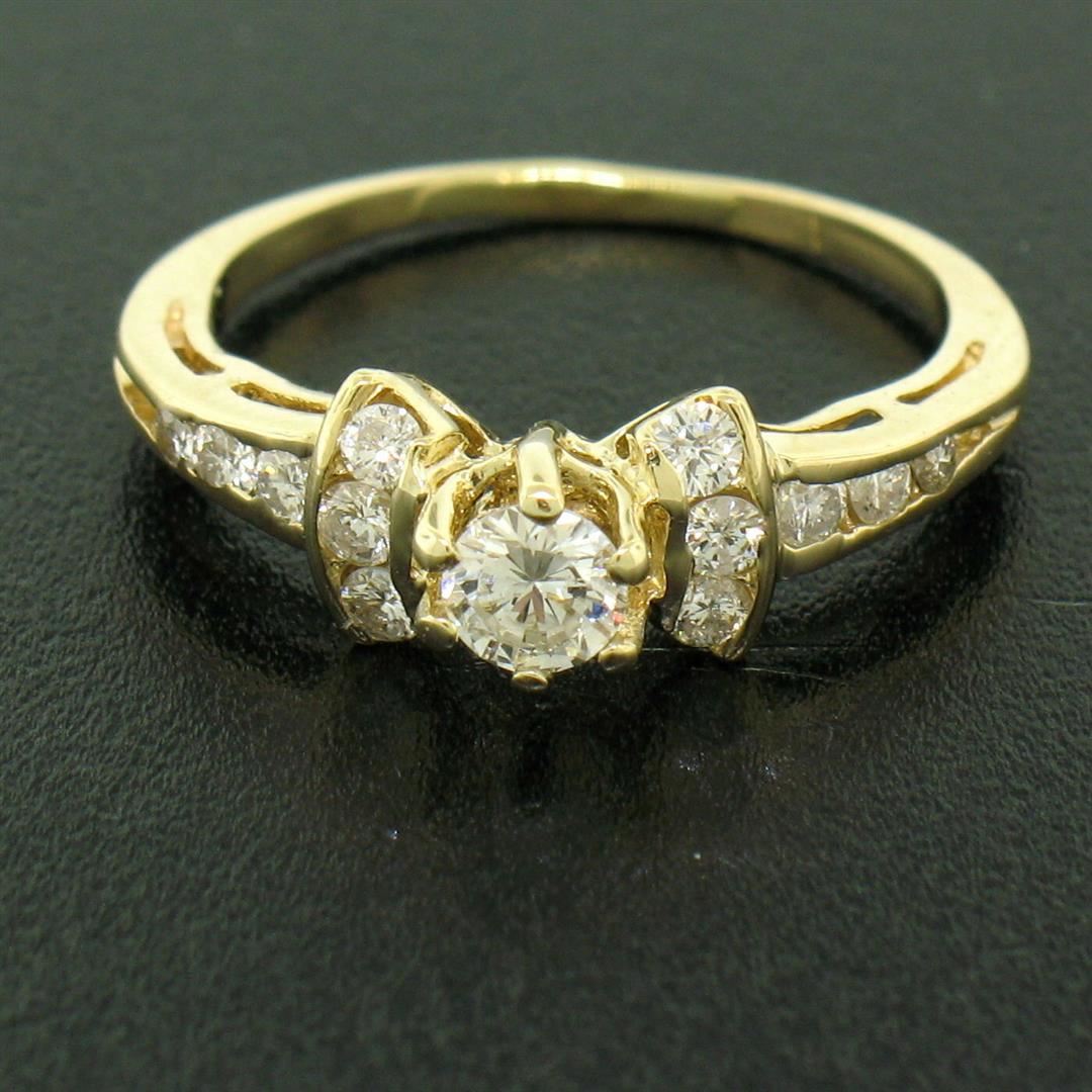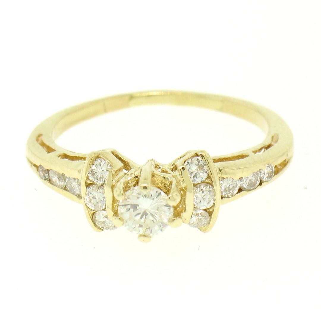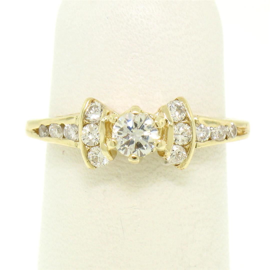 One 14k Yellow Gold Petite 0.42ctw Round Diamond Engagement Ring w/ Channel Accents. Item Details: Material: 14k Solid Yellow Gold, Weight: 1.9 Grams, Stone(s): (1) Natural Genuine Diamonds - Round Brilliant Cut - Prong Set - G/H Color - VS1/VS2 Clarity - 0.20ct (approx.), (12) Natural Genuine Diamonds - Round Brilliant Cut - Channel Set - G/H Color - VS1/VS2 Clarity - 0.22ctw (approx.), Total Carat Weight: 0.42 (approx.), Ring Size: 4.5 (We can custom size this ring.), Ring Width: 5.98mm, Ring Height: 6.41mm rise off the finger, Condition: Like New!