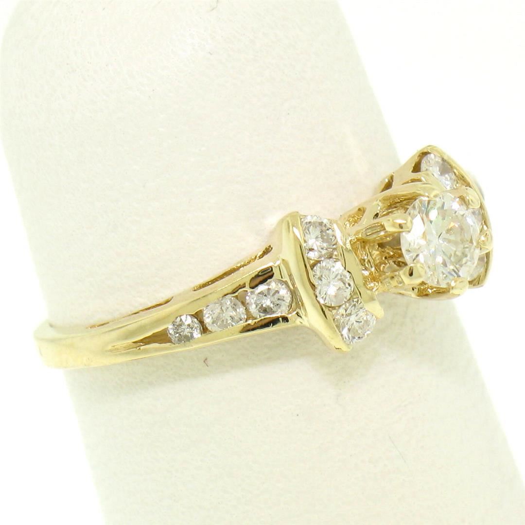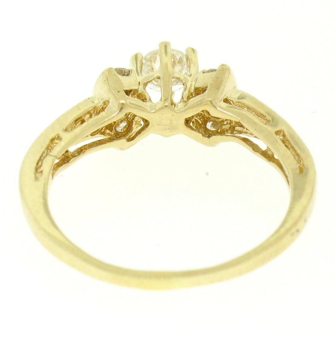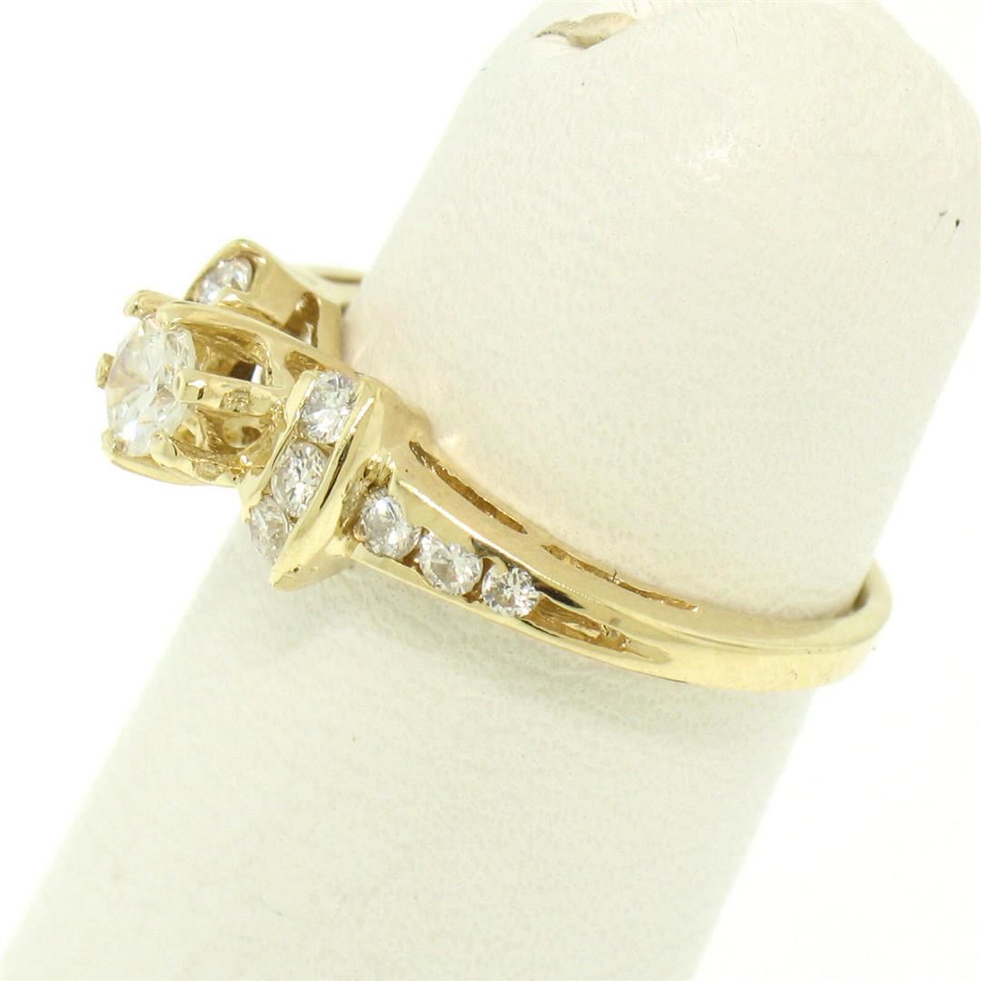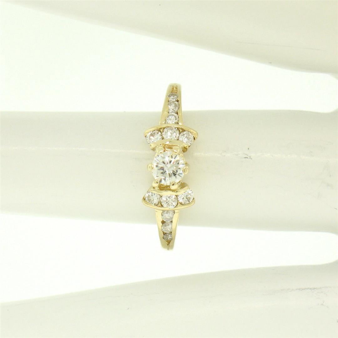 One 14k Yellow Gold Petite 0.42ctw Round Diamond Engagement Ring w/ Channel Accents. Item Details: Material: 14k Solid Yellow Gold, Weight: 1.9 Grams, Stone(s): (1) Natural Genuine Diamonds - Round Brilliant Cut - Prong Set - G/H Color - VS1/VS2 Clarity - 0.20ct (approx.), (12) Natural Genuine Diamonds - Round Brilliant Cut - Channel Set - G/H Color - VS1/VS2 Clarity - 0.22ctw (approx.), Total Carat Weight: 0.42 (approx.), Ring Size: 4.5 (We can custom size this ring.), Ring Width: 5.98mm, Ring Height: 6.41mm rise off the finger, Condition: Like New!