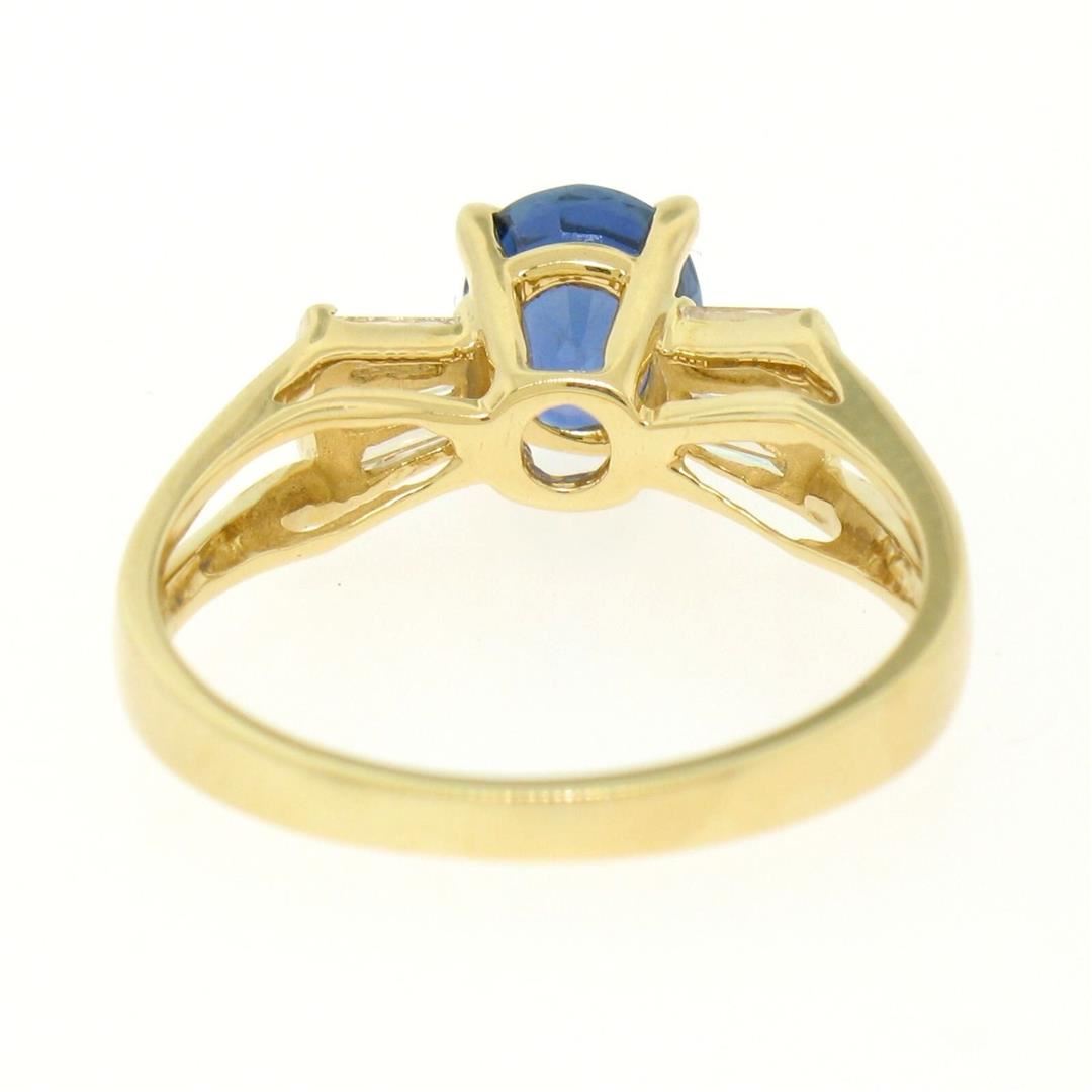 An estate solid 14k yellow gold solitaire ring, featuring 1 oval cut natural sapphire (6.77x5.65x3.82mm; 1.15ct), accented with 6 baguette cut natural diamonds (G - VS1; 0.36ctw). The ring is size 6.25, weighs a total of 2.6 grams, and measures 6.77mm wide.