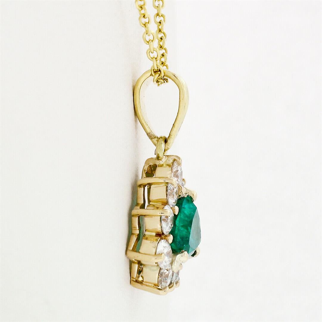 A solid 14k yellow gold Triangle pendant necklace, with 1 modified trillion cut natural emerald (0.88ct), surrounded with a halo of 10 round brilliant cut natural diamonds (G/H - VS1/VS2; 0.60ctw). 16 inch fine cable link chain, 3.46 grams total weight, pendant measures 19.1x13mm.