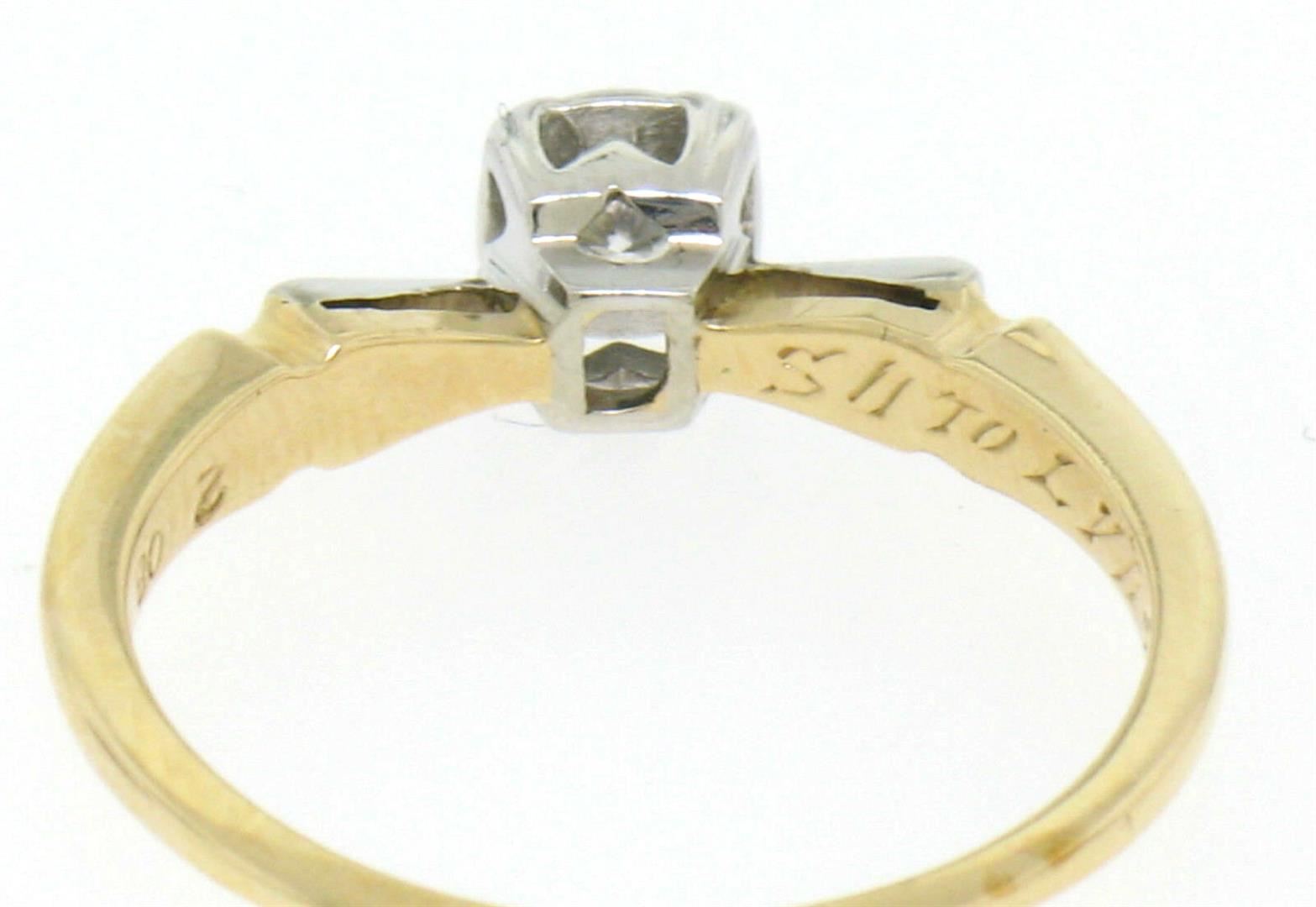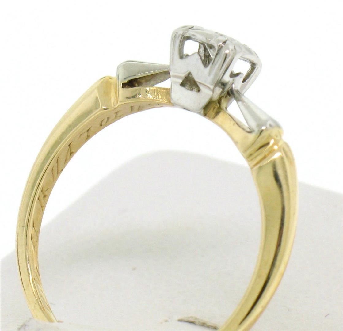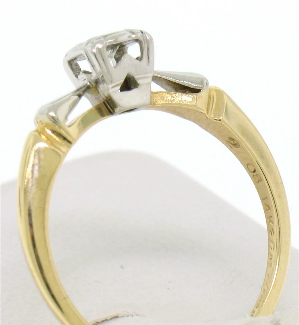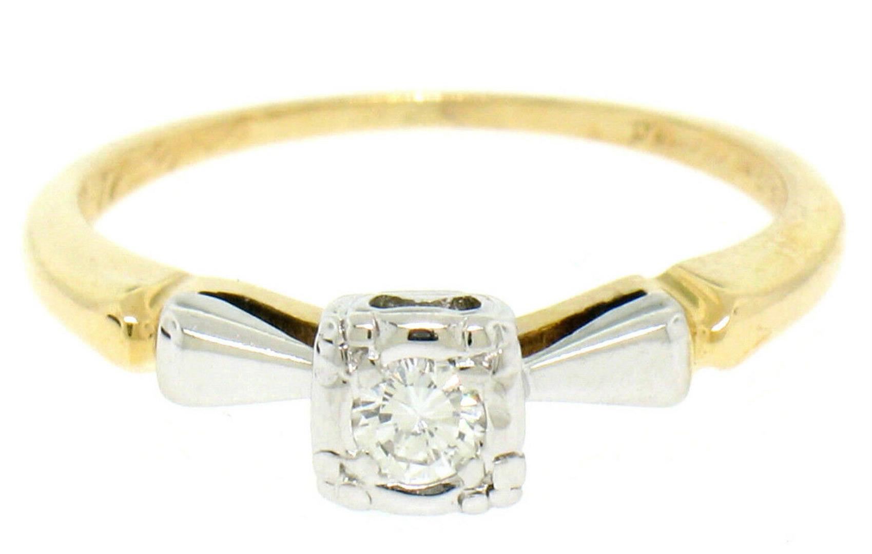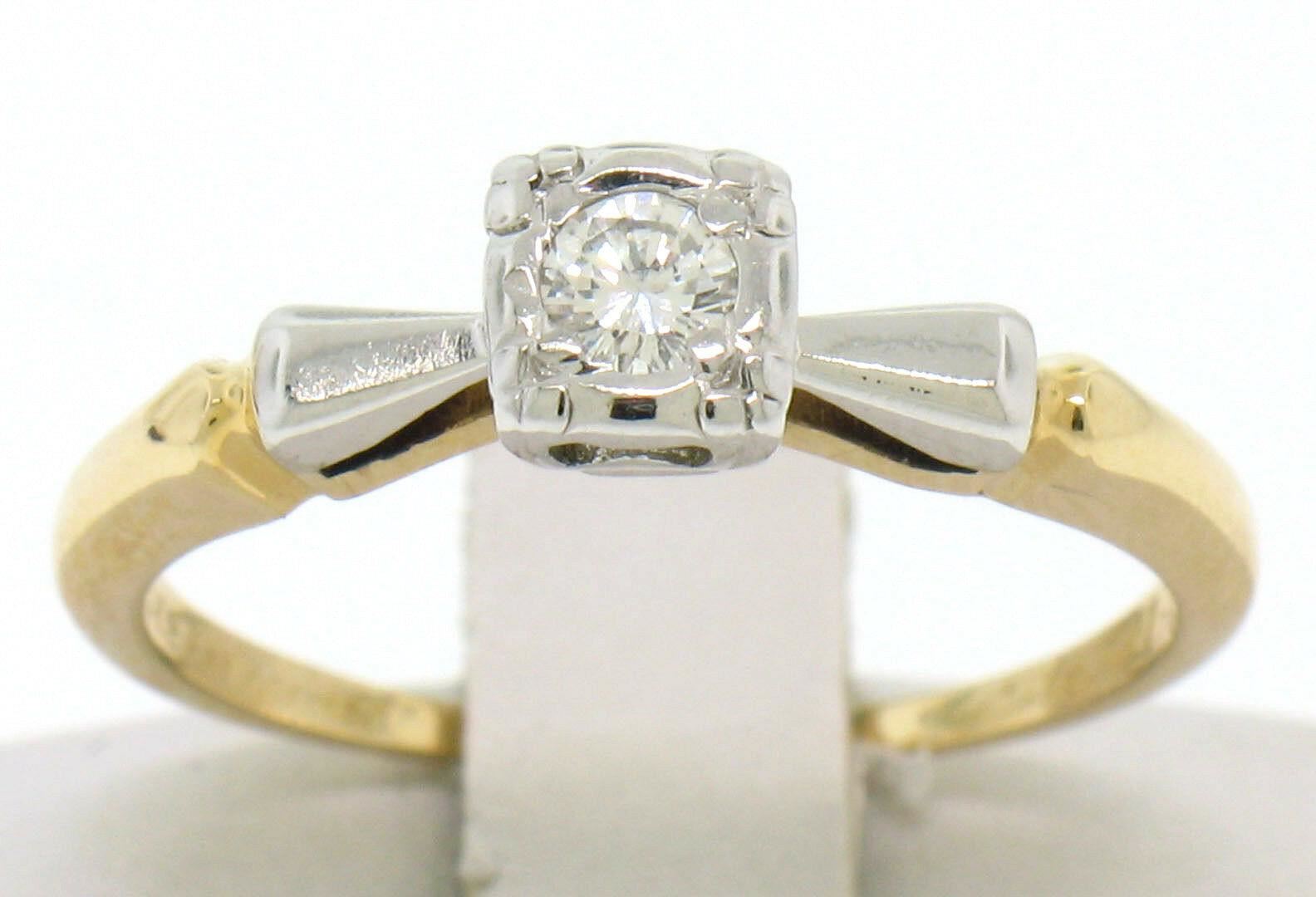 One Vintage 14k Yellow & White Gold 0.14ctw VS F Diamond Solitaire Engagement Ring. Item Details: Material: Solid 14k Yellow and White Gold, Weight: 2.10 Grams, Stone(s): (1) Natural Genuine Diamond - Round Brilliant Cut - Prong Set - F Color - VS1 Clarity, Total Carat Weight: 0.14 (approx.), Ring Size: 5.5 (We can custom size this ring.), Ring Width: 4.94mm, Condition: Vintage estate piece in excellent condition.