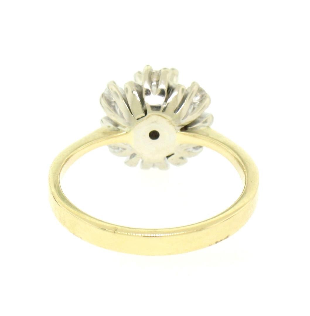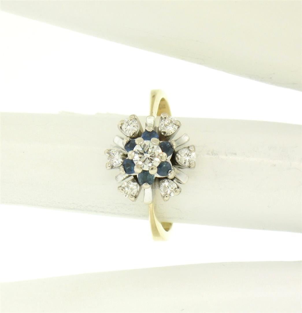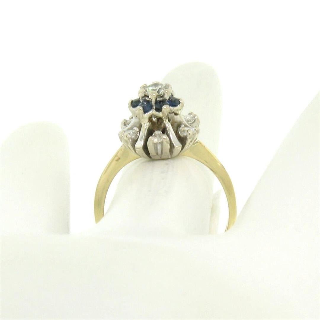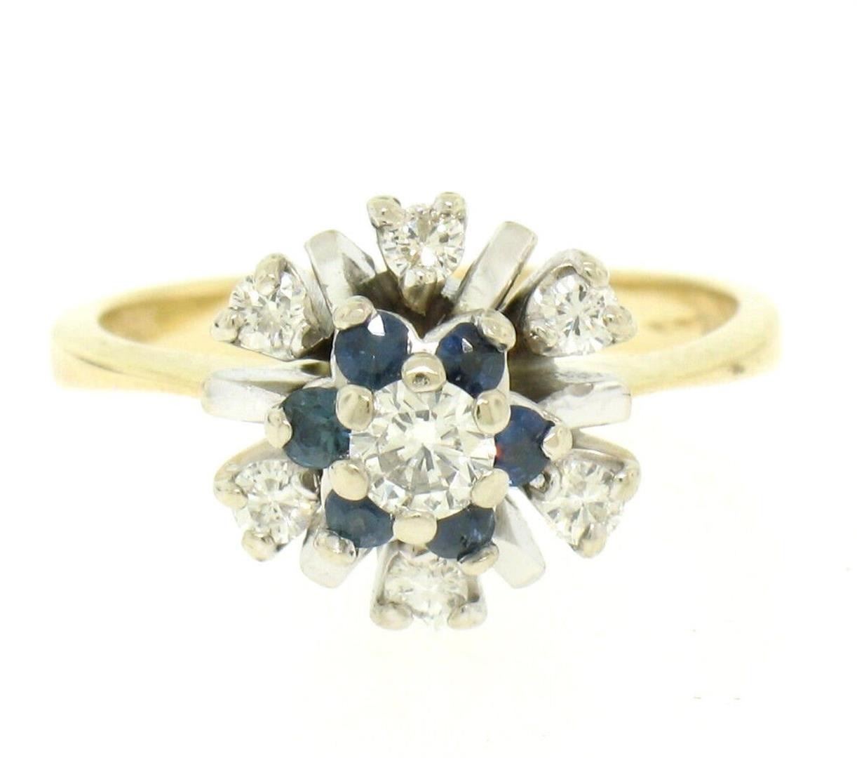 14k Yellow & White Gold 0.65ctw Diamond Sapphire 3 Tiered Starburst Cluster Ring. Please see photos and description for all available information. An estate solid 14k yellow and white gold clsuter ring, with 7 round brilliant cut natural diamonds (G/H - VS2; 0.35ctw), and 6 round brilliant cut natural sapphires (0.30ctw). The ring is size 6.5, weighs a total of 4.5 grams, and measures 11.1mm wide.
