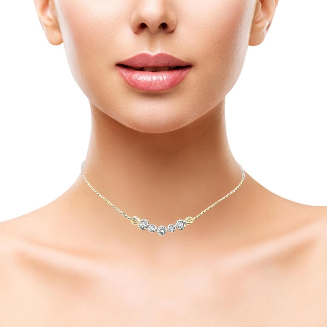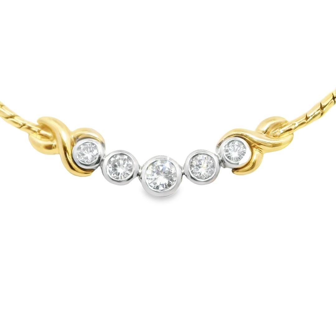 This elegant 14KT yellow and white gold necklace features a half-round wheat link chain measuring 17.5 inches. The centerpiece consists of five bezel-set round brilliant-cut diamonds, including a central diamond weighing 0.36ct, flanked by additional diamonds totaling 1.03ct. The combination of polished metals and well-matched stones creates a balanced and refined design.