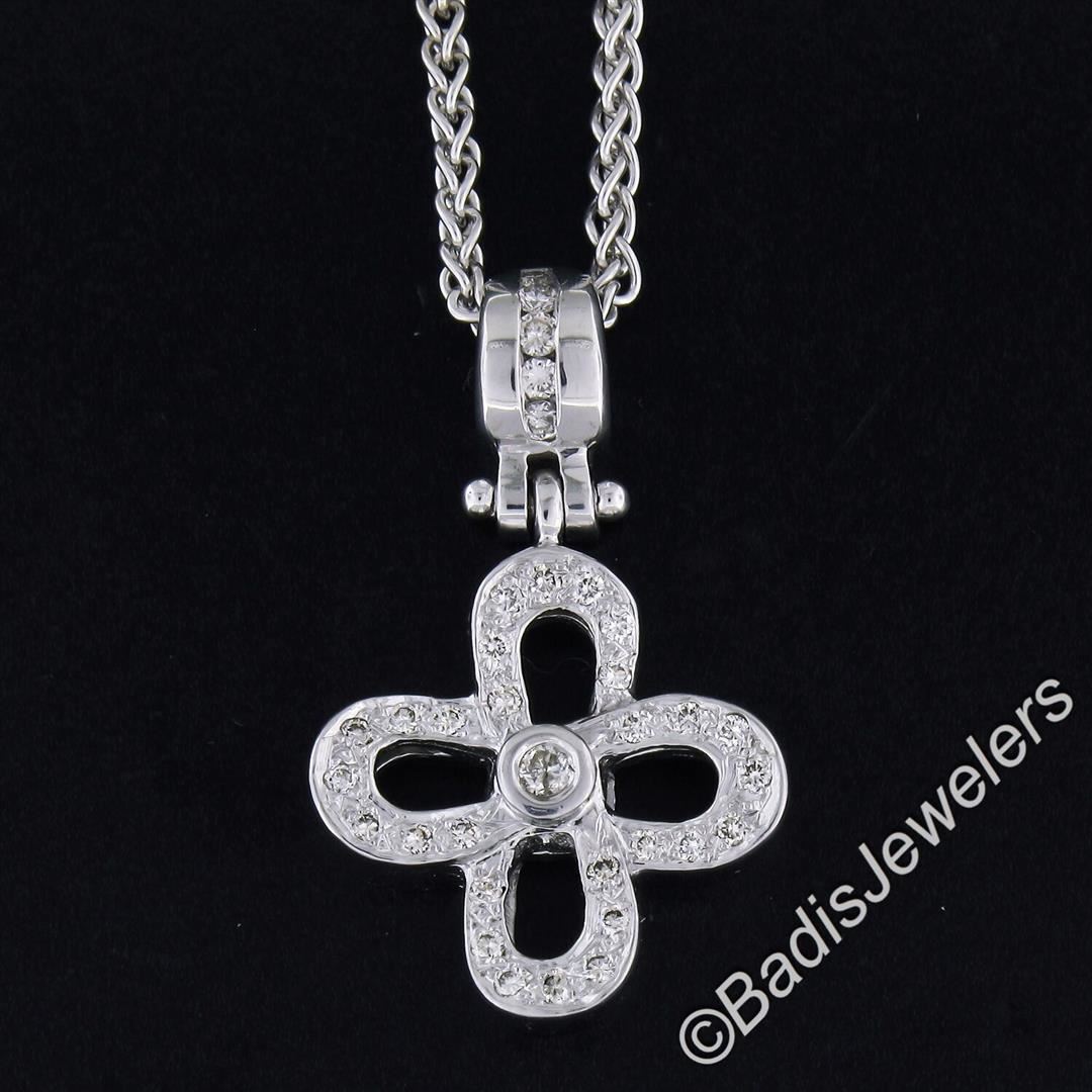 A like new 14kt white gold pendant necklace set with 0.44ctw of round diamonds (F/G - VS1/VS2). 16 inch wheat link chain, 12.82 grams total weight, measures 30.7x19.0mm.