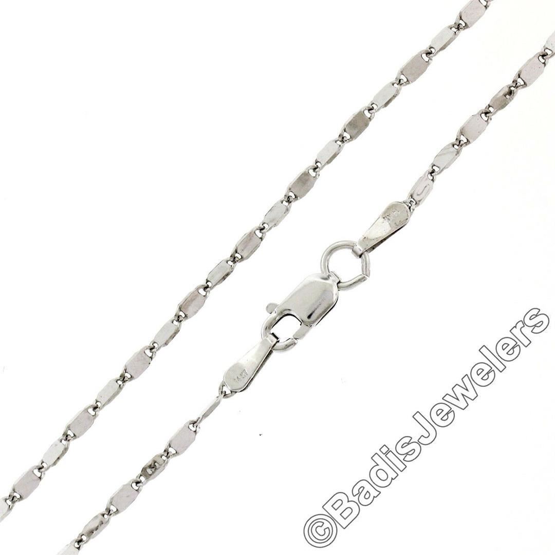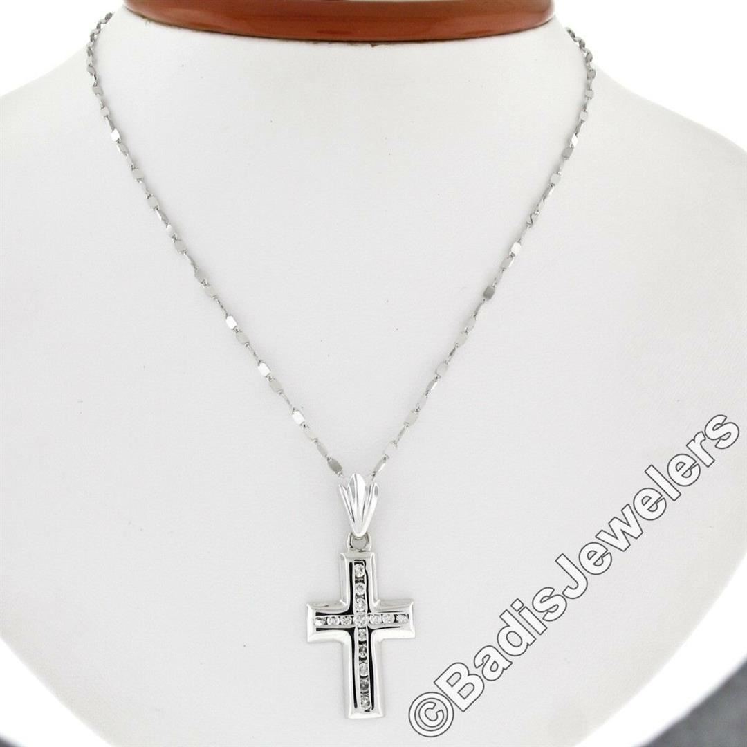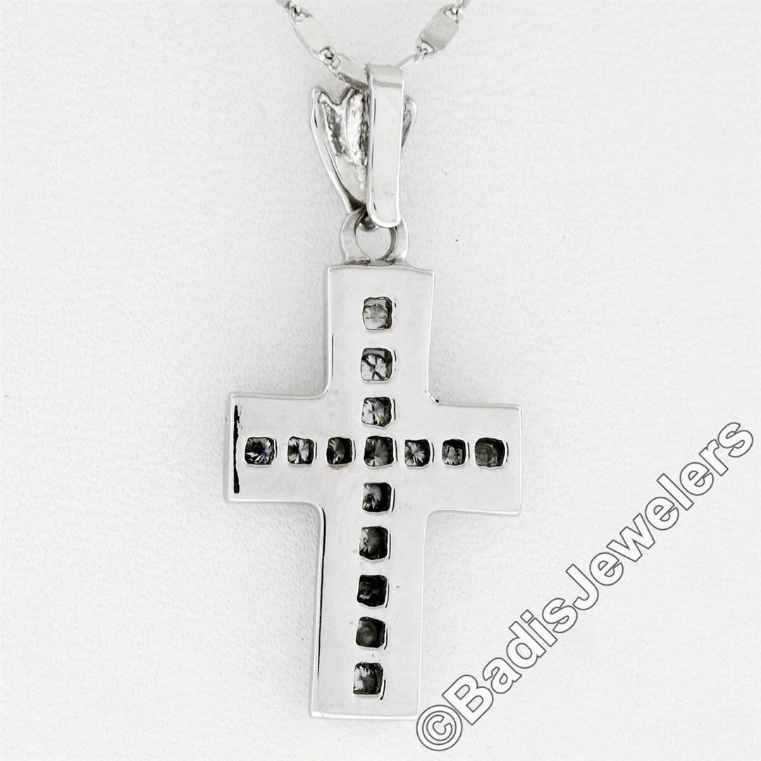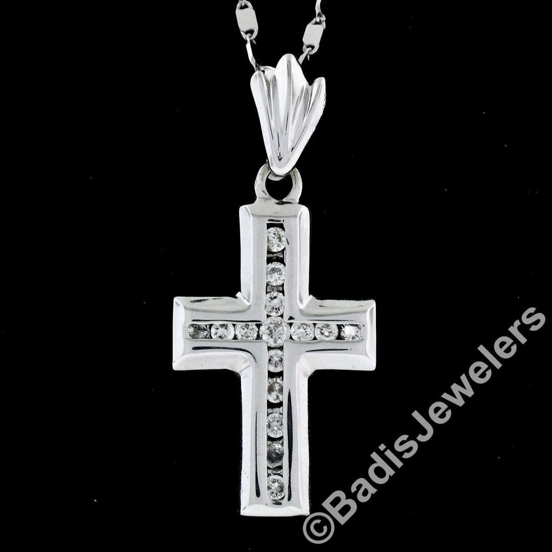 A 14kt white gold cross pendant necklace featuring 15 channel set round brilliant diamonds (H/I - SI2/I1; 0.60ctw). 16 inch fancy flat bar link chain, 9.30 grams total weight, pendant measures 38.0x17.0mm.
