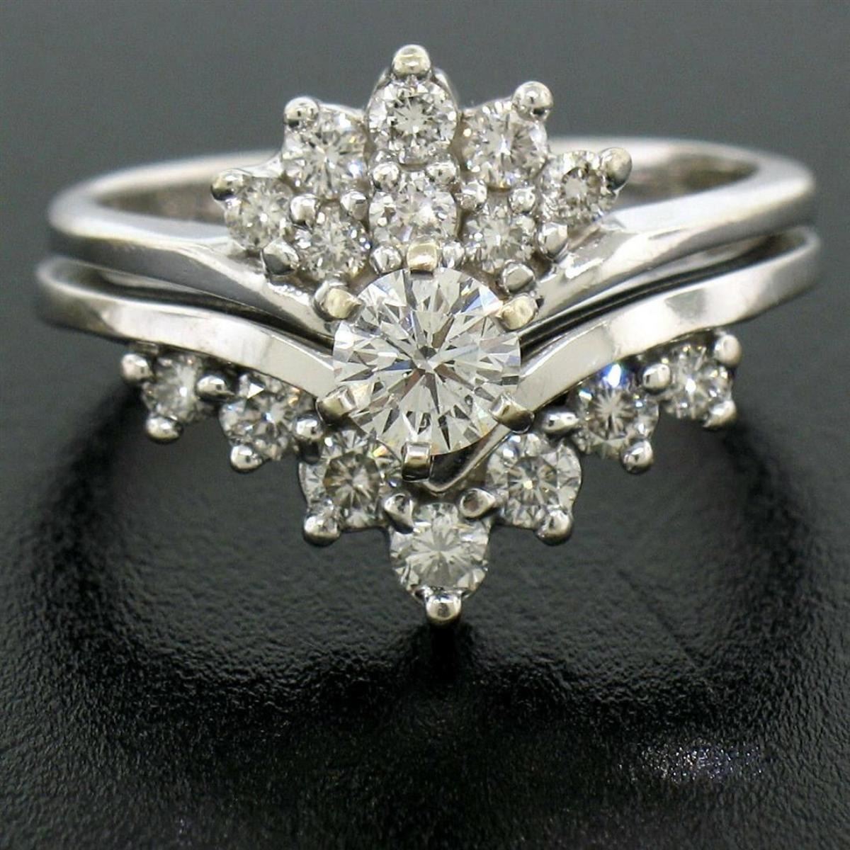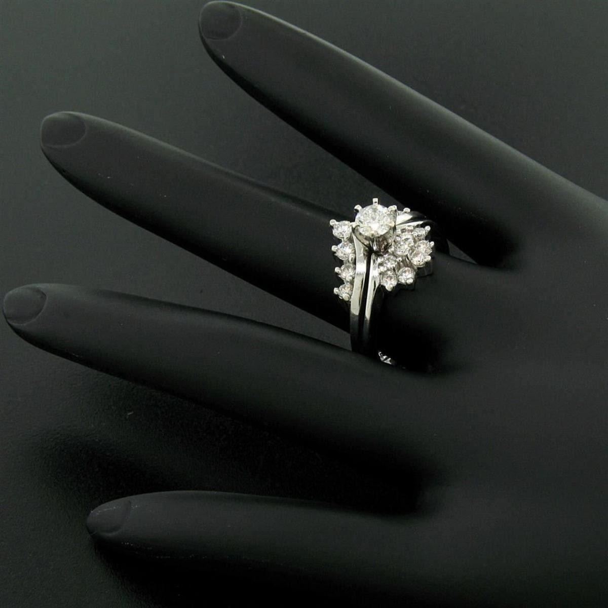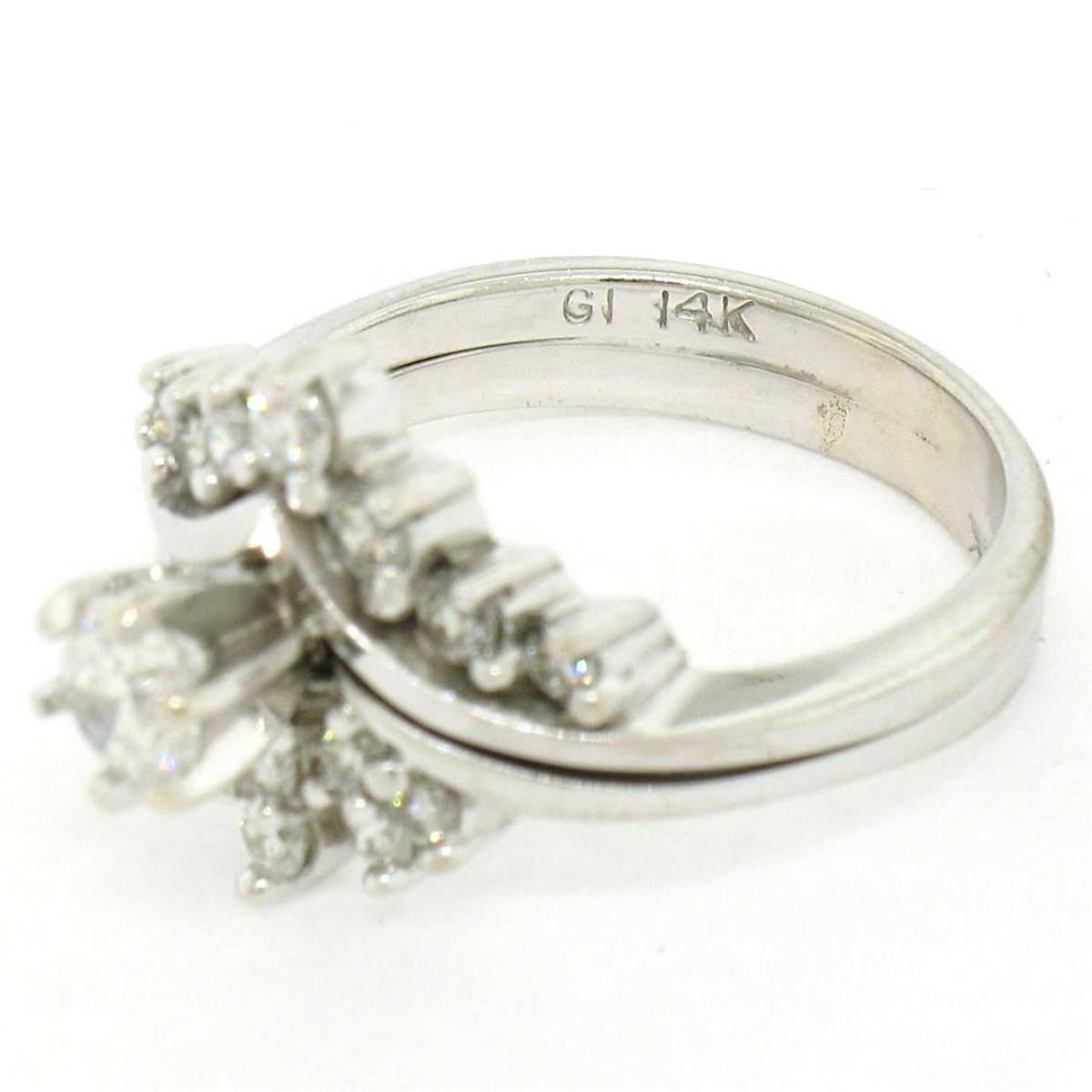 A 14kt white gold cluster ring featuring a 0.40ct round brilliant diamond (G - VS2) prong set at its center among 0.60ctw of smaller round brilliant diamonds (F/G - VS1/VS2). The ring is size 7.0, weighs a total of 6.41 grams, and measures 14.68mm wide.