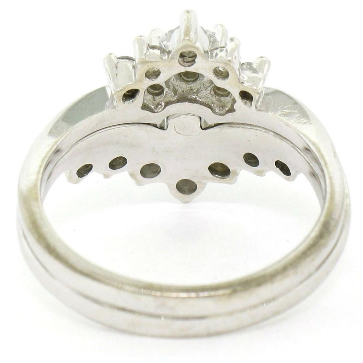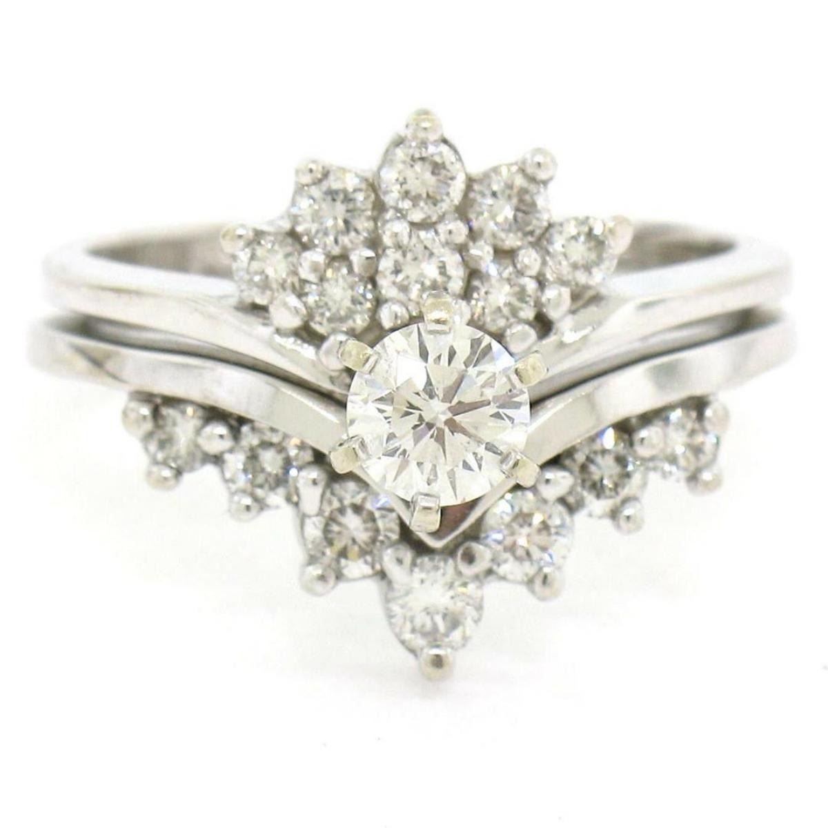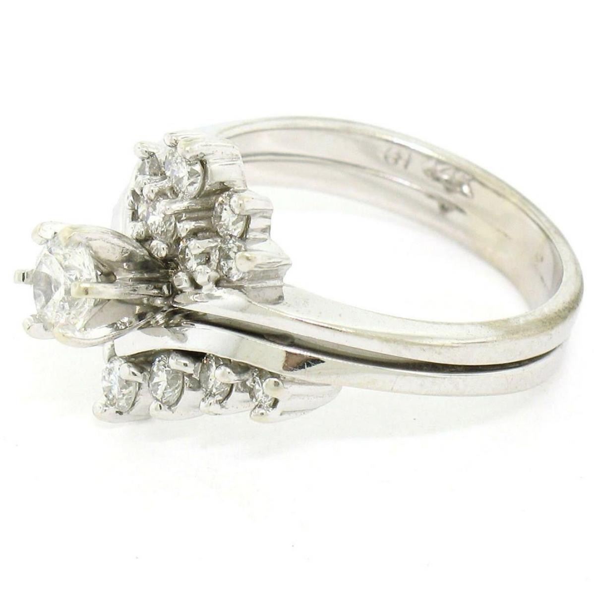 A 14kt white gold cluster ring featuring a 0.40ct round brilliant diamond (G - VS2) prong set at its center among 0.60ctw of smaller round brilliant diamonds (F/G - VS1/VS2). The ring is size 7.0, weighs a total of 6.41 grams, and measures 14.68mm wide.