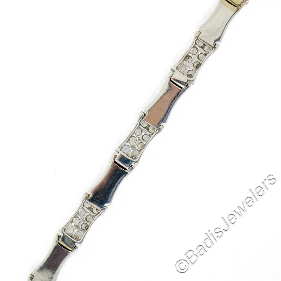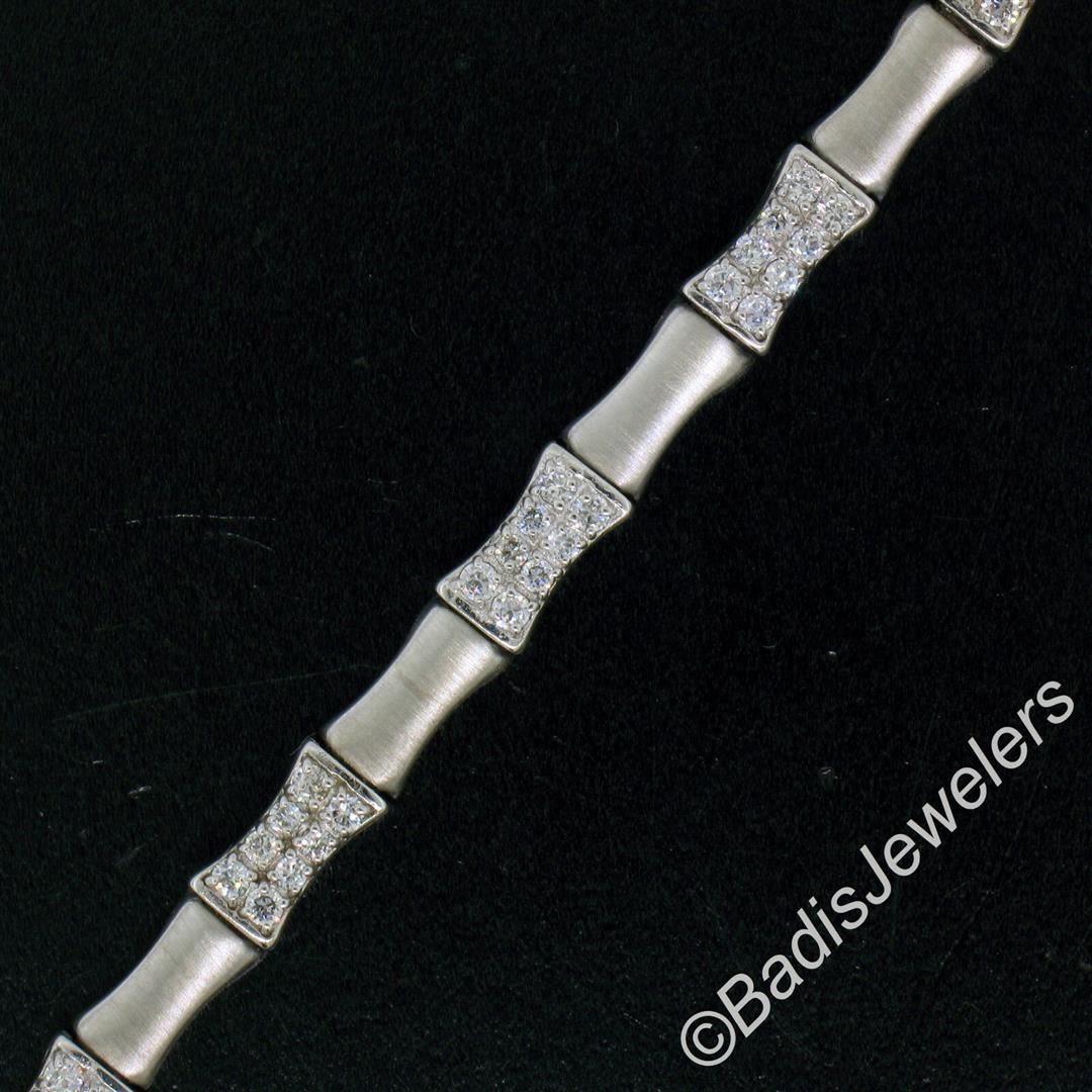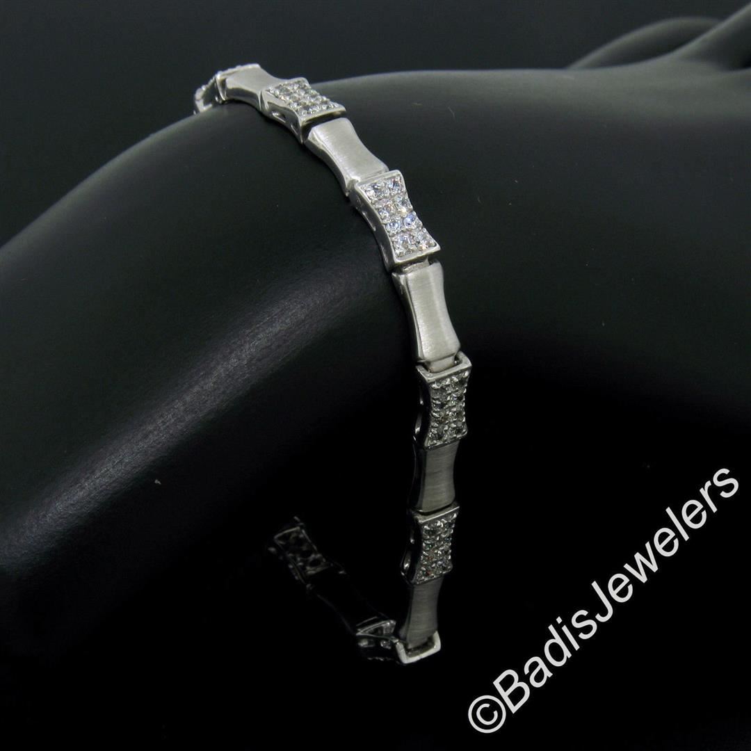 A like new 14kt white gold chain bracelet with 1.20ctw of round diamonds (F/G - VS1/VS2) set into stations which alternate with finely brushed concave links. It weighs a total of 10.71 grams, measures 5.0mm wide, and measures 7.5 inches long.