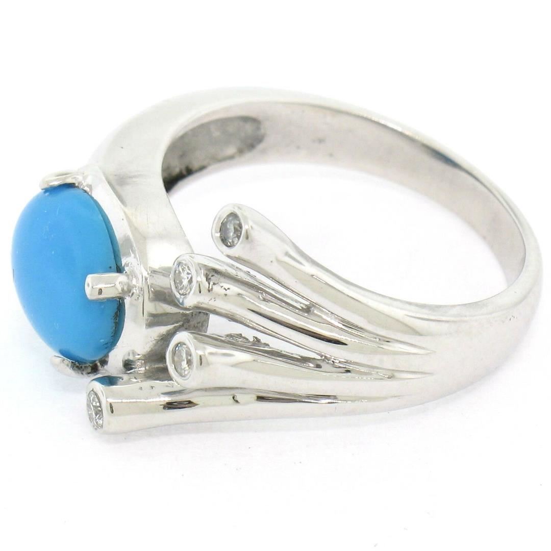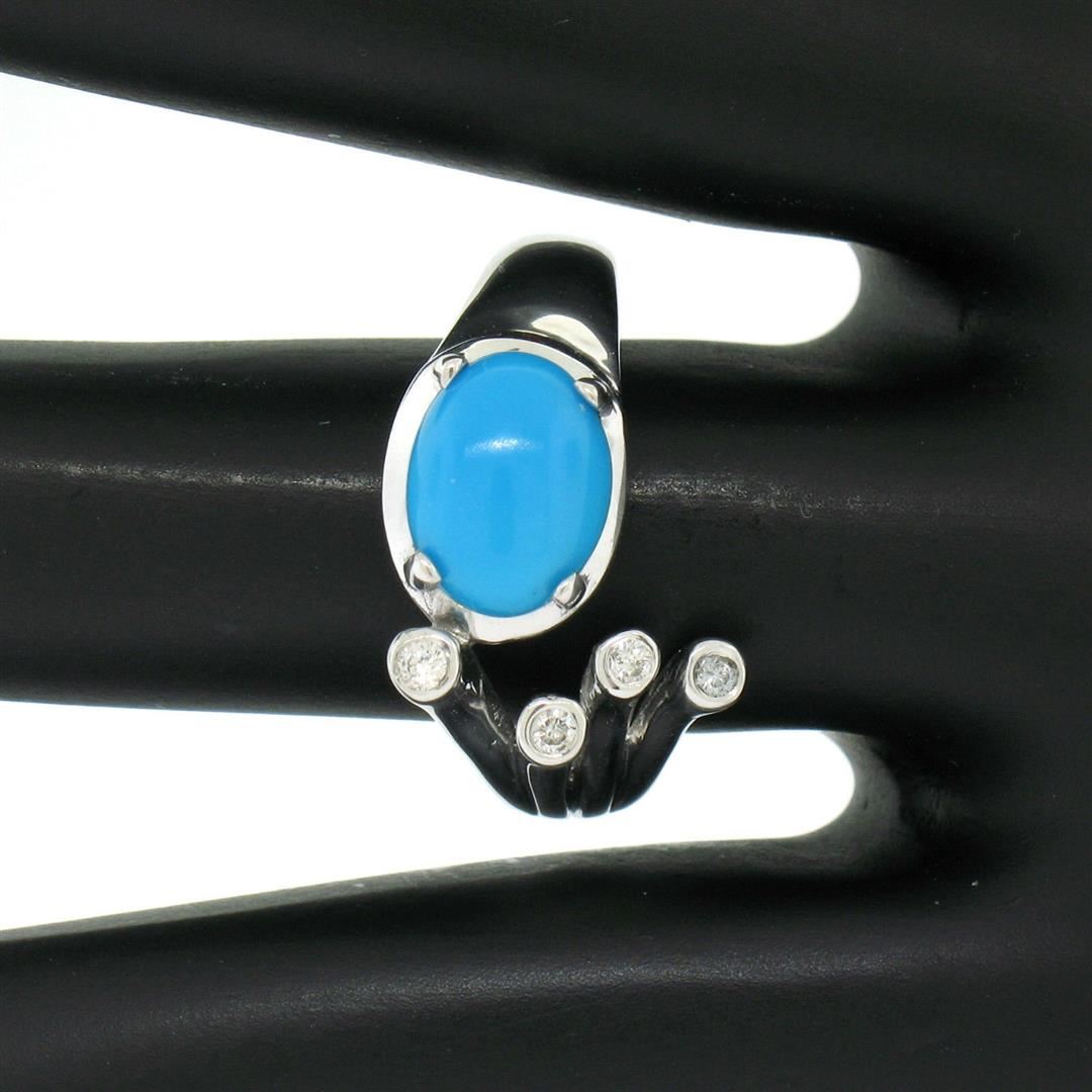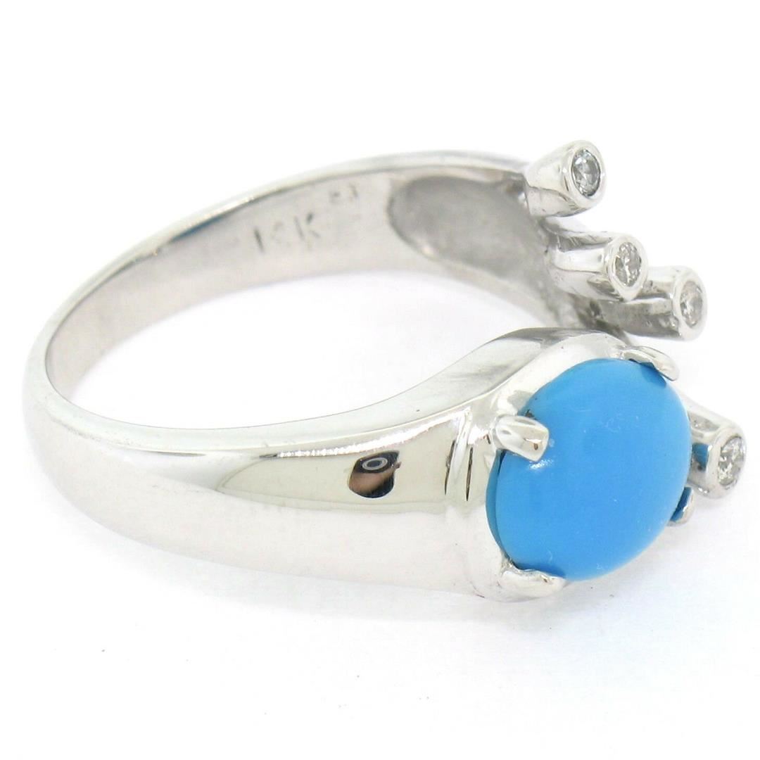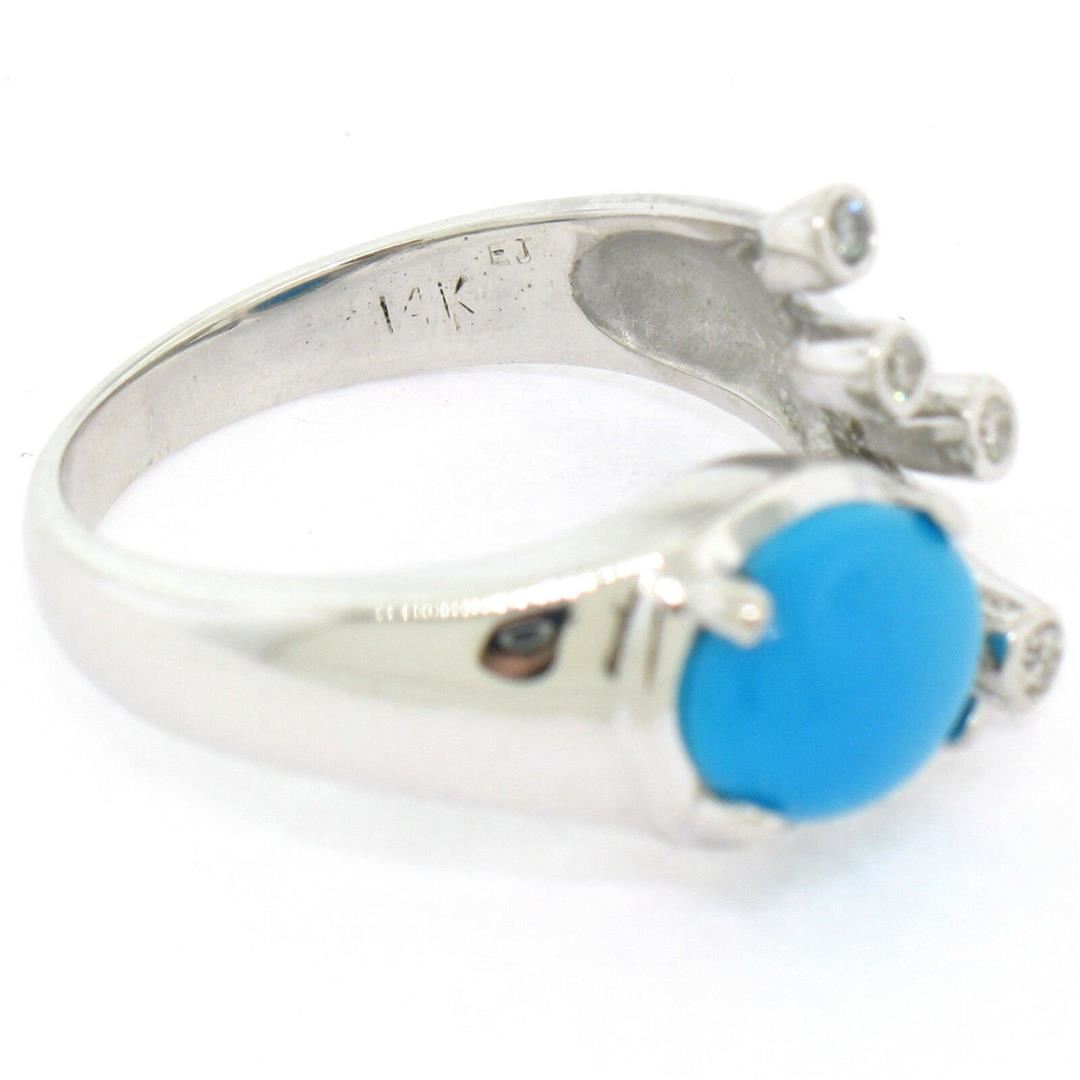 A 14kt white gold cocktail ring prong set with a 1.13ct oval cabochon turquoise accented by 4 round brilliant diamonds (G - VS2) totaling approximately 0.10ctw. The ring is size 6.0, weighs a total of 5.68 grams, and measures 12.35mm wide.
