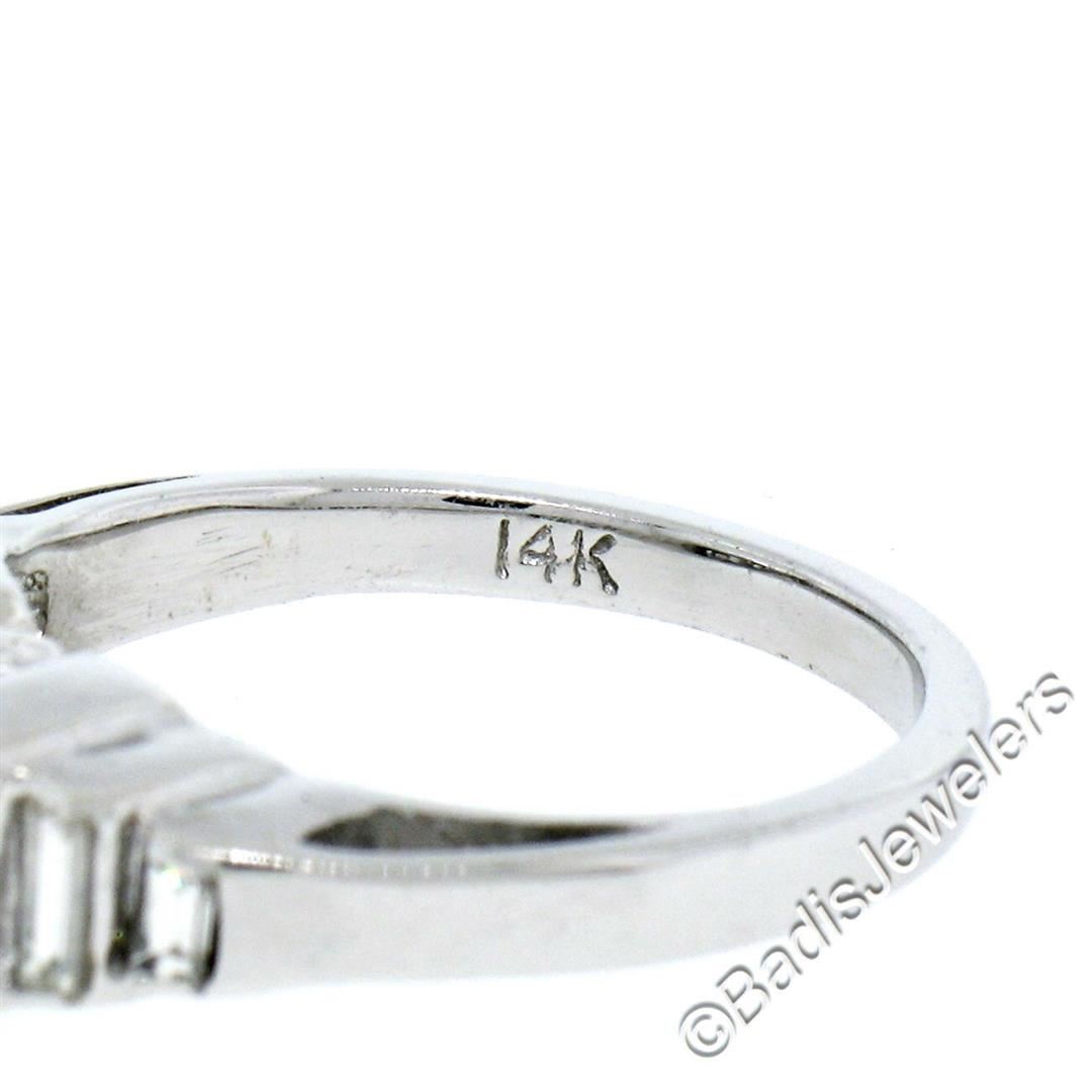 A 14kt white gold step ring with a 0.73ct oval emerald accented by 0.60ctw of baguette cut diamonds (F/G - VVS2/VS1). The ring is size 6.0, weighs a total of 4.95 grams, and measures 7.75mm wide.