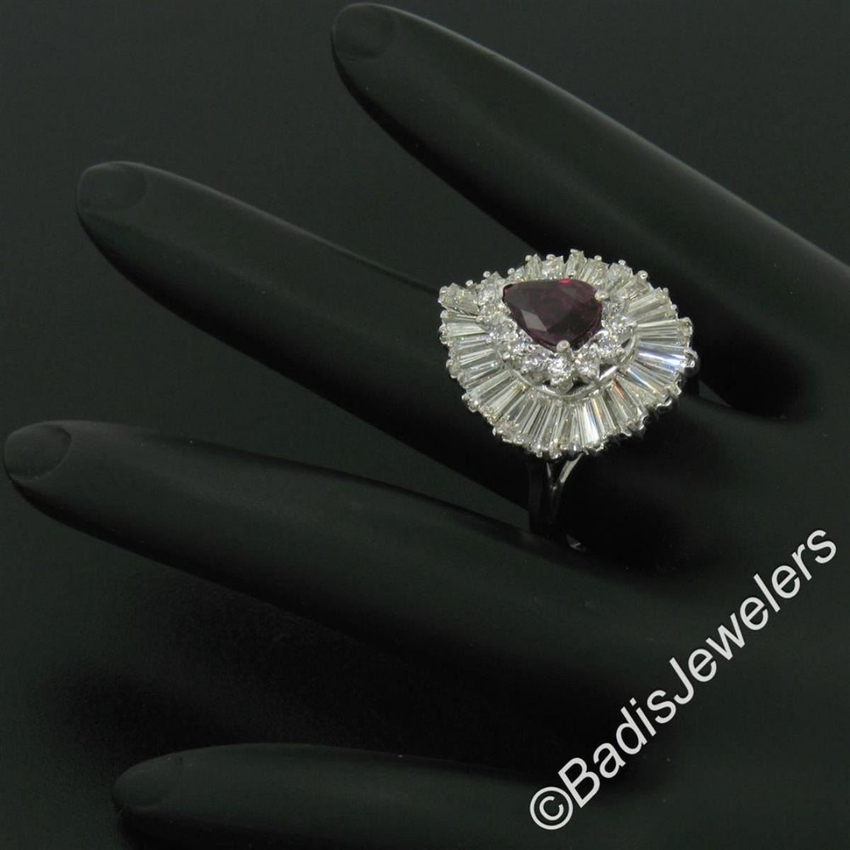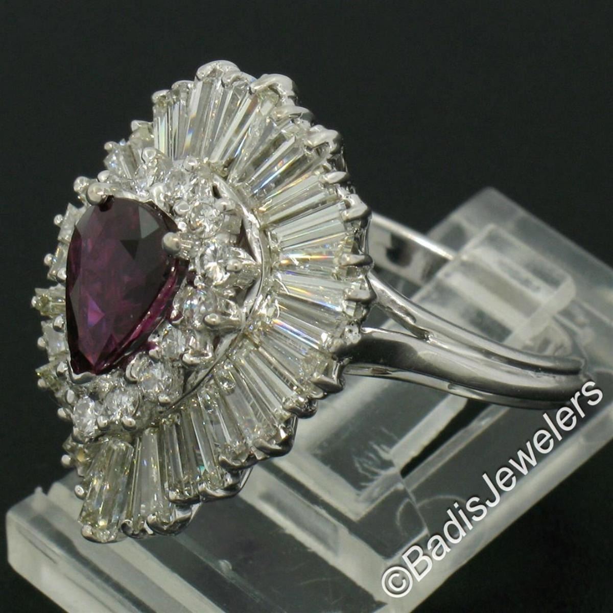 An excellent condition vintage 14kt white gold ring with a 1.35ct pear cut ruby surrounded by 4.05ctw of round and baguette cut diamonds (F to I - VVS1 to VS1). The ring is size 6.5, weighs a total of 7.83 grams, and the top measures approximately 24.15mm long.