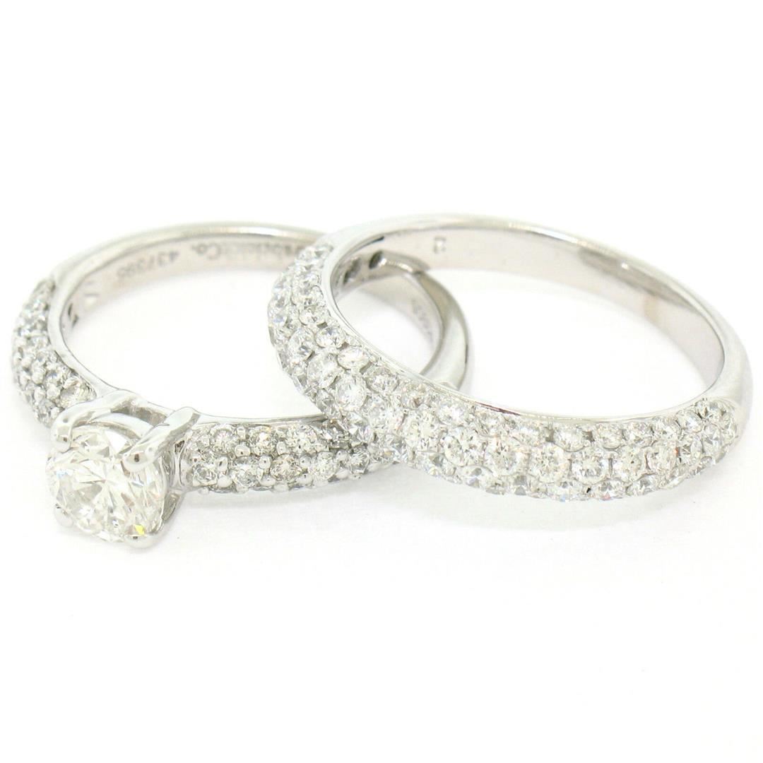 A 14kt white gold 2.39ctw round diamond (F/G - VS1 to SI1) engagement ring and wedding band set by Gabriel & Co. The set is a size 8.0, weighs a total of 5.76 grams, and measures approximately 7.5mm wide.