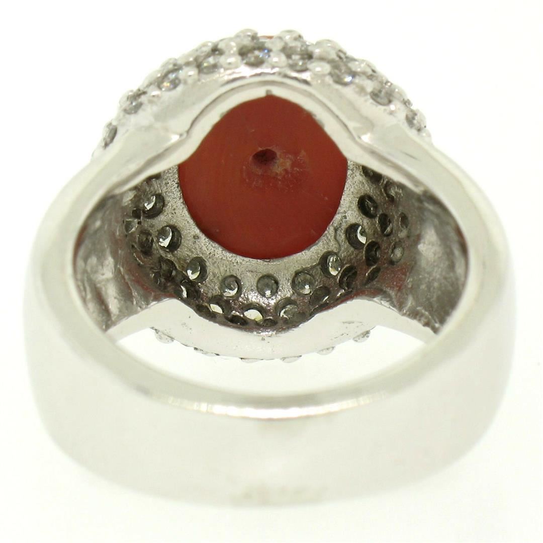 A 14kt white gold ring with an 11.4x9.2mm oval cabochon red coral with 2.10ctw of round diamonds (F - VS1/VS2). The ring is size 6.0, weighs a total of 12.1 grams, and measures 16.5mm wide.