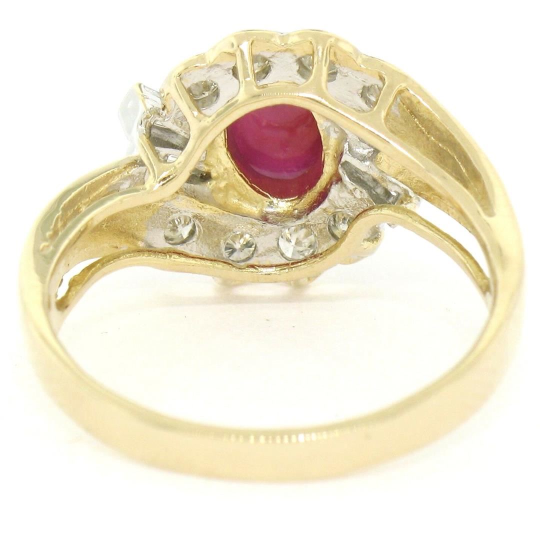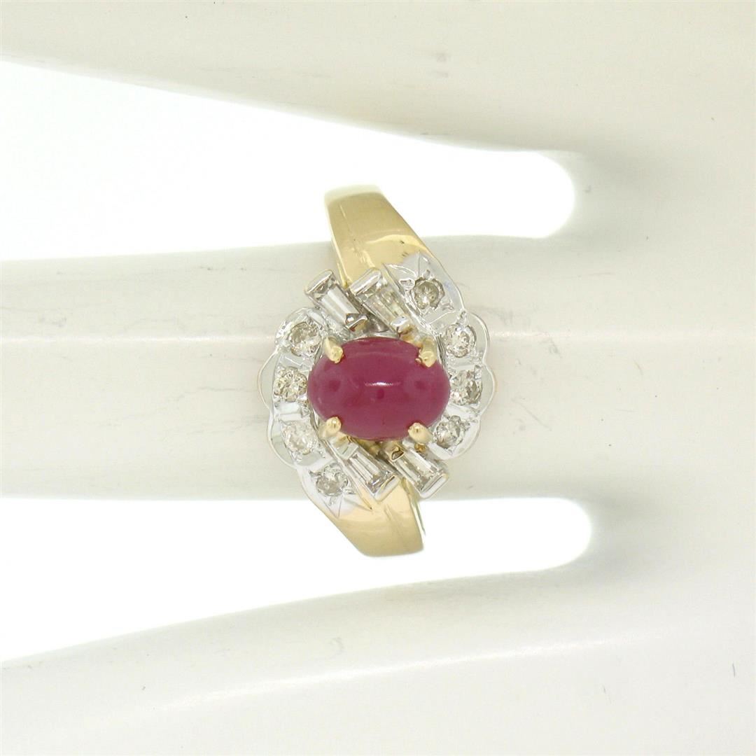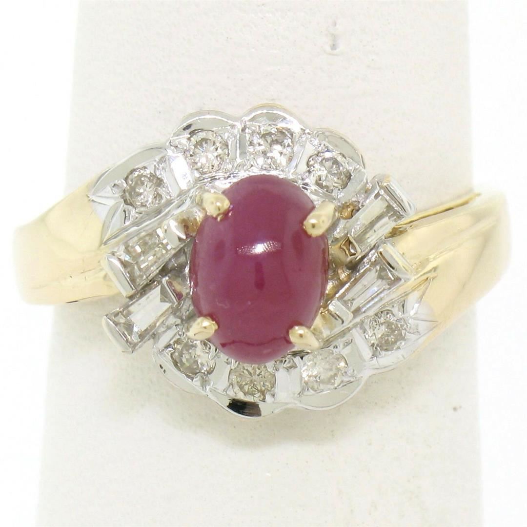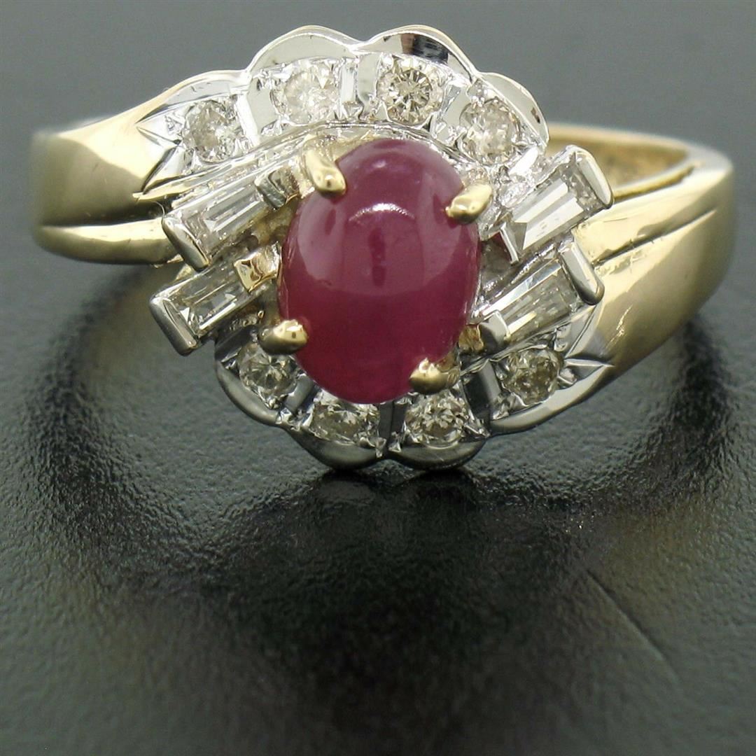 A 14kt white and yellow gold ring featuring a 1.26ct oval cabochon ruby prong set among 0.36ctw of baguette and round diamonds (H to J - VS2/SI1). The ring is size 6.0, weighs a total of 3.65 grams, and measures 12.0mm wide.