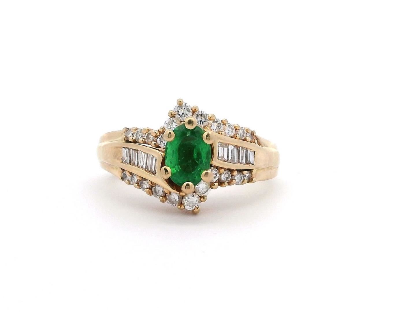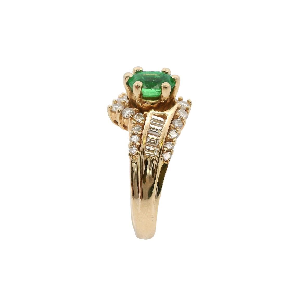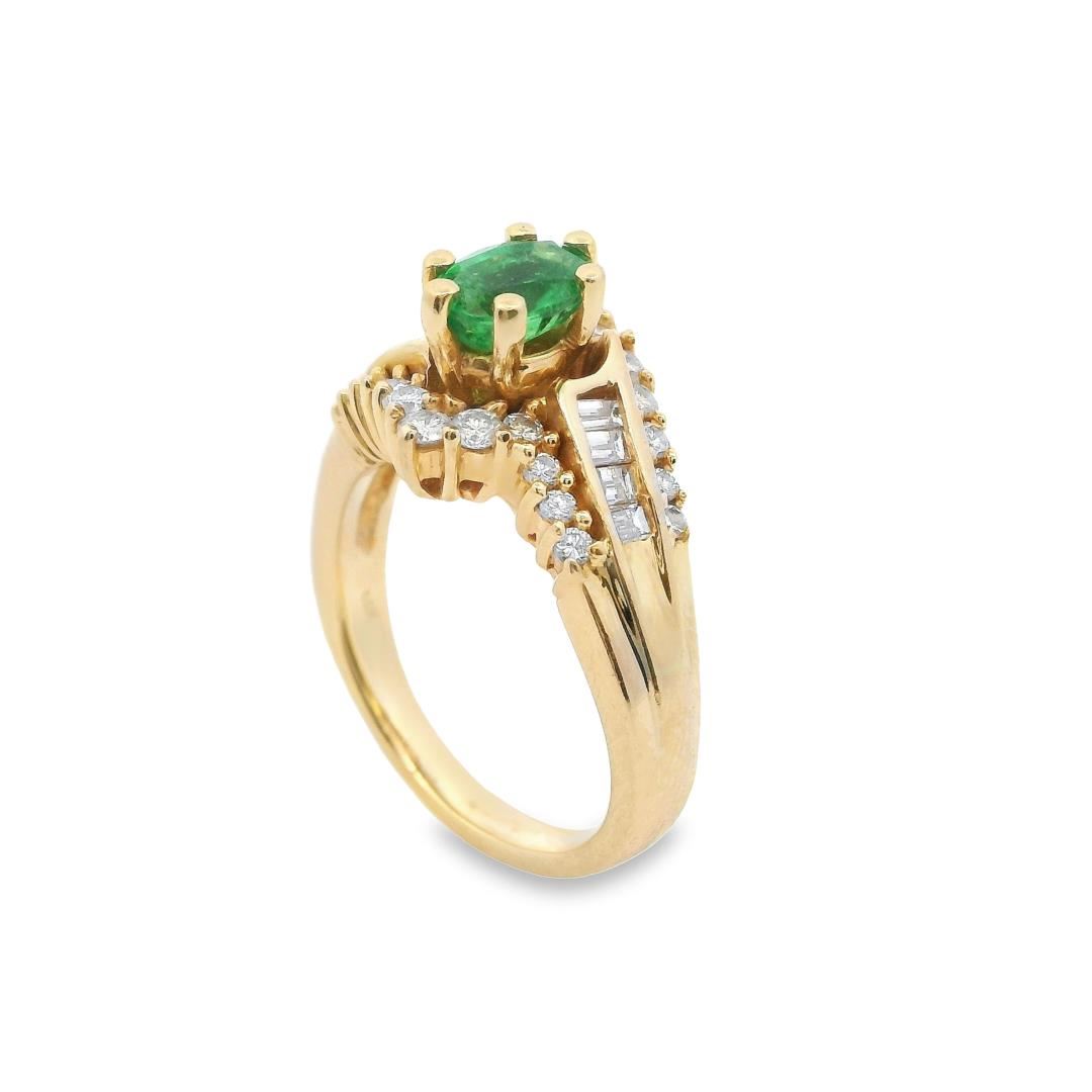 This 14KT yellow gold bypass ring showcases an oval modified brilliant-cut natural emerald weighing 0.70ct, displaying a medium green color with slight inclusions. Flanking the emerald are twenty-two round brilliant-cut diamonds totaling 0.33ct and eight channel-set baguette-cut diamonds weighing 0.28ct. The wire basket motif and polished finish highlight its sophisticated craftsmanship.