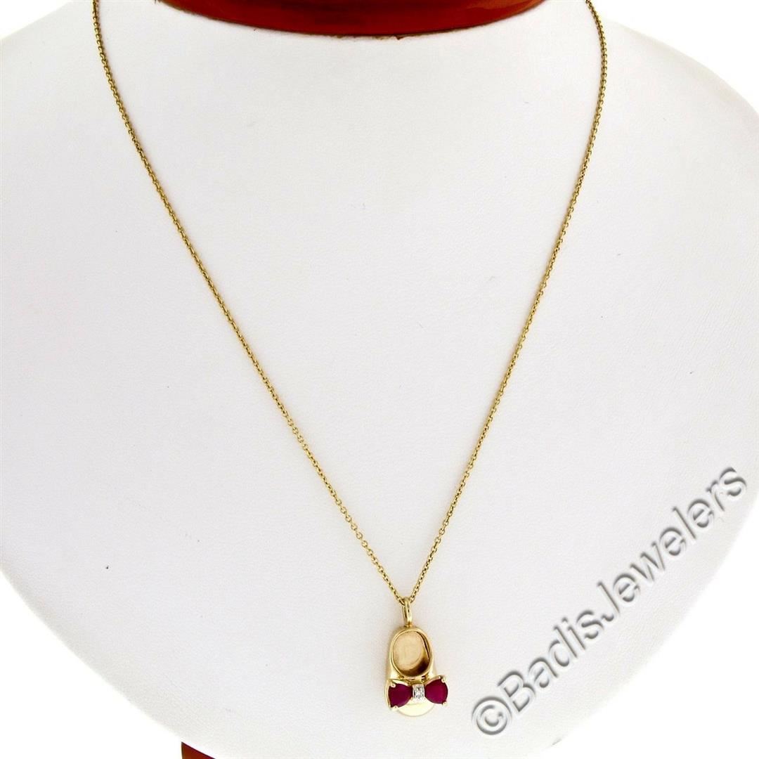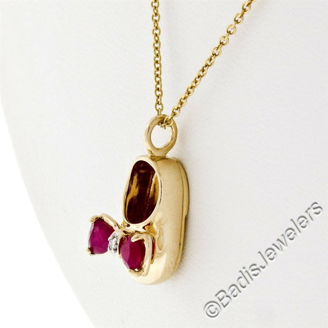 A 14kt yellow gold baby shoe pendant with 0.32ctw of trillion cut rubies and a 1pt round diamond (F - SI1). 16 inch fine cable link chain, 4.34 grams total weight, measures 19.95x10.60mm.
