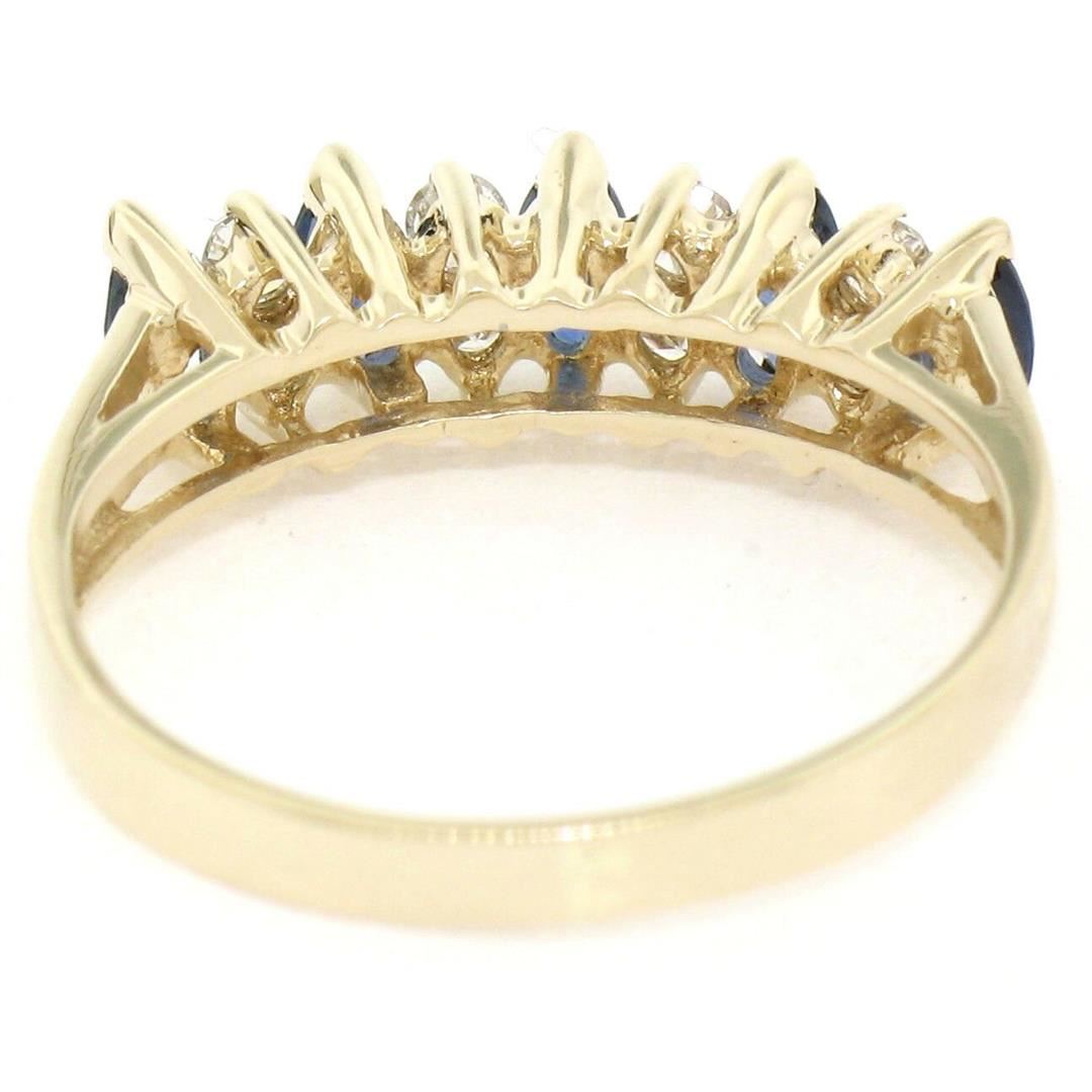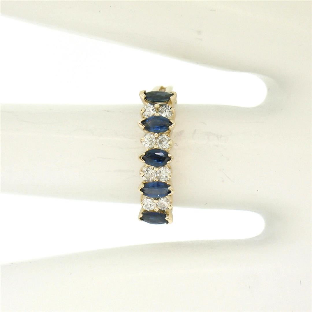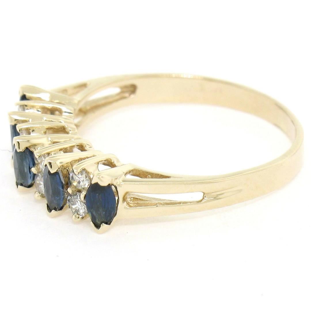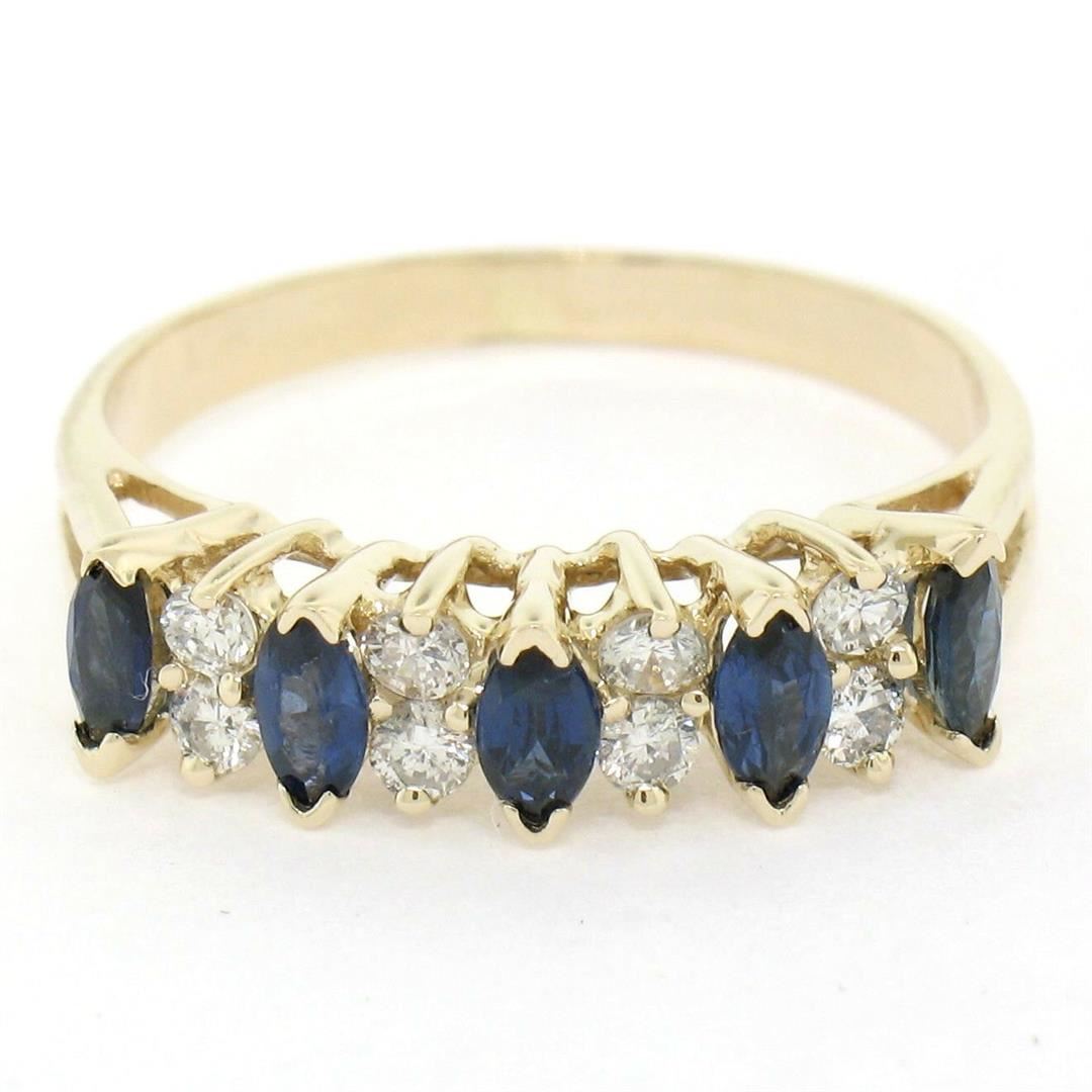A 14kt yellow gold band ring featuring 0.70ctw of marquise cut sapphires accented by 0.28ctw of round brilliant diamonds (G/H - VS2/SI1). The ring is size 5.75, weighs a total of 2.09 grams, and measures 4.83mm wide.