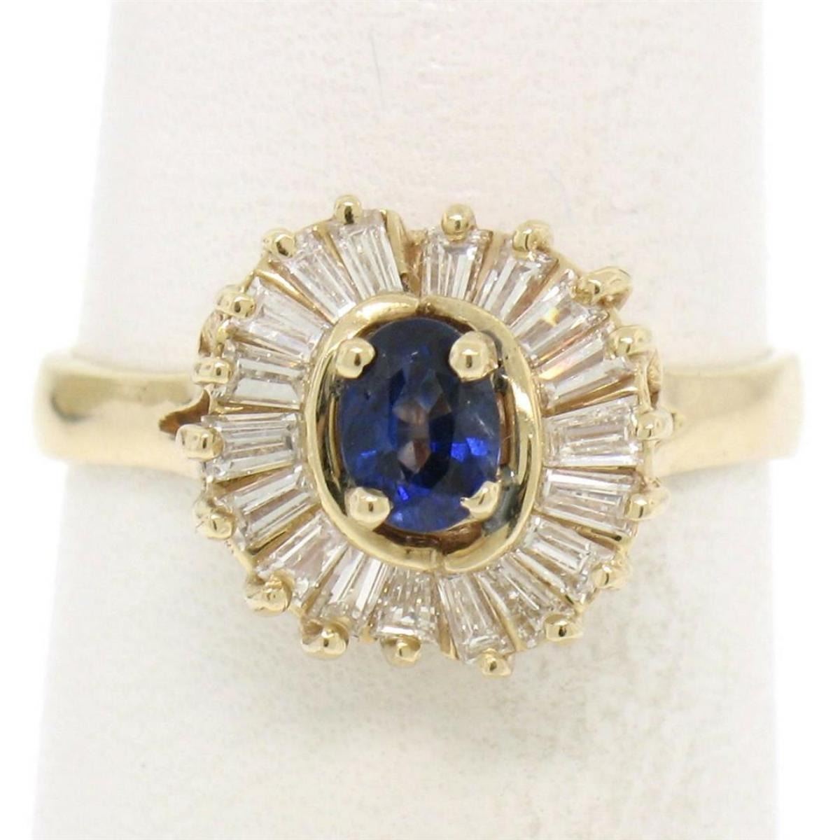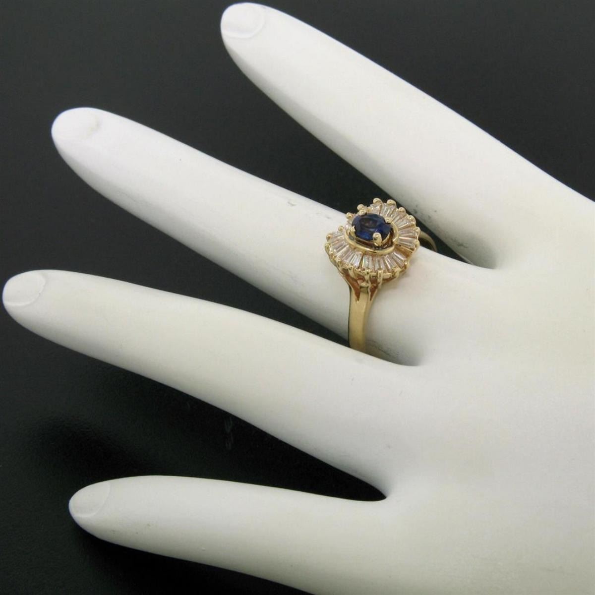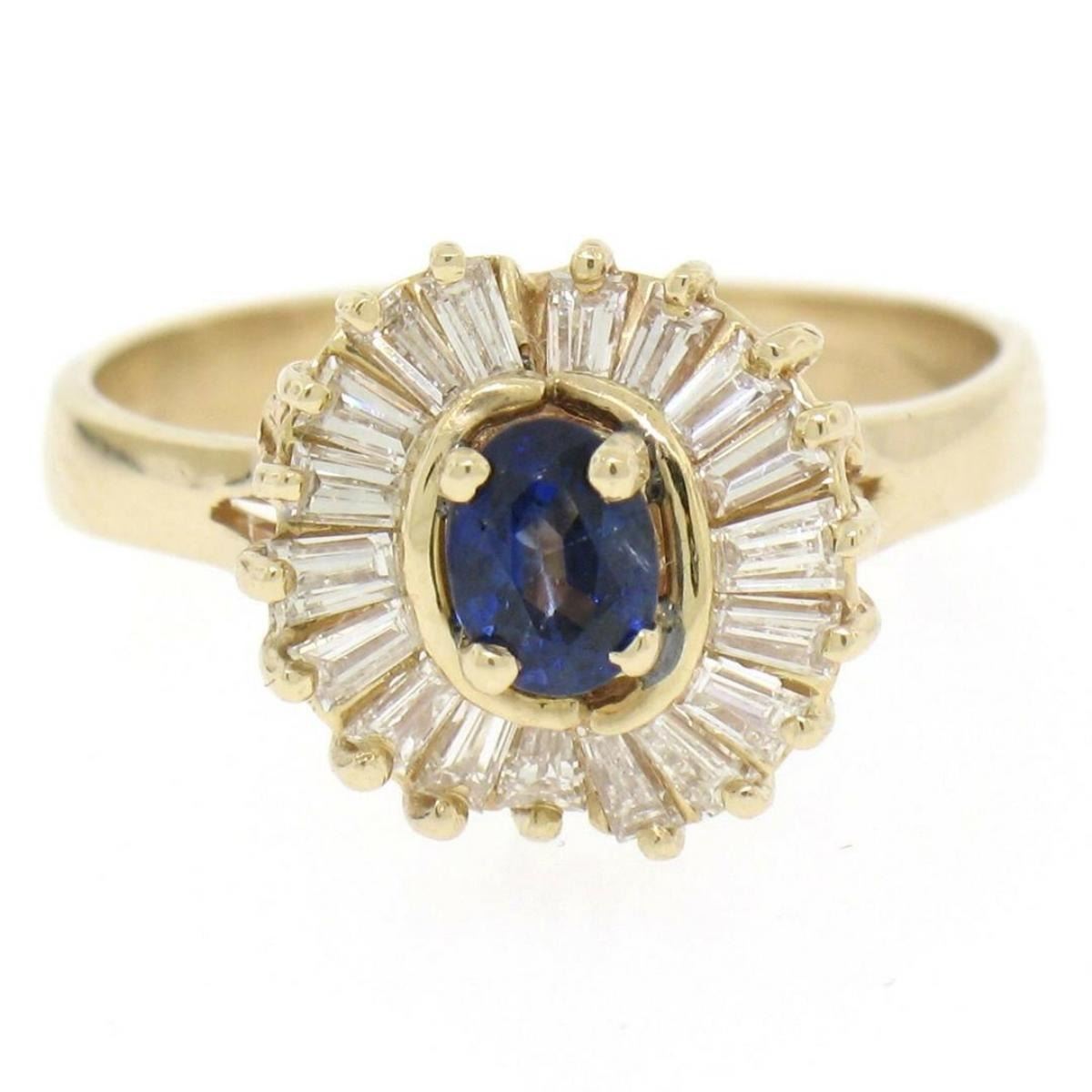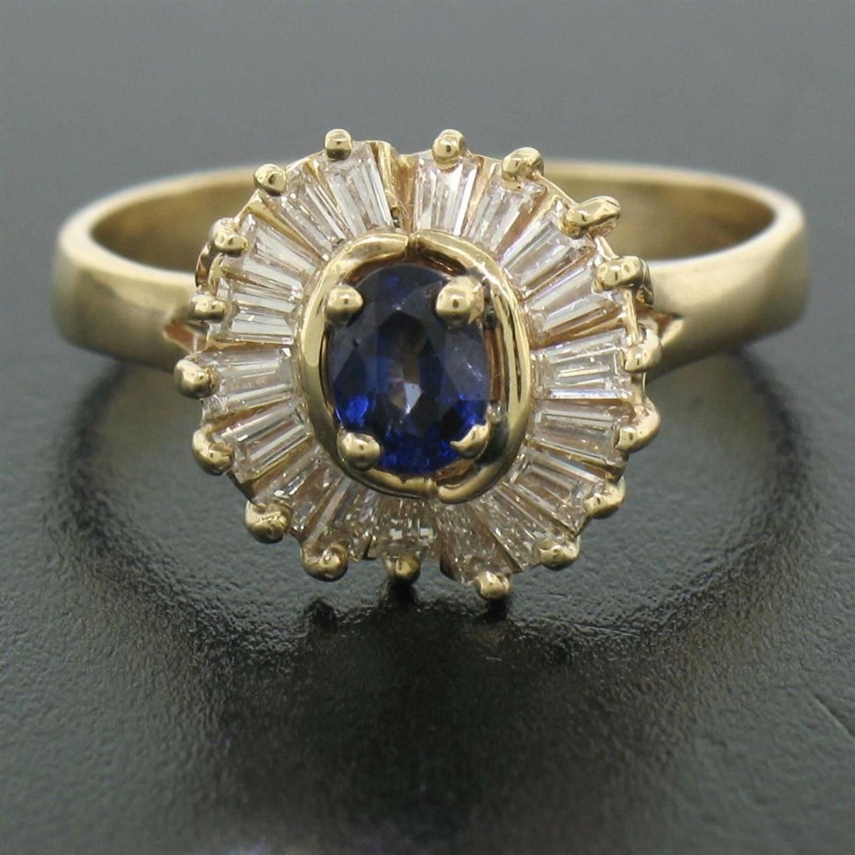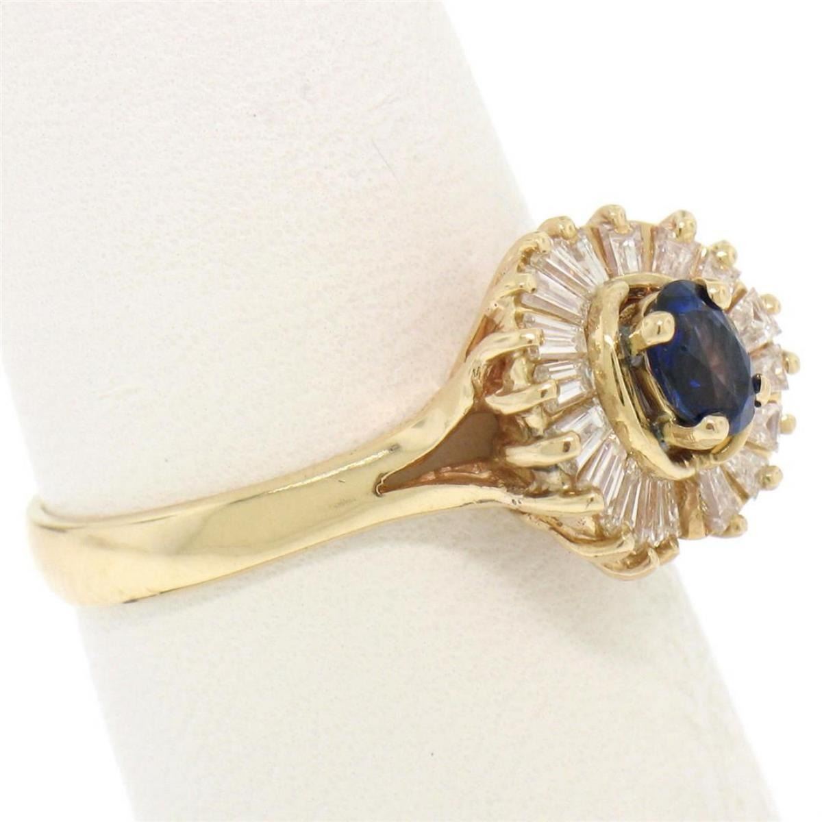 A like new 14kt yellow gold ring prong set with a 0.35ct oval sapphire surrounded by 0.65ctw of baguette cut diamonds (F/G - VS1/VS2). The ring is a size 6.75, weighs a total of 3.70 grams, and is 11mm wide.