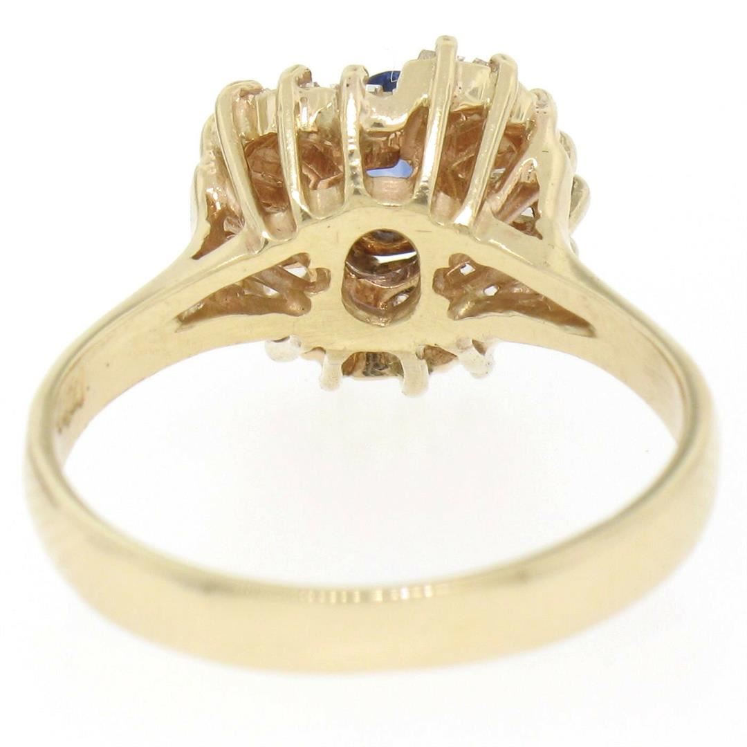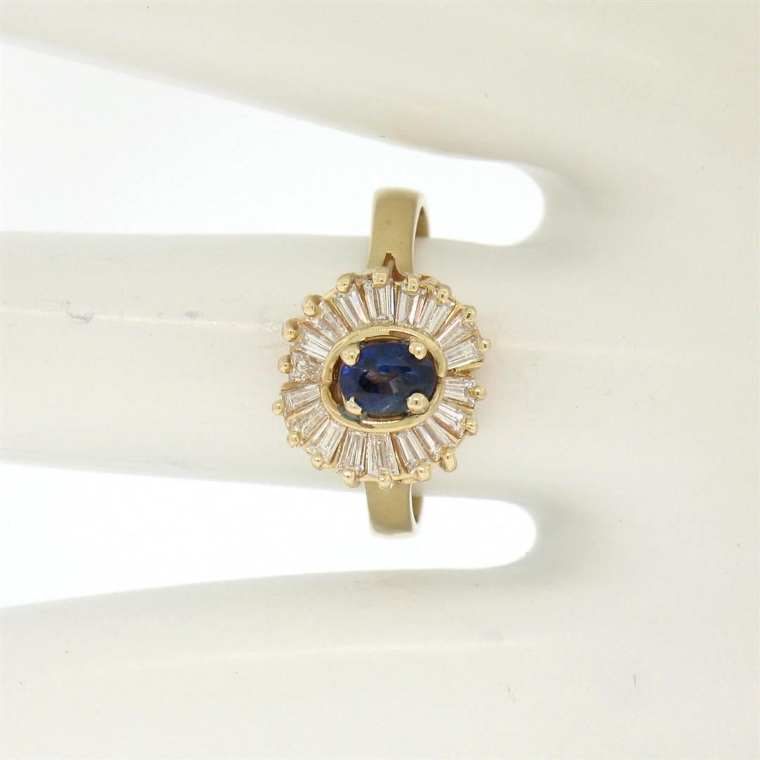 A like new 14kt yellow gold ring prong set with a 0.35ct oval sapphire surrounded by 0.65ctw of baguette cut diamonds (F/G - VS1/VS2). The ring is a size 6.75, weighs a total of 3.70 grams, and is 11mm wide.