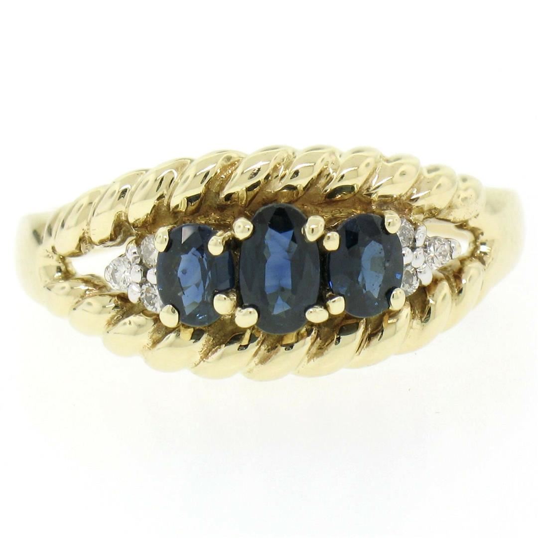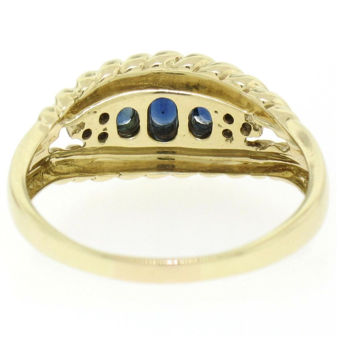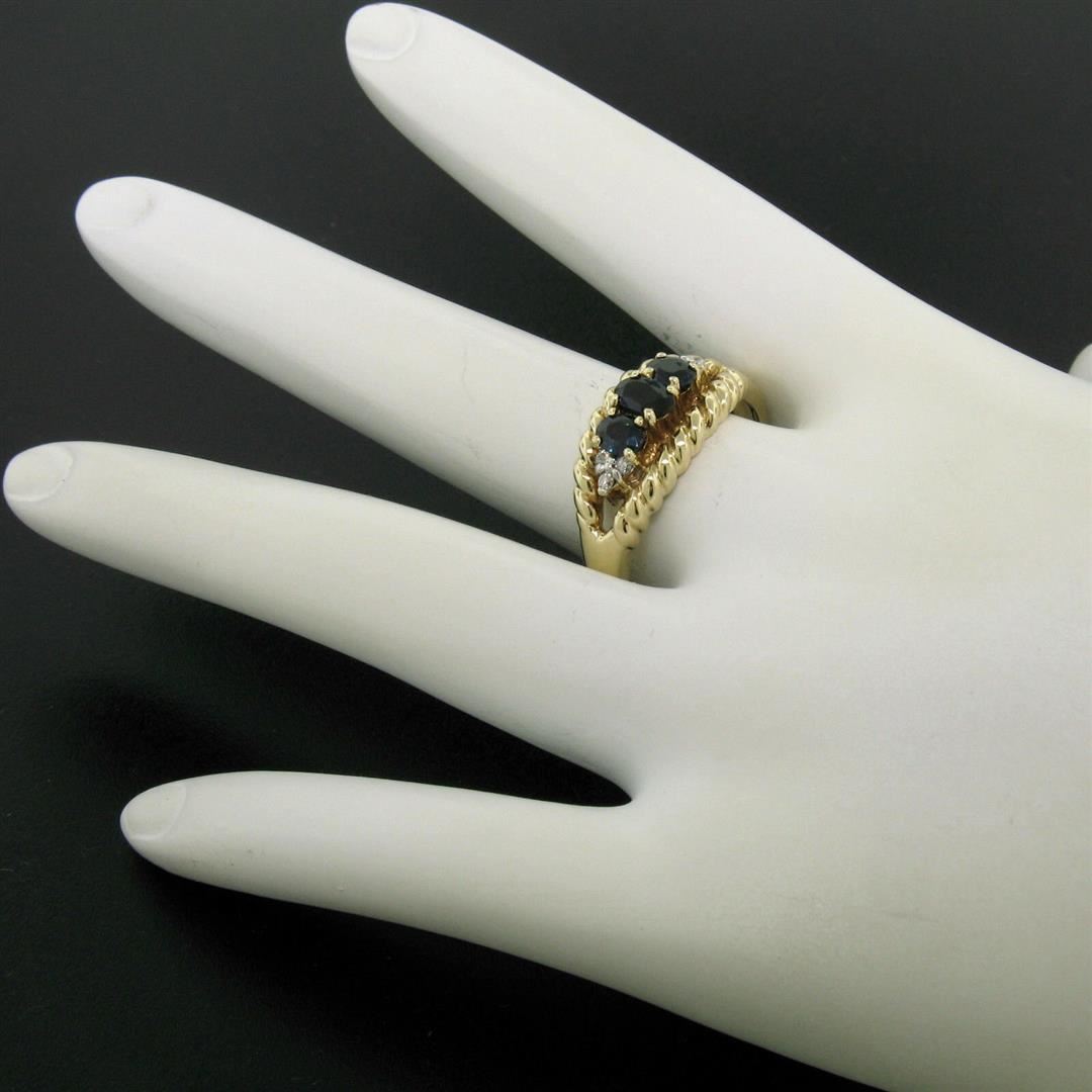 A like new 14kt yellow gold band ring with 1.40ctw of oval cut sapphires accented by 0.06ctw of round diamonds (H - SI1). The ring is size 8.5, weighs a total of 4.2 grams, and measures approximately 9.5mm wide.