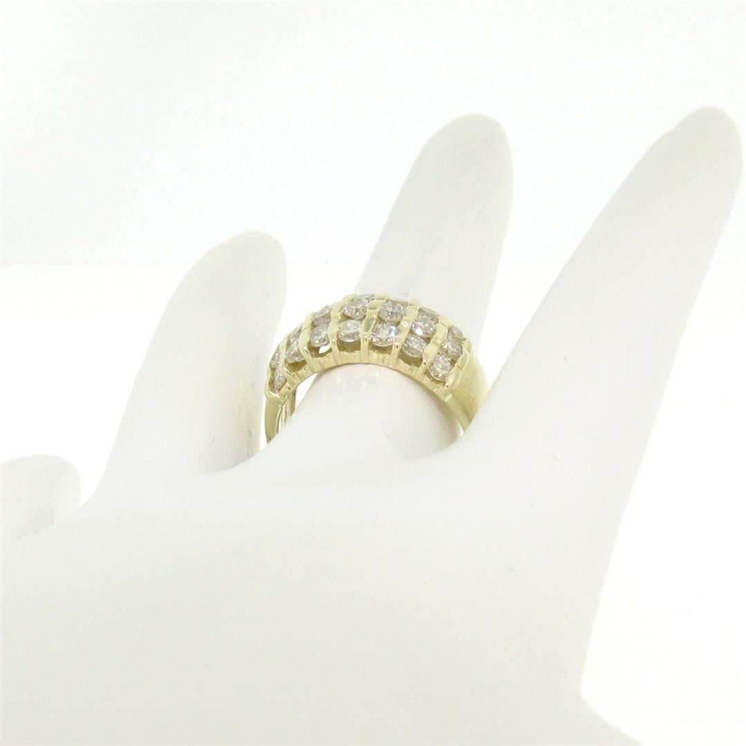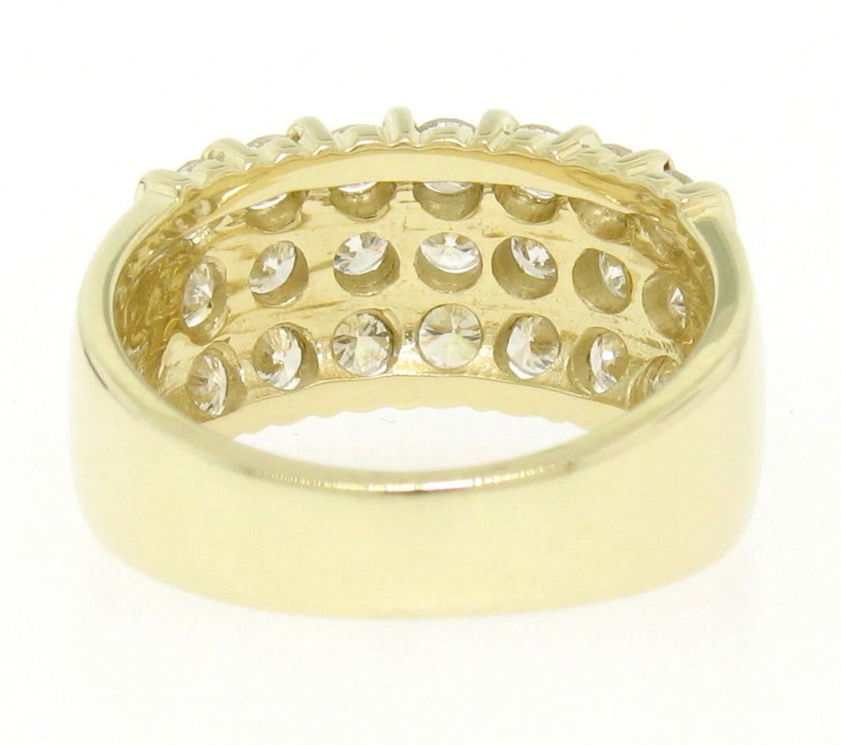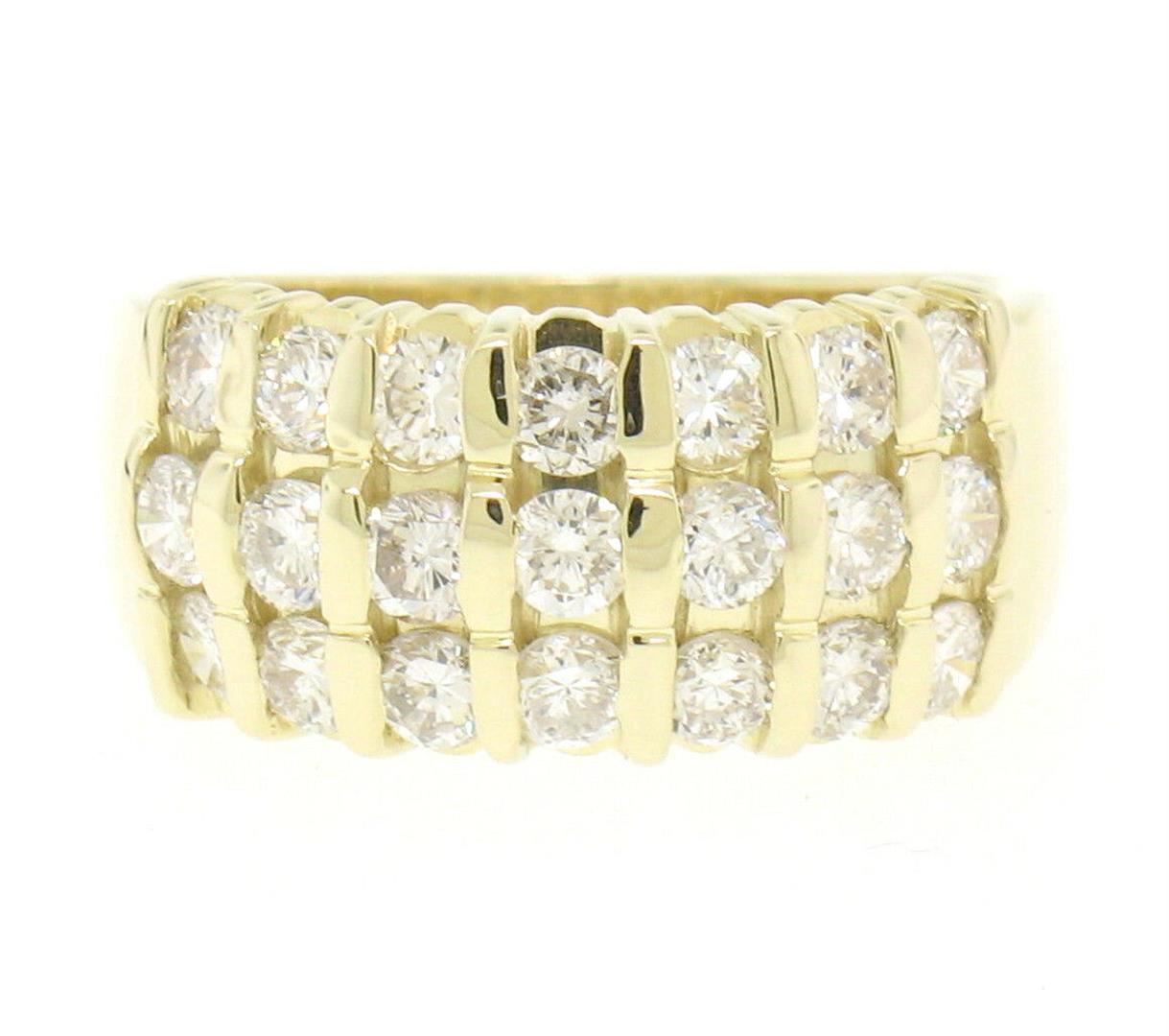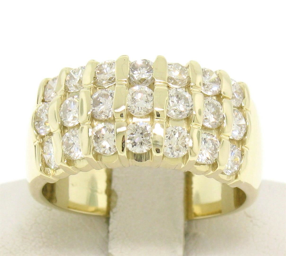 A 14kt yellow gold wide band ring bar set with 1.48ctw of round brilliant diamonds (G/H - VS2) in 3 rows. The ring is size 6.0, weighs a total of 6.70 grams, and measures 9.1mm wide.