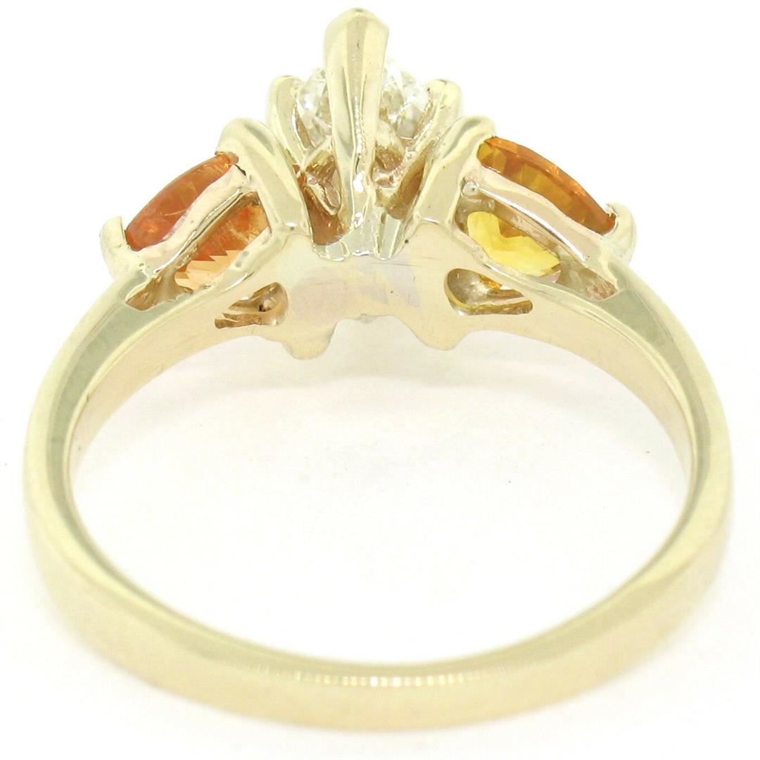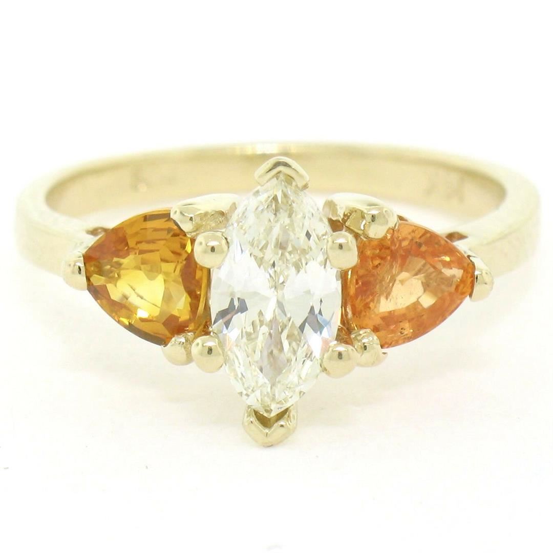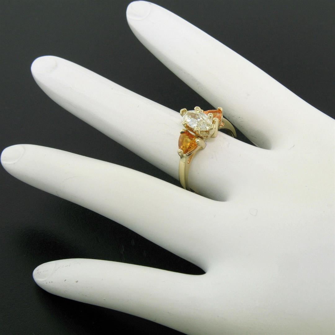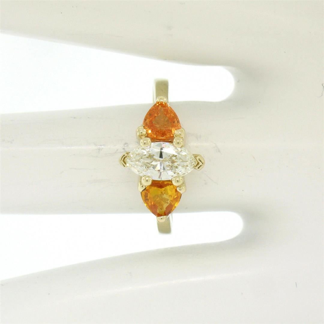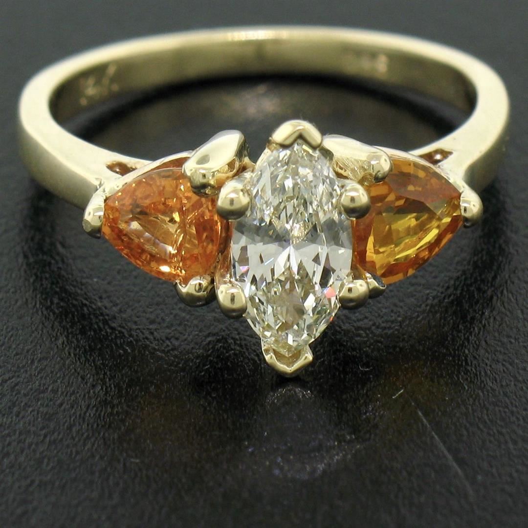 A 14kt yellow gold 3 stone ring featuring a 0.72ct marquise cut diamond (J - VS1) flanked by 2 trillion cut yellow-orange sapphires totaling 0.90 carats. The ring is size 6.5, weighs a total of 3.24 grams, and measures 10.15mm wide.