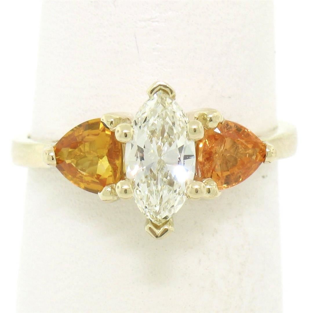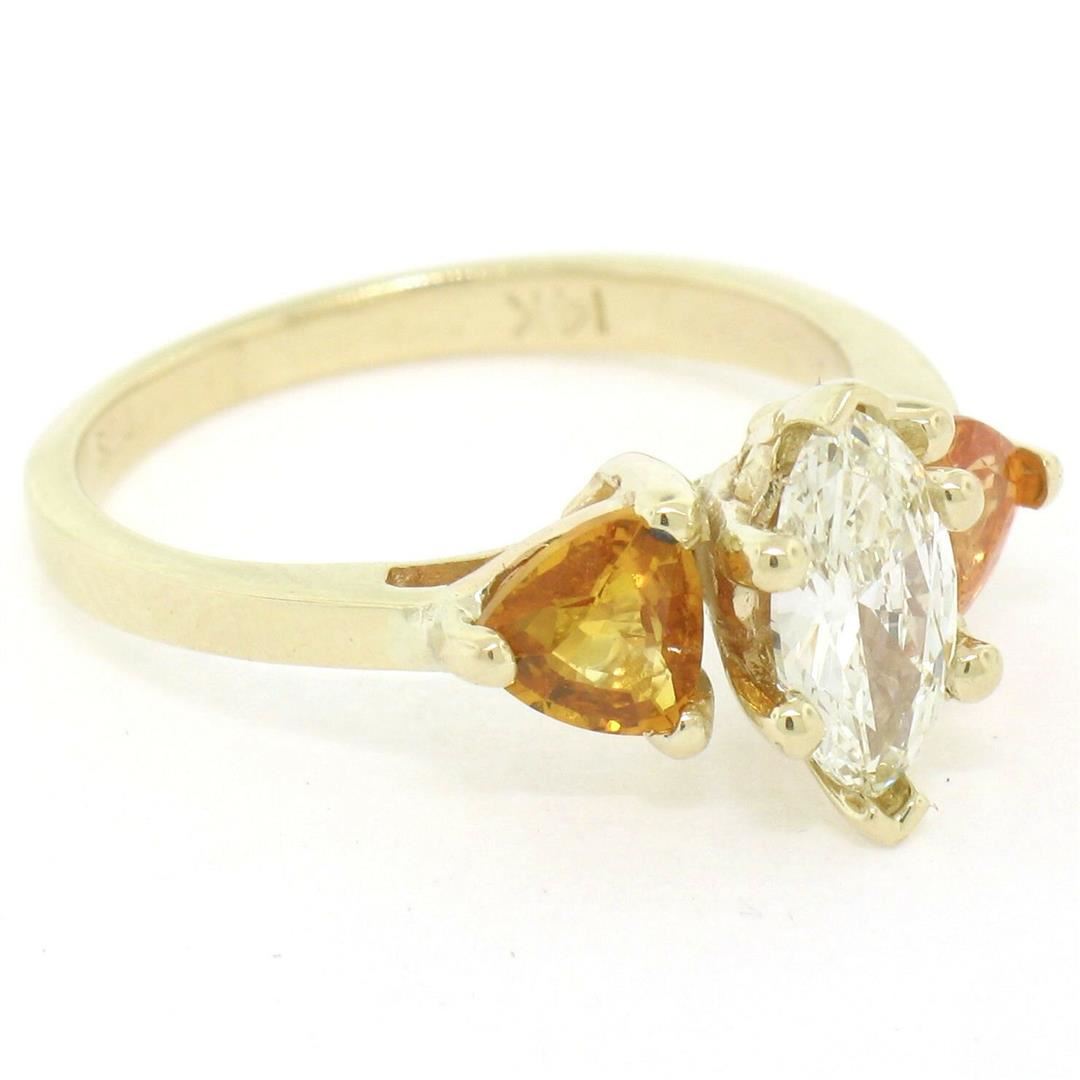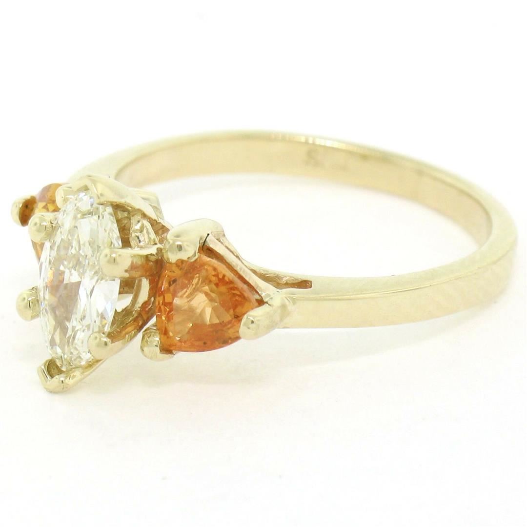 A 14kt yellow gold 3 stone ring featuring a 0.72ct marquise cut diamond (J - VS1) flanked by 2 trillion cut yellow-orange sapphires totaling 0.90 carats. The ring is size 6.5, weighs a total of 3.24 grams, and measures 10.15mm wide.