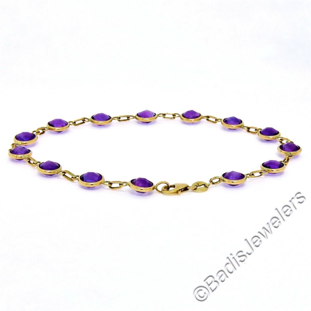 A like new 14kt yellow gold "By the Yard" style bracelet bezel set with 10.50ctw of round checkerboard cut amethysts. It weighs a total of 4.14 grams, measures 6.65mm wide, and measures 8 inches in length.