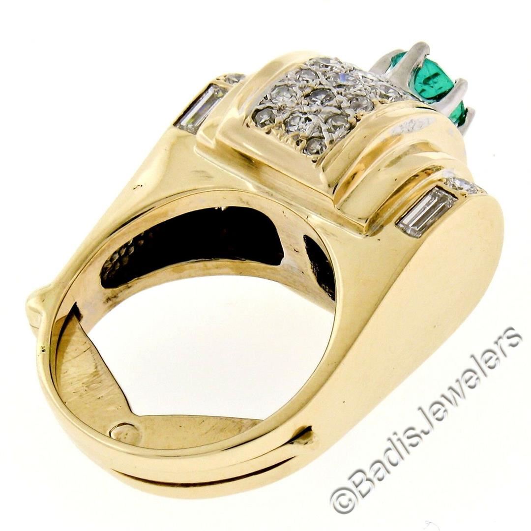 A 14kt yellow gold cocktail ring with an arthritic shank set with a natural 0.60ct oval cut emerald and accented by 1.50ctw of round and baguette cut diamonds (G/H - VS1 to SI1). The ring is size 4.0, weighs a total of 13.3 grams, and measures 16.50mm wide.