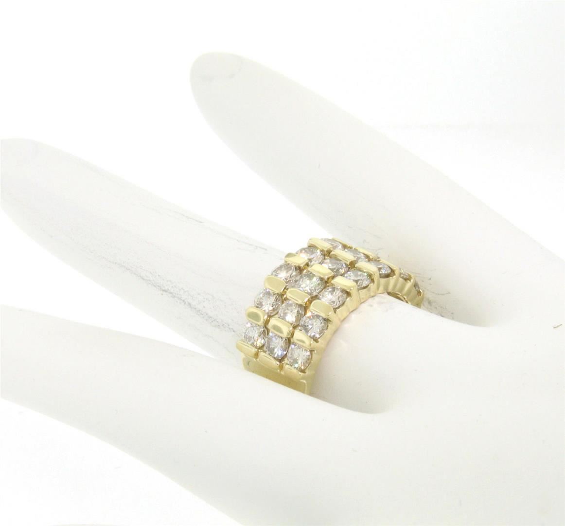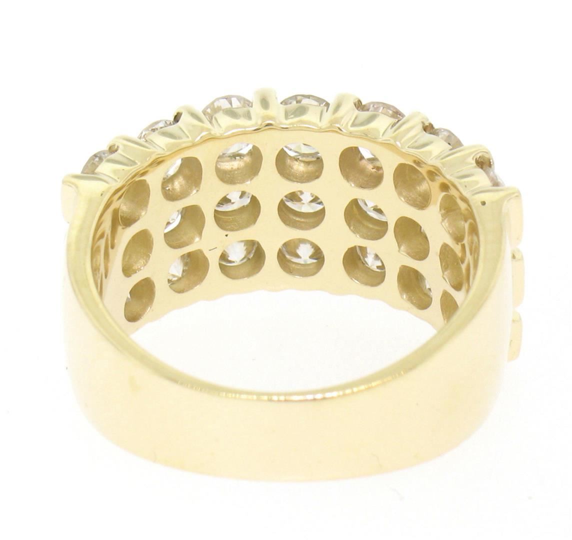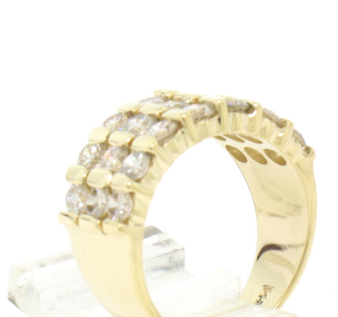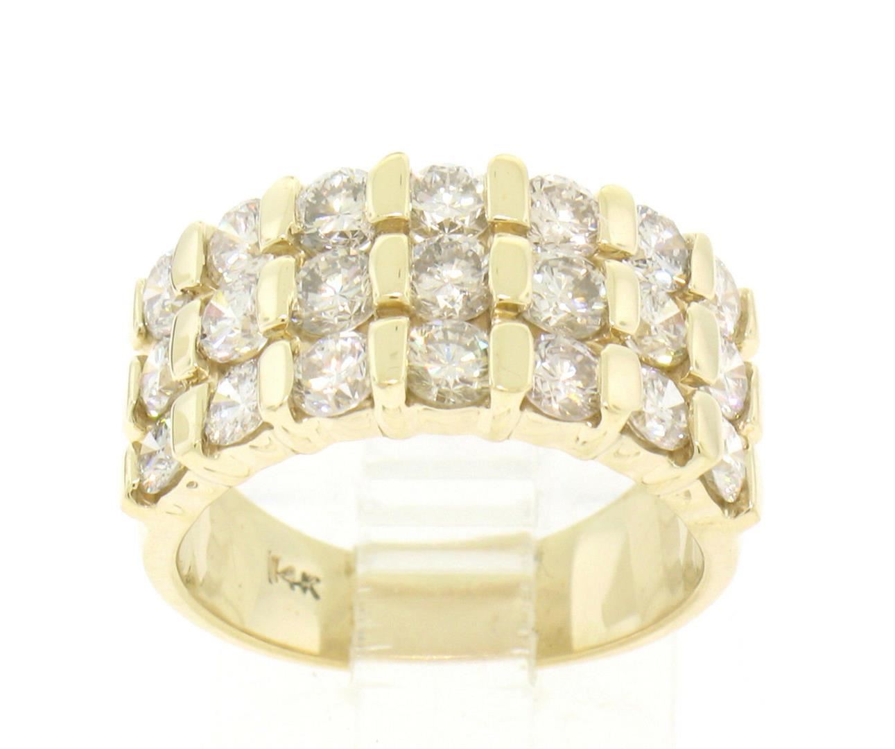 A brand new 14kt yellow gold band ring bar set with 2.52ctw of round diamonds (F - VS2). The ring is size 5, weighs a total of 8.6 grams, and measures 10.2mm wide.