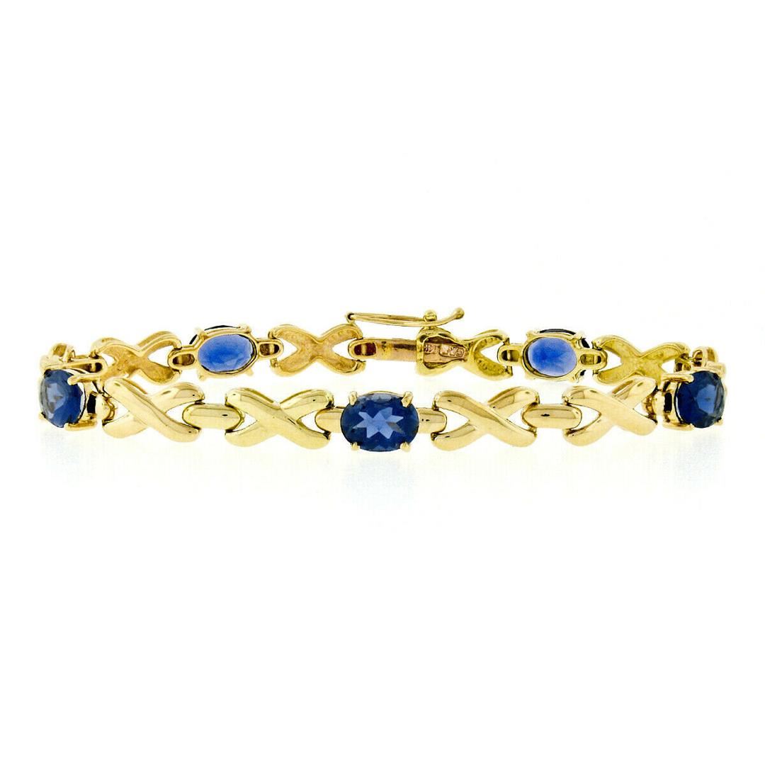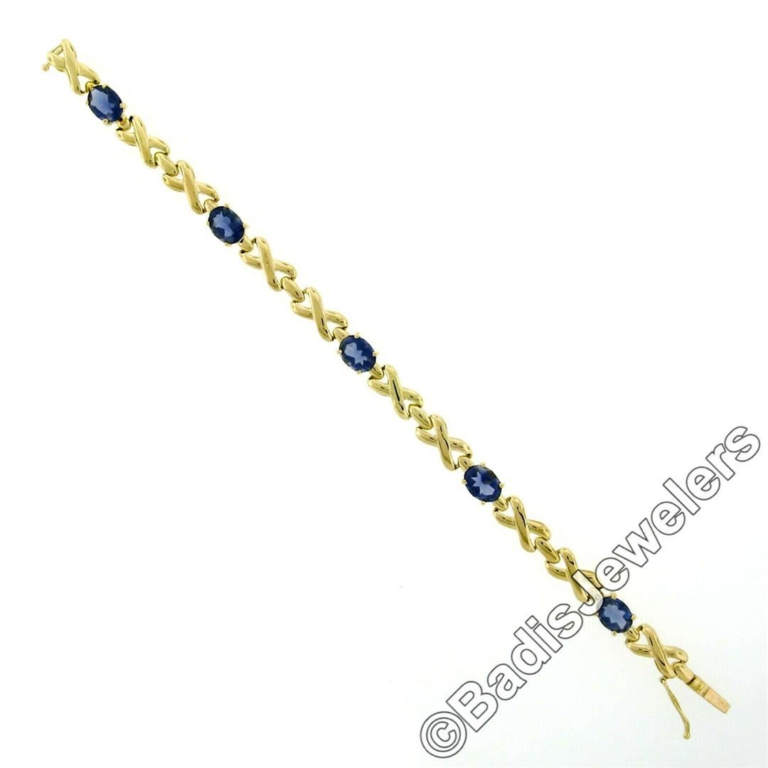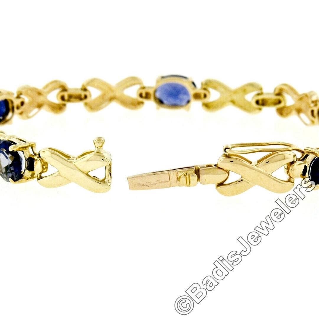 A 14kt yellow gold tennis bracelet featuring puffed "X" and "O" links with 5 natural iolites (6.00ctw). It weighs a total of 11.65 grams, measures 6.2mm wide, and measures 7 inches in length.