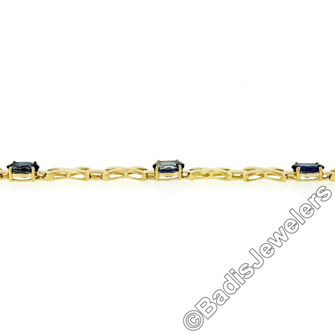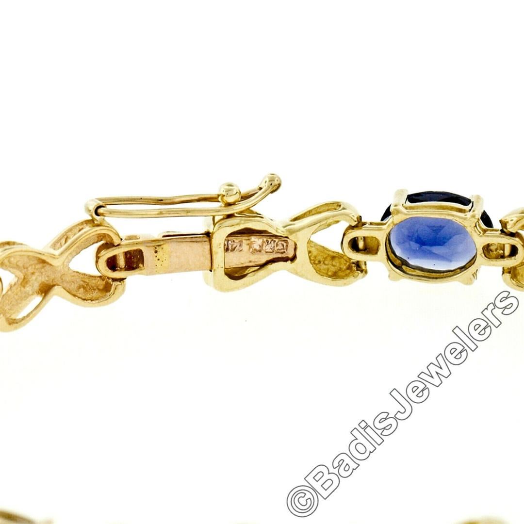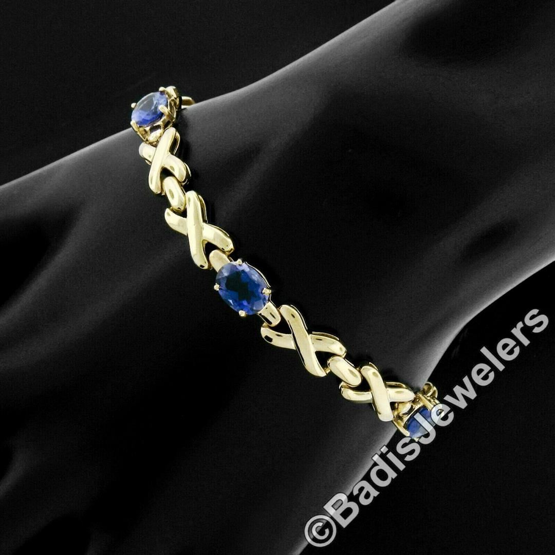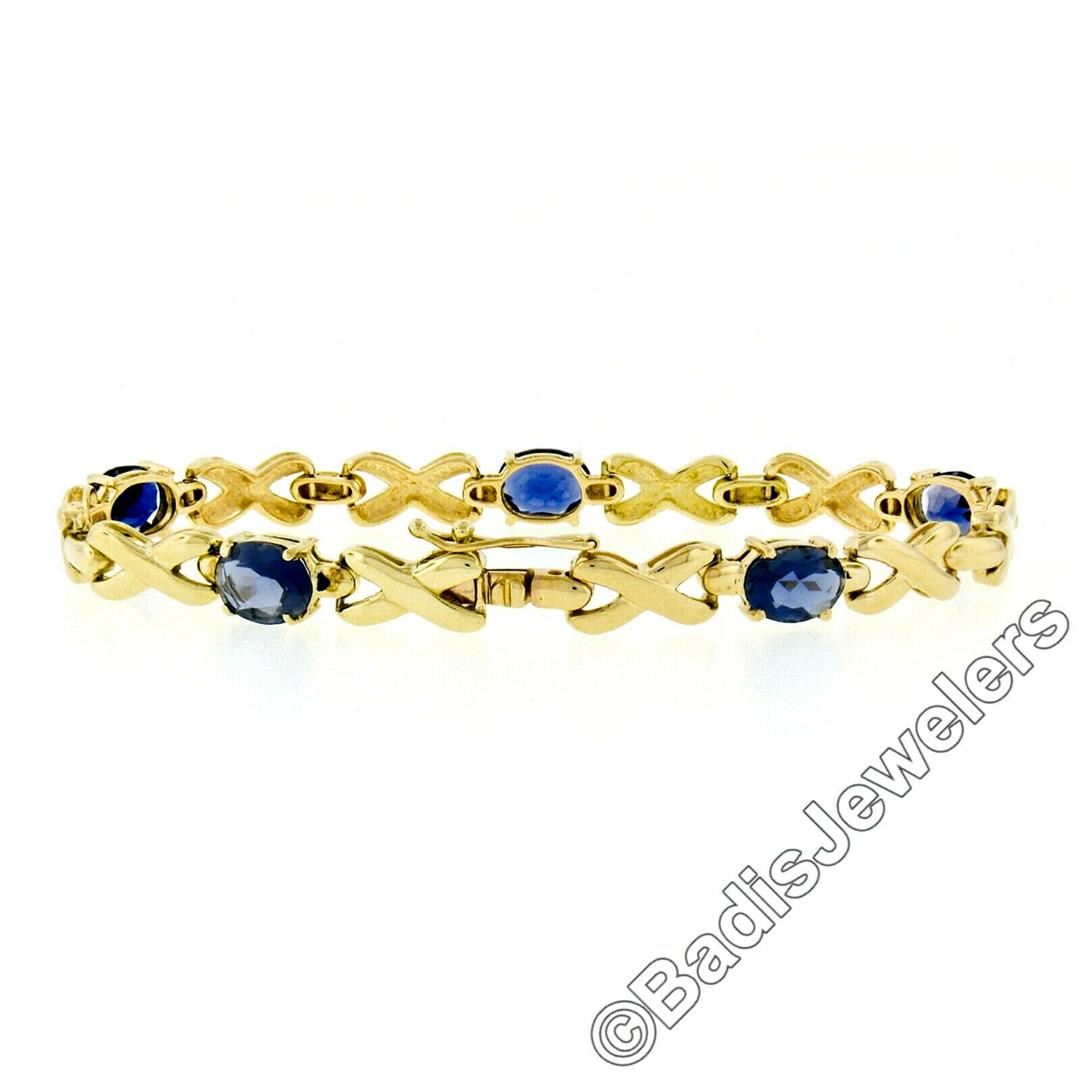 A 14kt yellow gold tennis bracelet featuring puffed "X" and "O" links with 5 natural iolites (6.00ctw). It weighs a total of 11.65 grams, measures 6.2mm wide, and measures 7 inches in length.