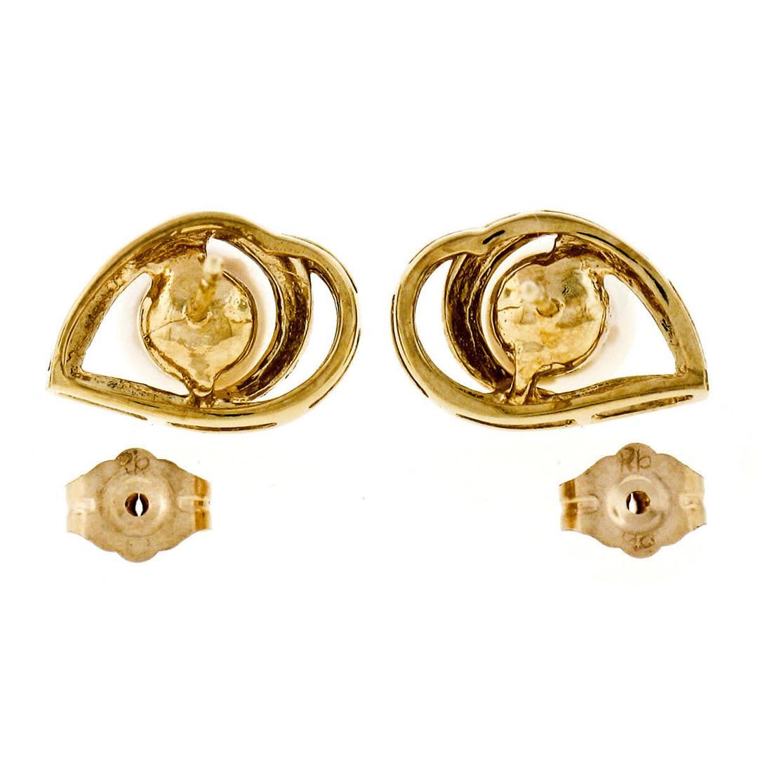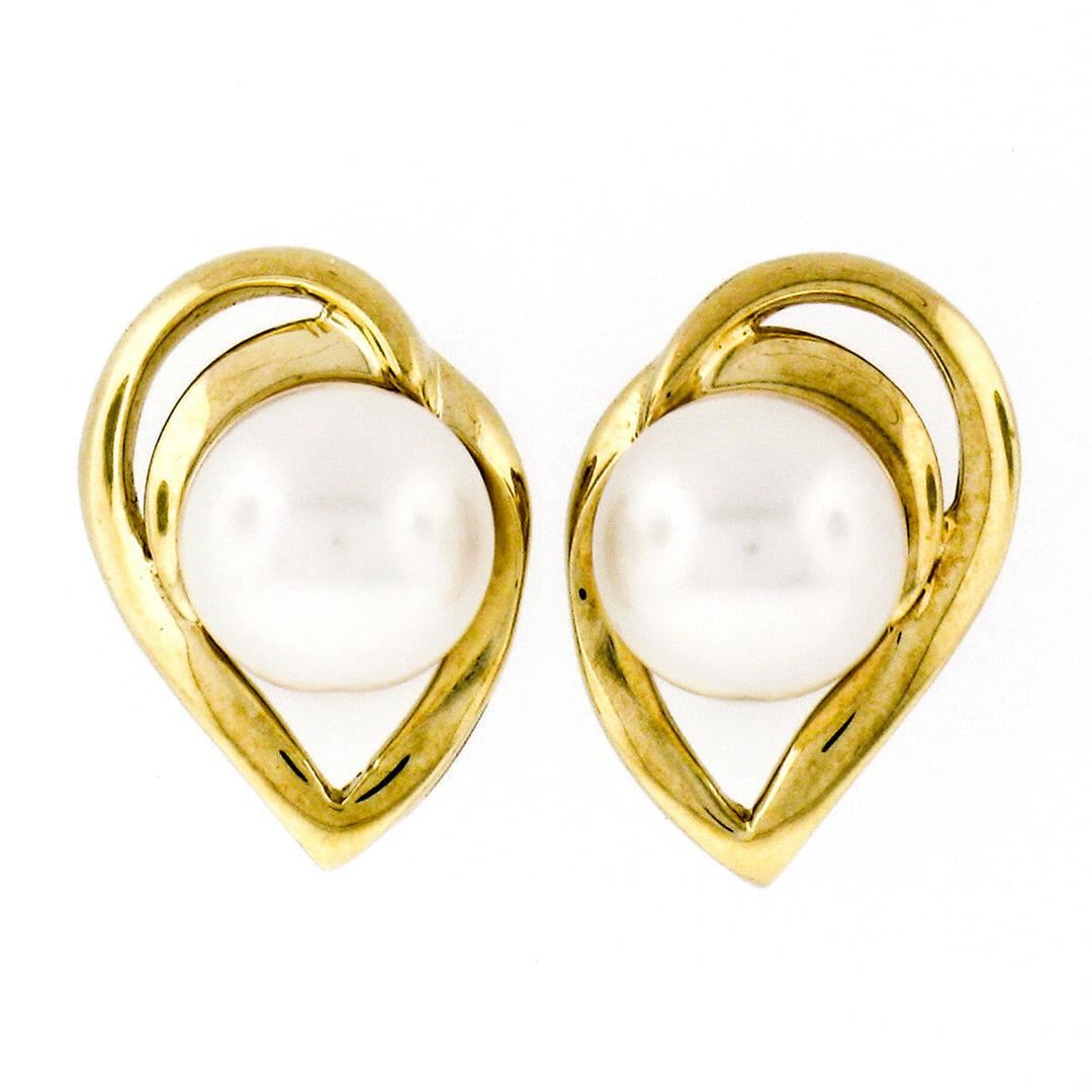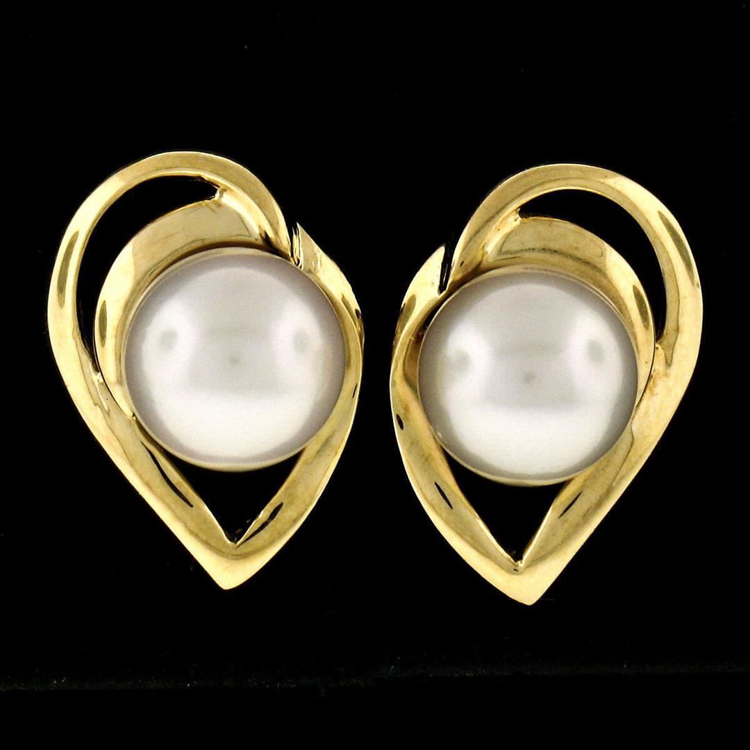 A pair of 14kt yellow gold stud earrings featuring a high-polished open design and a pair of round white cultured pearls (6.60mm). The earrings measure approximately 13.3x9.7mm and weigh a total of 2.84 grams.