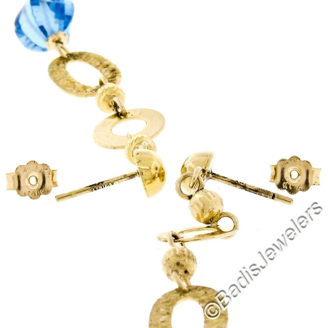A pair of long 14kt yellow gold dangle earrings with 9.5x7.0mm briolette cut blue topaz beads. The earrings measure approximately 61.0x9.5mm and weigh a total of 5.45 grams.