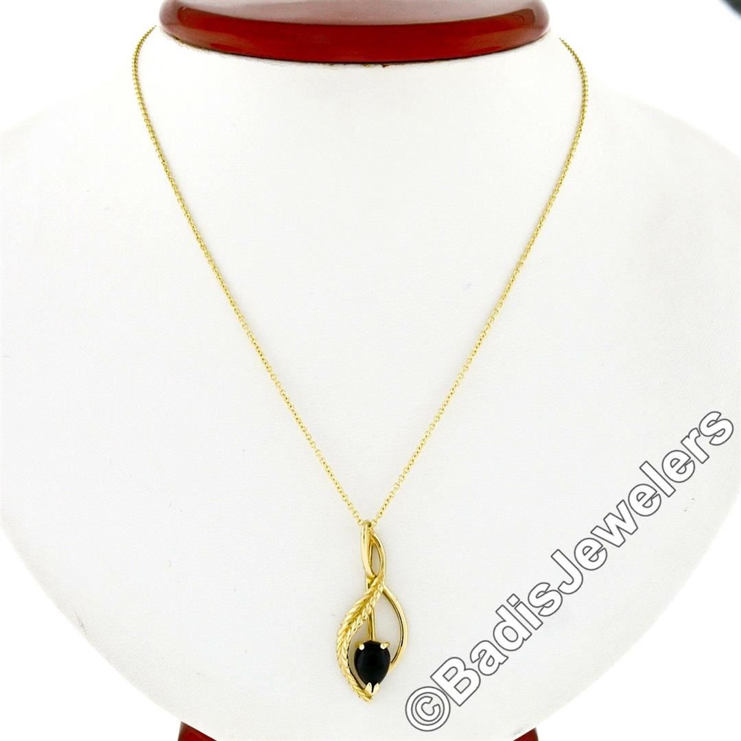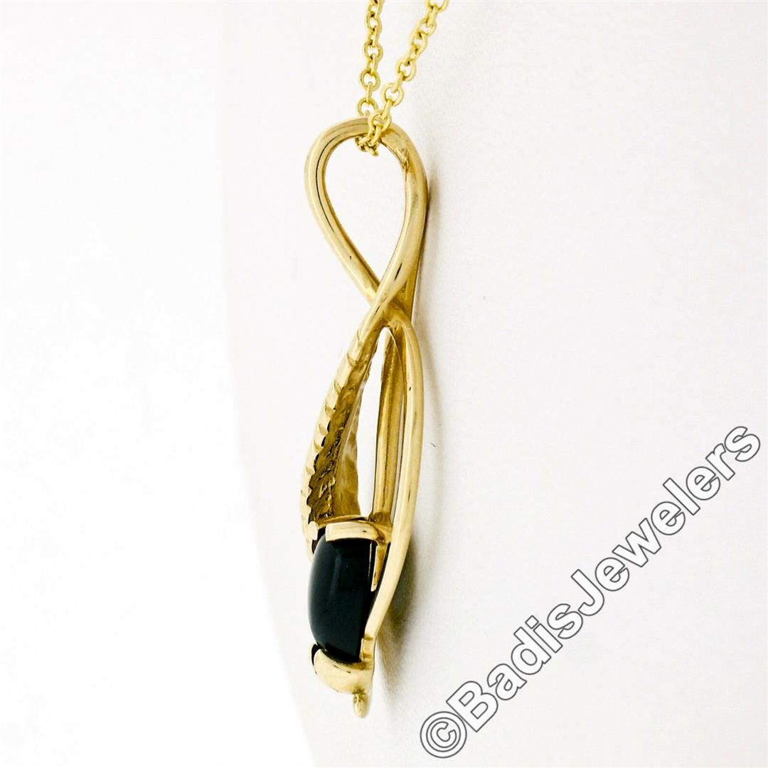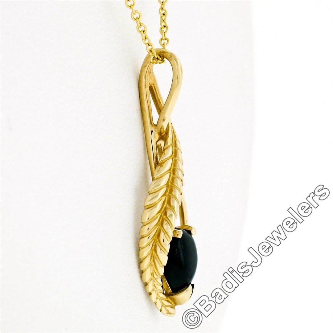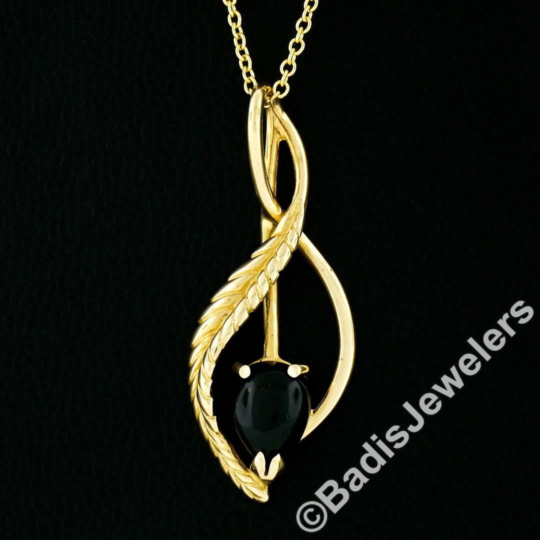 A 14kt yellow gold leaf pendant necklace featuring a prong set pear cabochon black onyx (8.4x5.9mm). 18 inch cable link chain, 3.91 grams total weight, pendant measures 31.25x12.35mm.