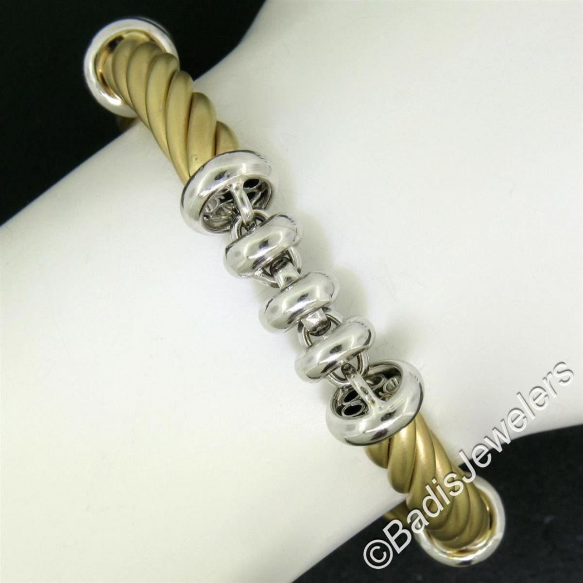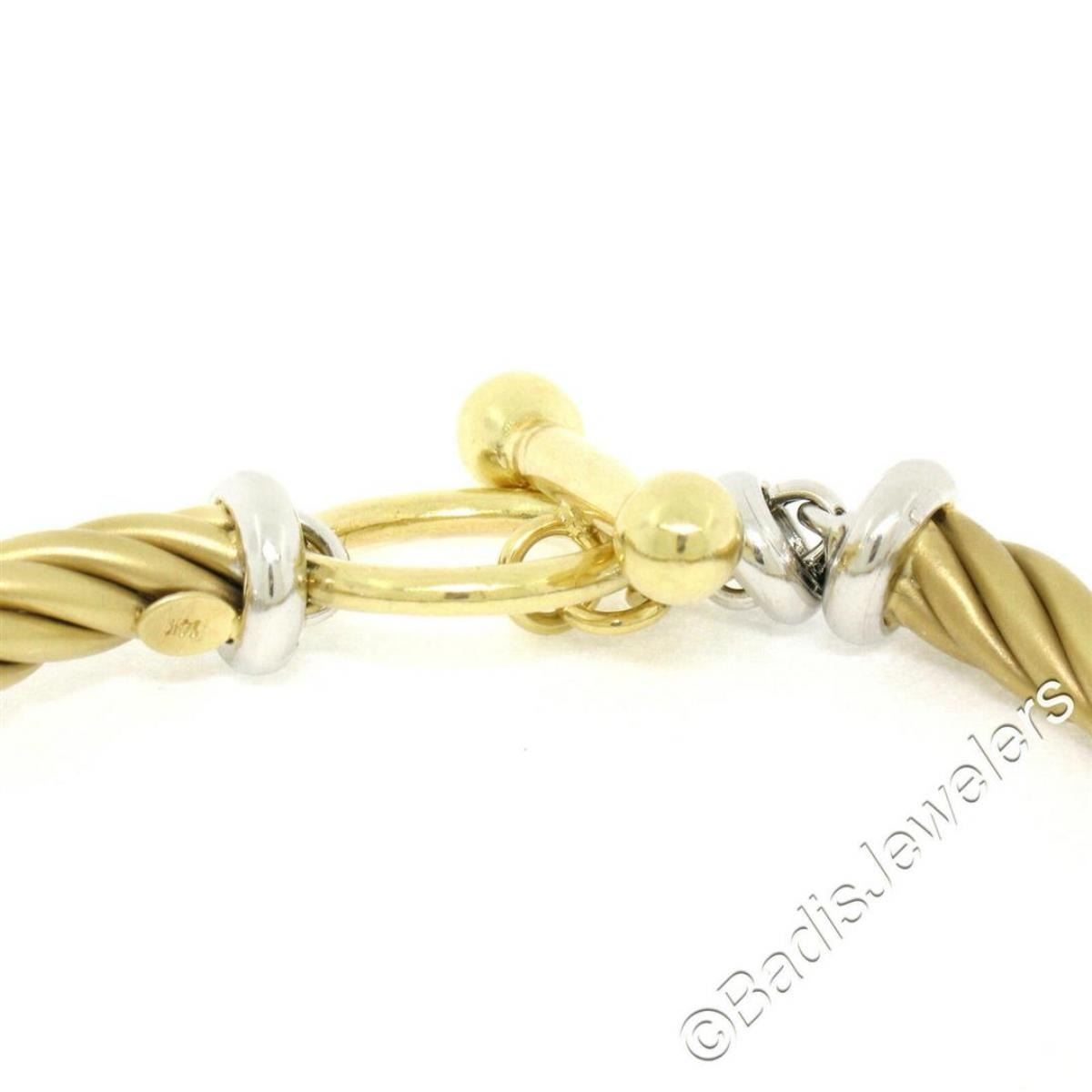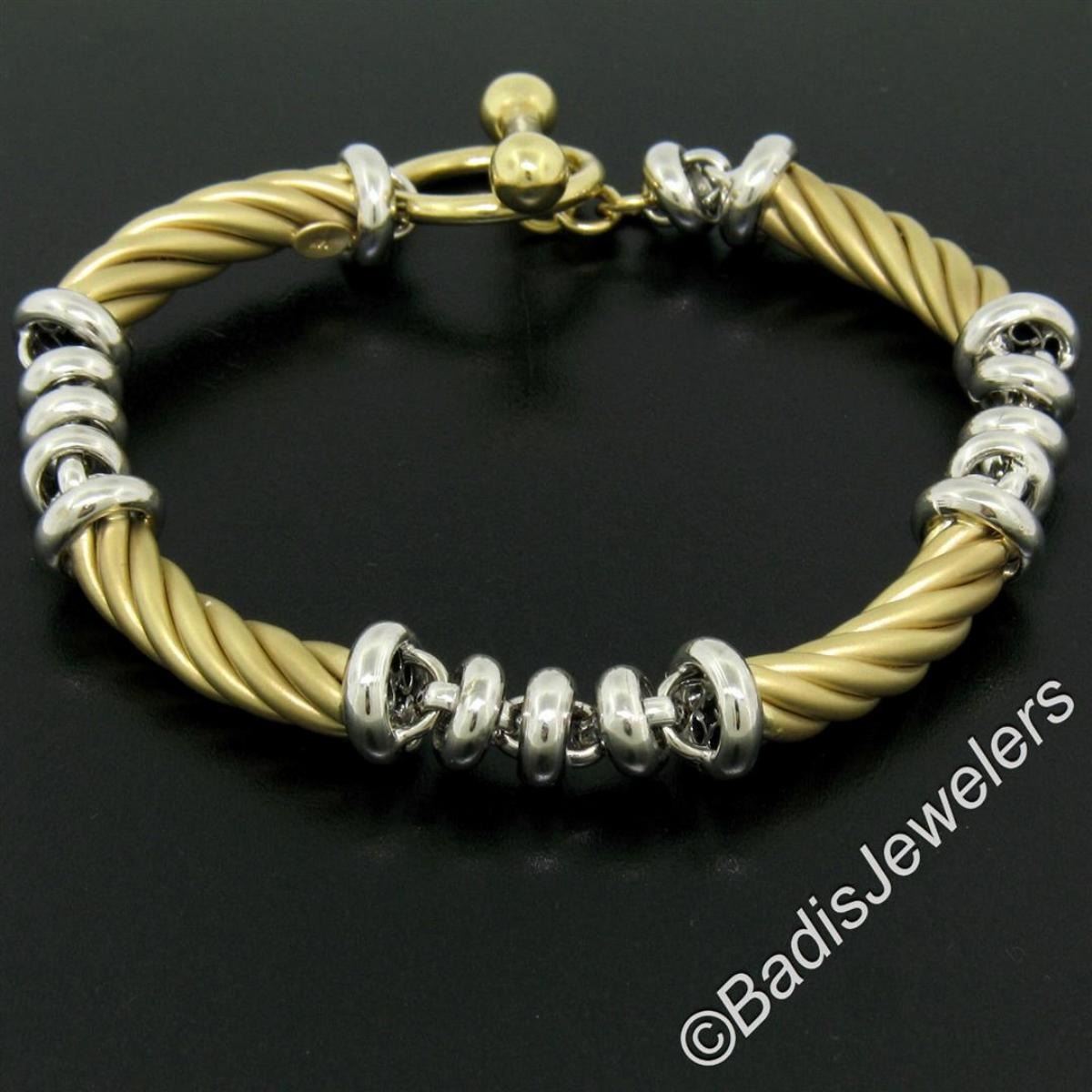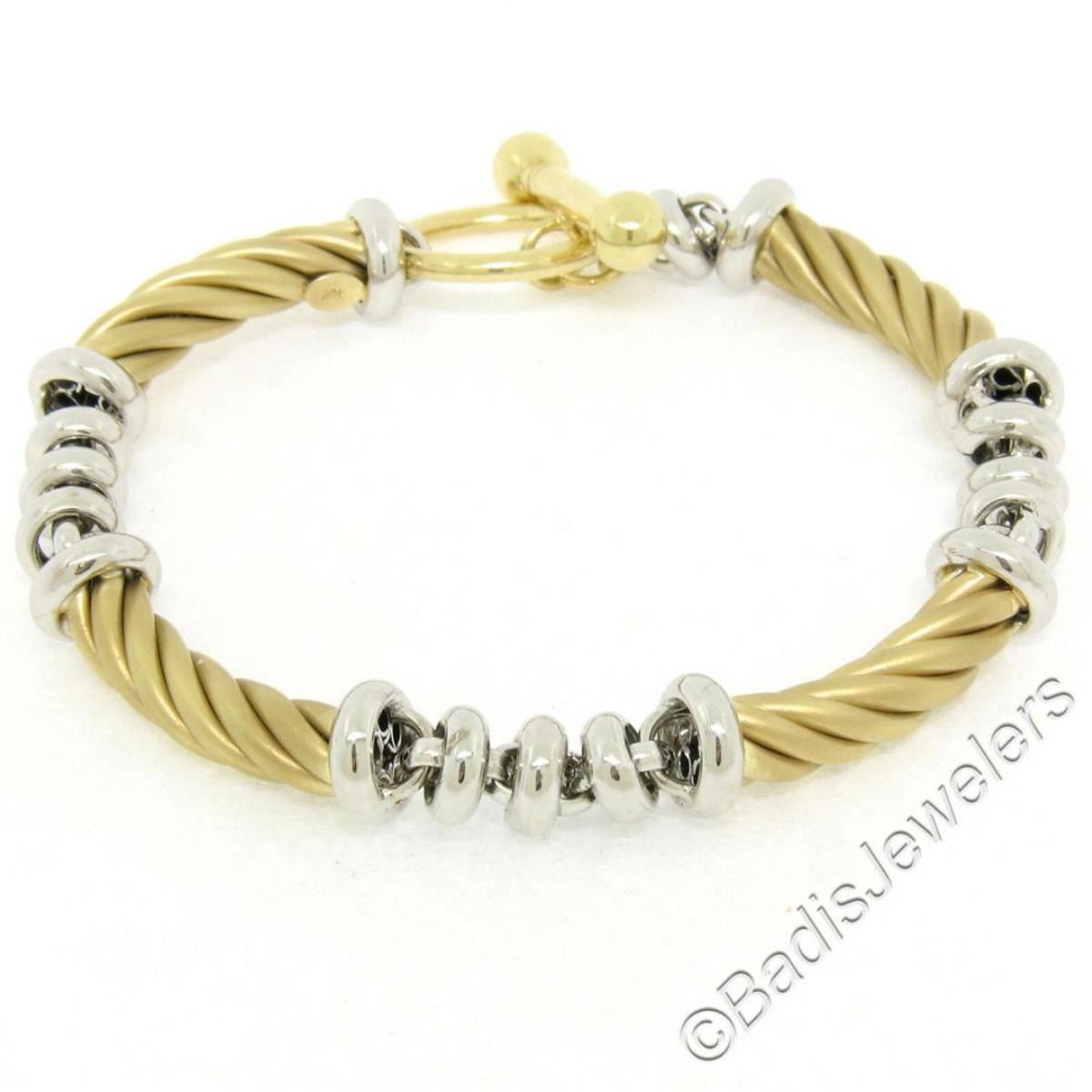 A 14kt yellow and white gold twisted tube and rolo link chain toggle bracelet. It weighs a total of 29.54 grams, measures 9.5mm wide, and measures 8.5 inches in length.