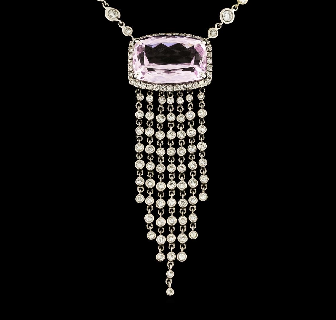 One electronically tested 18KT white gold lady's combination cast & assembled dangling fringe necklace with a spring ring clasp with a bright polish finish. The featured lady's necklace has a 1.4mm thick round cable link chain measuring approximately fifteen inches long, containing eighteen diamond bezel links. Identified with markings of '18K 750'. Condition is new, good workmanship. Containing: One prong set rectangular cushion modified brilliant cut natural kunzite, measuring 17.96 x 12.70 x 8.90mm, (depth est.) approximate weight of 15.20ct., clarity is eye clean, light, very slightly grayish, purple red color, (GIA PR 3/3), cut is very good. Transmitting light with no distortion, transparent. Colored gemstones are presumed to have been subjected to commonly used enhancement processes. Graded in the setting. Six bezel set round brilliant cut diamonds, measuring 2.70 - 2.60 x 1.64mm (depth est.) approximate total weight of 6 Stones = 0.42ct. Graded in the setting. Clarity SI-2 to I-1. Color: H - I Cut Good Sixty-Three bezel set round brilliant cut diamonds, measuring 1.70 - 1.60 x 1.02mm (depth est.) approximate total weight of 63 Stones = 1.06ct. Graded in the setting. Clarity SI-1 to I-1. Color: H - I Cut Good Forty-Nine prong set round brilliant cut diamonds, measuring 1.50 - 1.40 x 0.90mm (depth est.) approximate total weight of 49 Stones = 0.56ct. Graded in the setting. Clarity SI-2 to I-1. Color: H - I Cut Good. Total Weight of Colored Stones 15.20ct.. Total Weight of Diamonds 2.04ct.. Total Weight of Necklace 16.80gm. GAS Appraised.