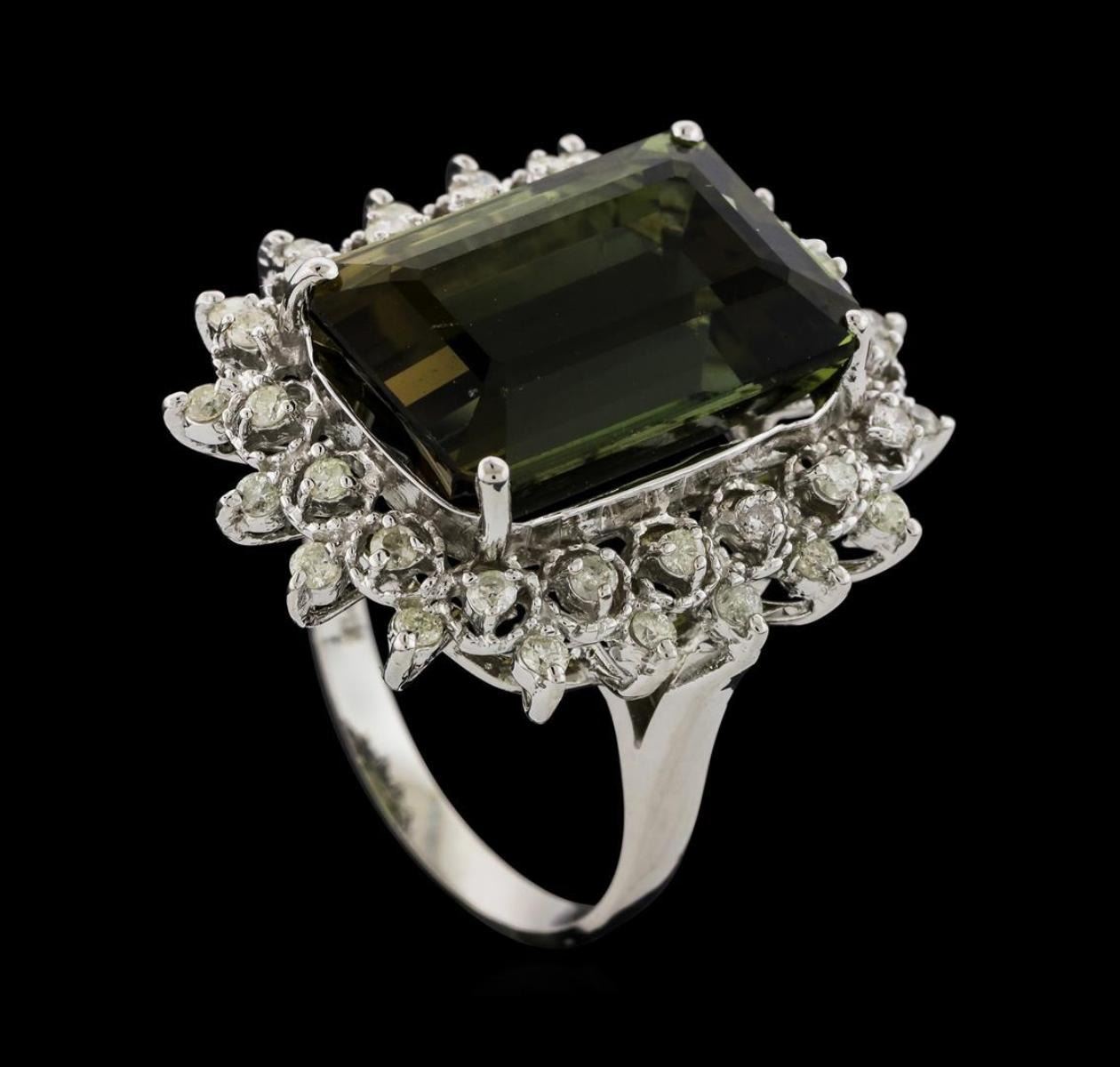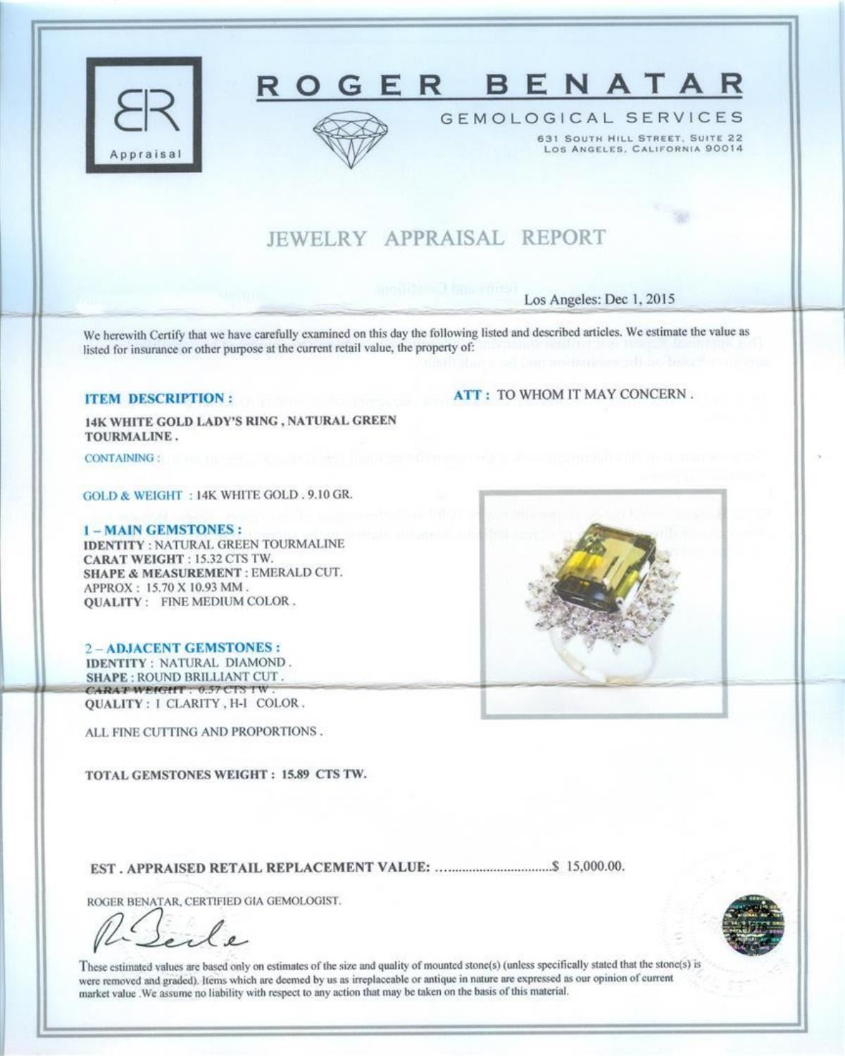 One 14KT White Gold Lady's Ring, Natural Green Tourmaline. Containing: Gold & Weight: 14KT White Gold, 9.10 grams. Main Gemstones: Identity: Natural Green Tourmaline. Carat Weight: 15.32 cts tw. Shape & Measurement: Emerald Cut. Approx: 15.70 x 10.93 mm. Quality: Fine medium color. Adjacent Gemstones: Identity: Natural Diamond. Shape: Round Brilliant Cut. Carat Weight: 0.57 cts tw. Quality: I Clarity, H-I Color. All fine cutting and proportions. Total Gemstones Weight: 15.89 cts tw. RBGS Appraised.