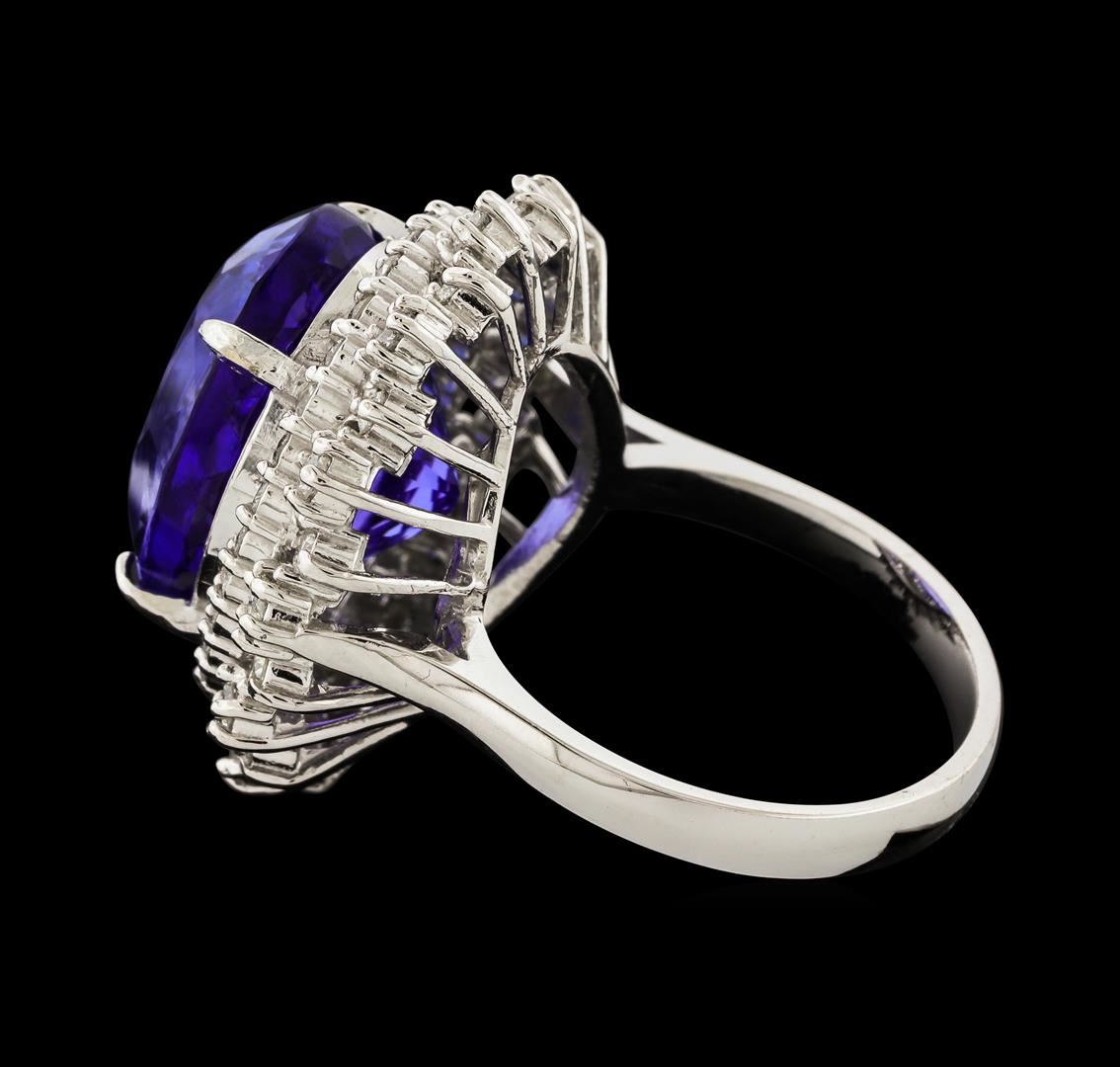 One electronically tested 14KT white gold lady's cast fashion ring with a staggered double basket halo with a bright polish finish. The featured lady's ring has a shank measuring 3.01 millimeters wide. Identified with markings of 'K14'. Condition is new, good workmanship. Containing: One prong set oval modified brilliant cut natural tanzanite, measuring 15.95 x 12.70 x 10.54mm, (depth est.) approximate weight of 15.33ct., clarity is eye clean, medium dark, moderately strong, violetish blue color, (GIA vB 6/4), cut is very good. Transmitting light with no distortion, transparent. Colored gemstones are presumed to have been subjected to commonly used enhancement processes. Graded in the setting. Twelve prong set round brilliant cut diamonds, measuring 2.20 - 2.10 x 1.33mm (depth est.) approximate total weight of 12 Stones = 0.45ct. Graded in the setting. Clarity SI-1 to SI-2. Color: G - H Cut Good Forty-Two prong set round brilliant cut diamonds, measuring 1.70 - 1.60 x 1.01mm (depth est.) approximate total weight of 42 Stones = 0.70ct. Graded in the setting. Clarity SI-1 to SI-2. Color: G - I Cut Good. Total Weight of Colored Stones 15.33ct.. Total Weight of Diamonds 1.15ct.. Total Weight of Ring 11.30gm GAS Appraised at $27,810.00.