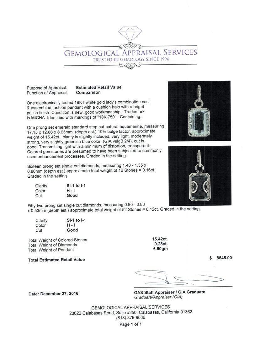 One electronically tested 18KT white gold lady's combination cast & assembled fashion pendant with a cushion halo with a bright polish finish. Trademark is MICHA. Identified with markings of '18K 750'. Condition is new, good workmanship. Containing: One prong set emerald standard step cut natural aquamarine, measuring 17.15 x 12.86 x 8.65mm, (depth est.) 10%. bulge factor, approximate weight of 15.42ct., clarity is slightly included, very light, moderately strong, very slightly greenish blue color, (GIA vslgB 2/4), cut is good. Transmitting light with a minimum of distortion, transparent. Colored gemstones are presumed to have been subjected to commonly used enhancement processes. Graded in the setting. Sixteen prong set single cut diamonds, measuring 1.40 - 1.35 x 0.86mm (depth est.) approximate total weight of 16 Stones = 0.16ct. Graded in the setting. Clarity SI-1 to I-1. Color: H - I Cut Good Fifty-Two prong set single cut diamonds, measuring 0.90 - 0.80 x 0.53mm (depth est.) approximate total weight of 52 Stones = 0.12ct. Graded in the setting. Clarity SI-1 to I-1. Color: H - I Cut Good. Total Weight of Colored Stones 15.42ct.. Total Weight of Diamonds 0.28ct.. Total Weight of Pendant 6.50gm. GAS Appraised.