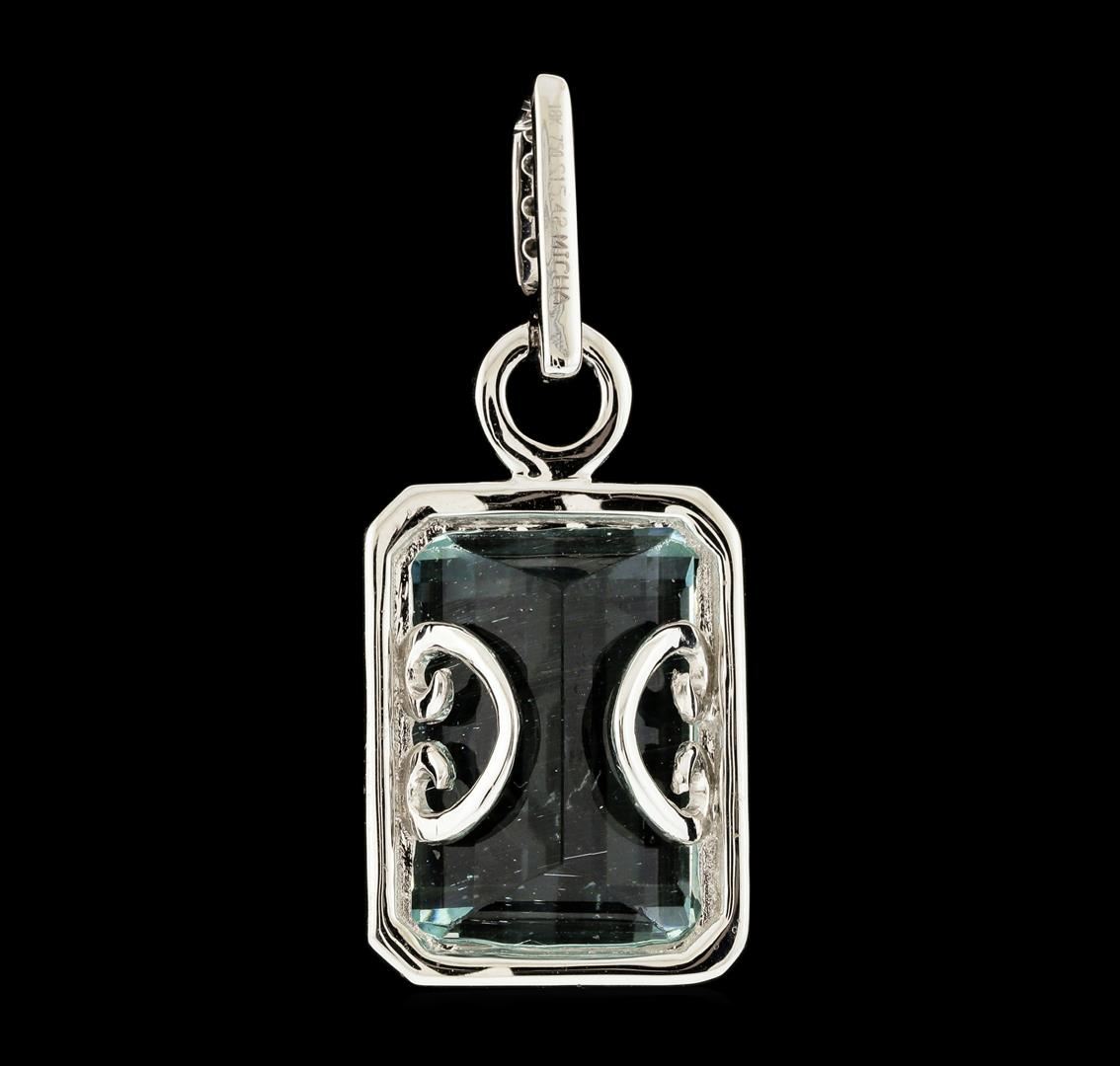 One electronically tested 18KT white gold lady's combination cast & assembled fashion pendant with a cushion halo with a bright polish finish. Trademark is MICHA. Identified with markings of '18K 750'. Condition is new, good workmanship. Containing: One prong set emerald standard step cut natural aquamarine, measuring 17.15 x 12.86 x 8.65mm, (depth est.) 10%. bulge factor, approximate weight of 15.42ct., clarity is slightly included, very light, moderately strong, very slightly greenish blue color, (GIA vslgB 2/4), cut is good. Transmitting light with a minimum of distortion, transparent. Colored gemstones are presumed to have been subjected to commonly used enhancement processes. Graded in the setting. Sixteen prong set single cut diamonds, measuring 1.40 - 1.35 x 0.86mm (depth est.) approximate total weight of 16 Stones = 0.16ct. Graded in the setting. Clarity SI-1 to I-1. Color: H - I Cut Good Fifty-Two prong set single cut diamonds, measuring 0.90 - 0.80 x 0.53mm (depth est.) approximate total weight of 52 Stones = 0.12ct. Graded in the setting. Clarity SI-1 to I-1. Color: H - I Cut Good. Total Weight of Colored Stones 15.42ct.. Total Weight of Diamonds 0.28ct.. Total Weight of Pendant 6.50gm. GAS Appraised.