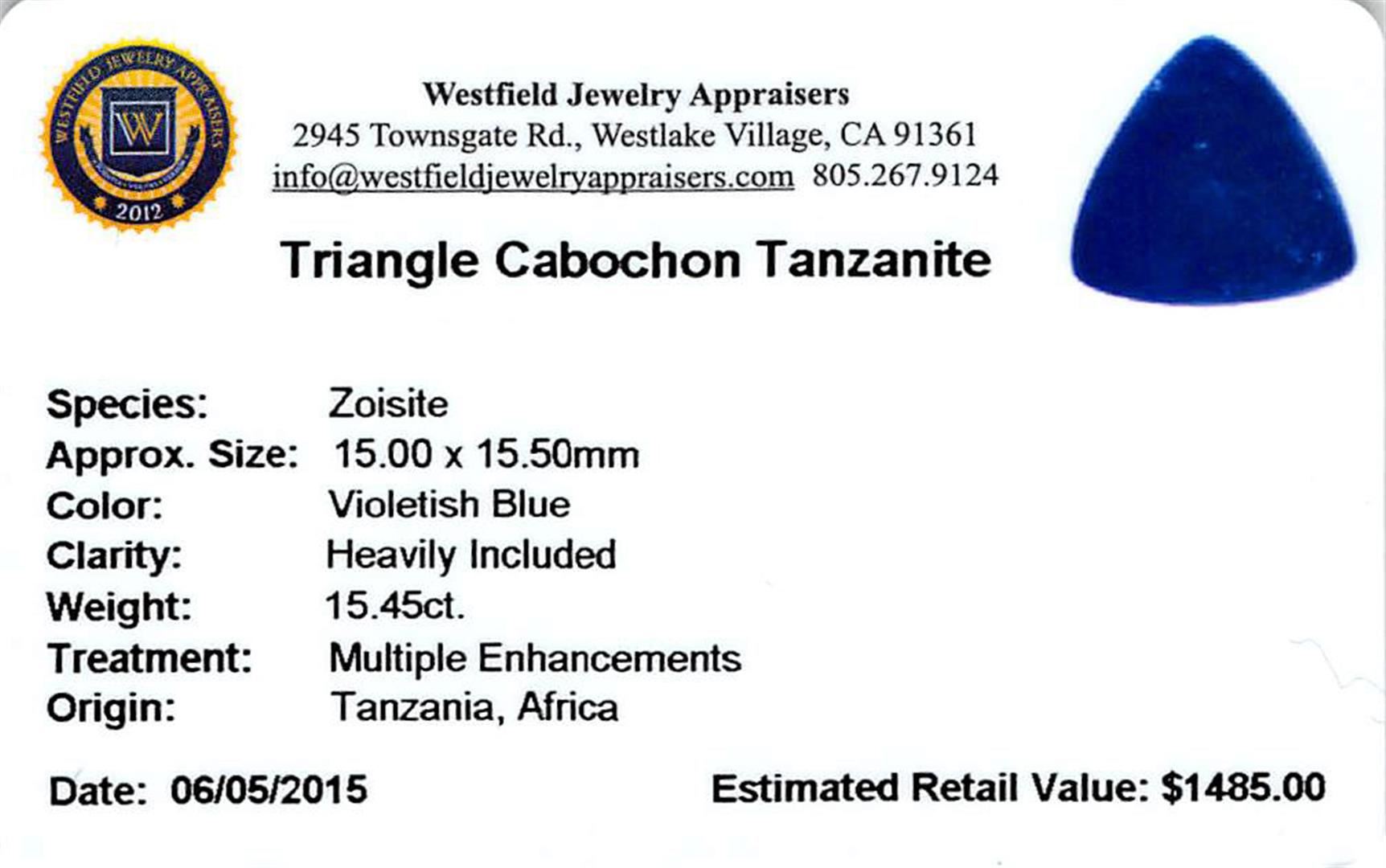 One triangle cabochon cut natural tanzanite, measuring 15.50 x 15.00 x 8.50mm, exact weight 15.45ct., clarity is heavily included, type I, dark, moderately strong, violetish blue color, (GIA vB 7/4), cut is good. Transmitting light somewhat diffusely, transparent to translucent. Naturally occurring internal & external characteristics are present. Tanzanite is a very rare gemstone that is only found in the country of Tanzania. Originally discovered in 1967. Tiffany & Company, named the stone Tanzanite. It is found in the Usumburu Mountains that border the Umba Valley of northern Tanzania. Tanzanite occurs in gray, brown, violet, blue, reddish-purple, & green. The gem is interesting because of its exceptional pleochroism. Rotated in different directions a tanzanite will exhibit multiple changes of color. Tanzanite has a low tolerance to ultrasonic cleaning, and should not be cleaned using this method._x000D_ Westfield Appraised.
