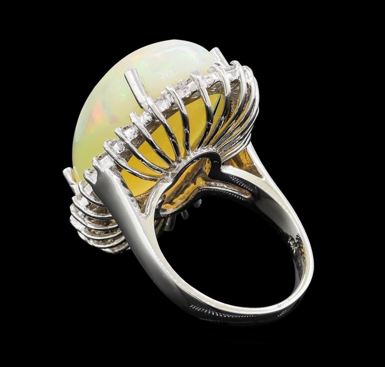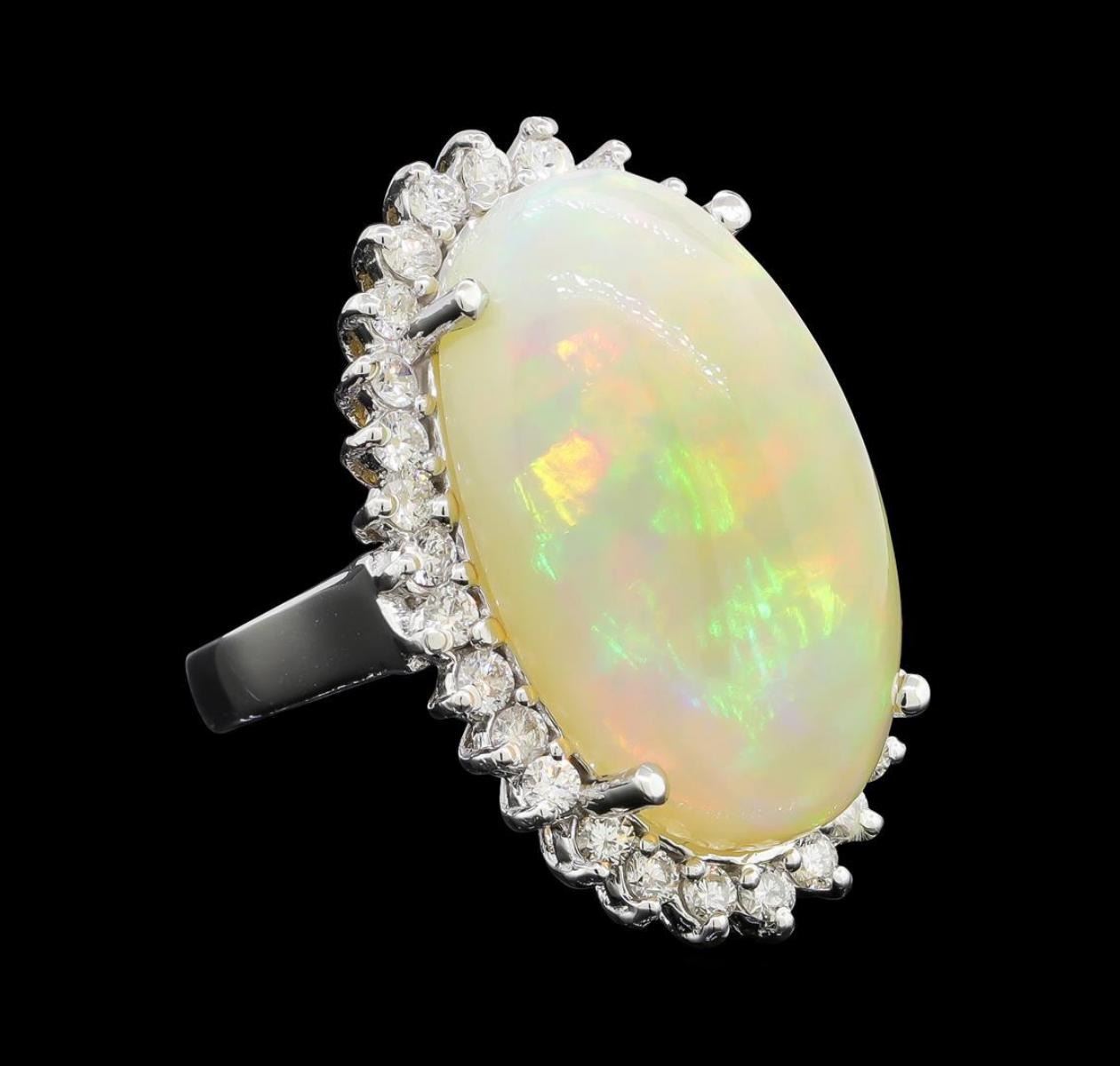 One electronically tested 14KT white gold lady's cast fashion ring with a basket halo with a bright polish finish. The featured lady's ring has a shank measuring 2.80 millimeters wide. Identified with markings of '14K'. Condition is new, good workmanship. Containing: One crystal opal that is cut in a oval shaped cabochon and is prong set, measuring 23.40 mm long x 13.39 mm wide, and 9.82 mm thick and the approximate weight is 15.46 carats. The opal has a somewhat bright, orange-green play of color (fire) in a rolling flashfire pattern; a high dome; a good cut; slightly included; minor dull spot in its brightness and pattern; and is slightly directional. Graded in the setting. Thirty prong set round brilliant cut diamonds, measuring 2.10 - 2.00 x 1.25mm (depth est.) approximate total weight of 30 Stones = 0.96ct. Graded in the setting. Clarity SI-1 to I-1. Color: H - I Cut Good. Total Weight of Diamonds 0.96ct.. Total Weight of Opals 15.46ct.. Total Weight of Ring 10.70gm. GAS Appraised.