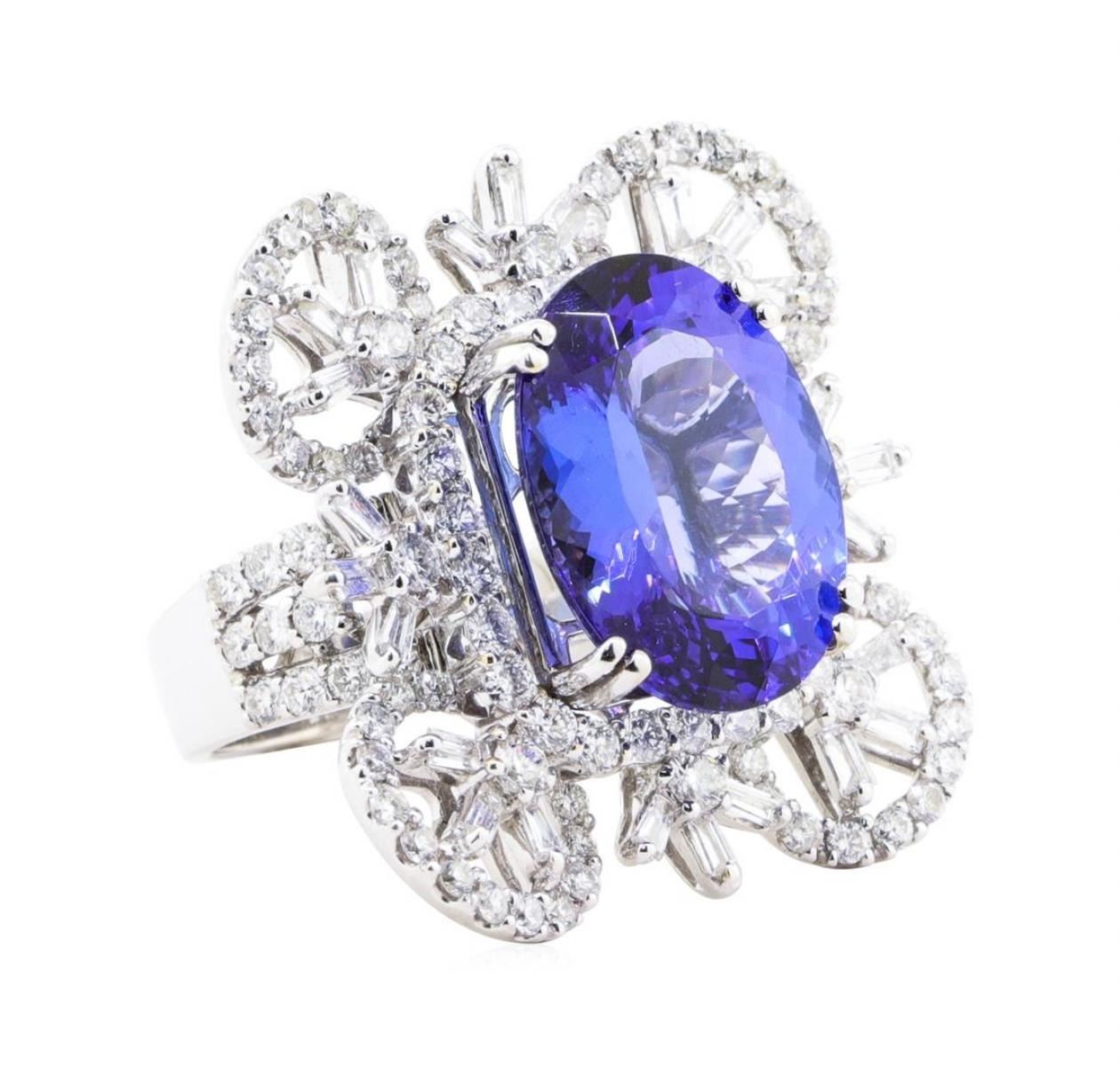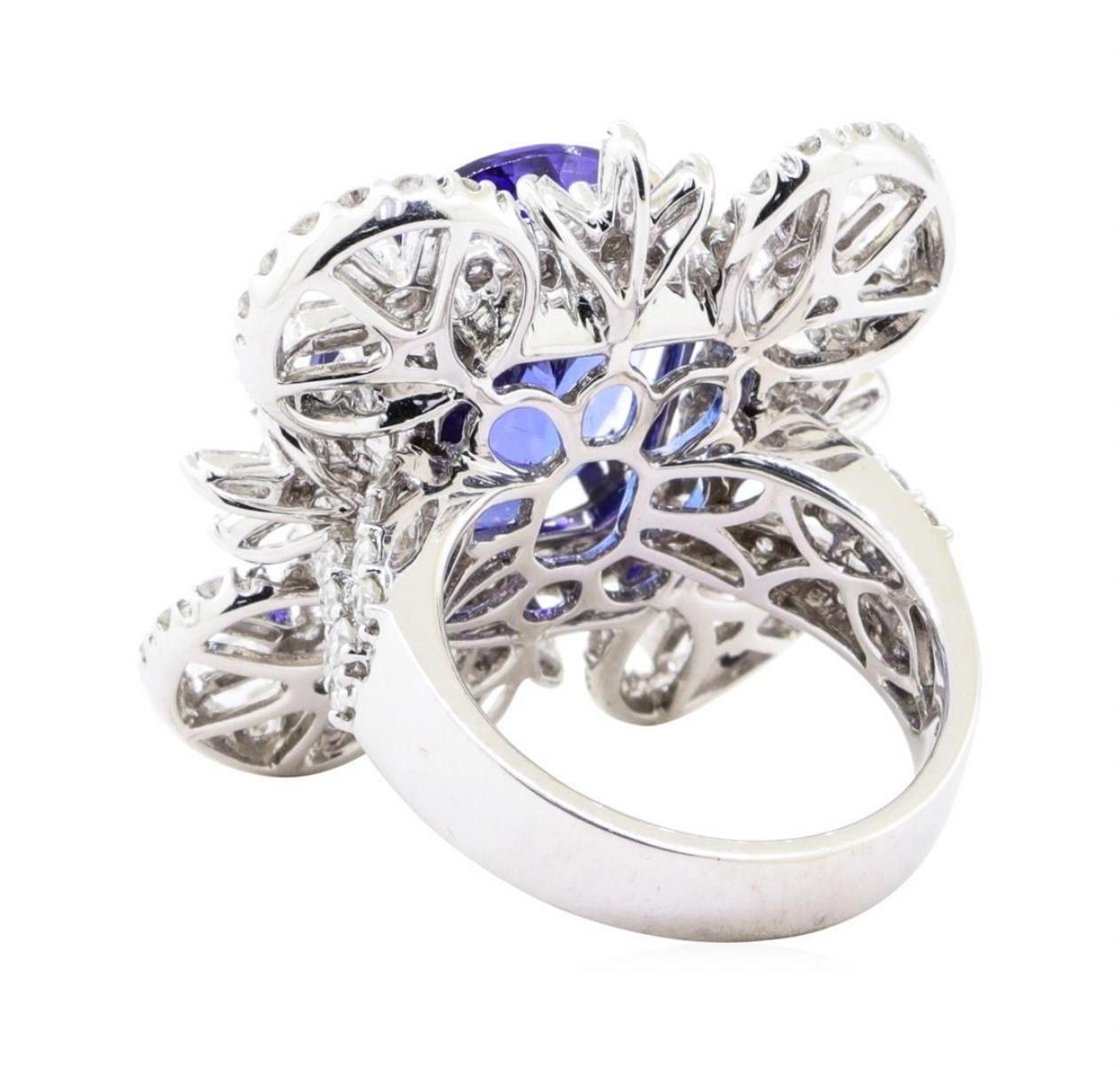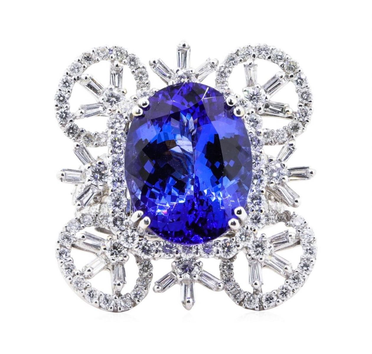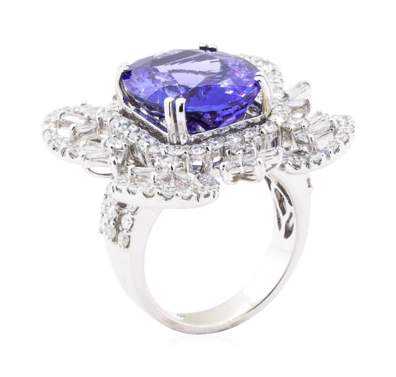 One electronically tested 18KT white gold lady's combination cast & assembled fashion ring with a custom floral halo motif with a bright polish finish. The featured lady's ring has a shank measuring 4.20 millimeters wide. Identified with markings of '18K 750'. Condition is new, good workmanship. Containing: One prong set oval modified mixed cut natural tanzanite, measuring 16.90 x 13.10 x 7.82mm, (depth est.) approximate weight of 12.10ct., clarity is eye clean, medium dark, strong, blue color, (GIA B 6/5), cut is very good. Transmitting light with no distortion, transparent. Colored gemstones are presumed to have been subjected to commonly used enhancement processes. Graded in the setting. Twenty-Four prong set baguette cut (tapered) diamonds, measuring from 2.40 x 1.10 x 0.94mm (depth est.) to 2.50 x 1.20 x 1.02mm (depth est.) approximate total weight of 24 Stones = 0.63ct. Graded in the setting. Color G - H Clarity VS-1 to VS-2 Cut Very Good Eight prong set round brilliant cut diamonds, measuring 2.60 - 2.50 x 1.58mm (depth est.) approximate total weight of 8 Stones = 0.50ct. Graded in the setting. Color H - I Clarity SI-1 to SI-2 Cut Very Good Twenty-Six prong set round brilliant cut diamonds, measuring 2.10 - 2.00 x 1.27mm (depth est.) approximate total weight of 26 Stones = 0.85ct. Graded in the setting. Color H - I Clarity SI-1 to SI-2 Cut Good Seventy-Four prong set round brilliant cut diamonds, measuring 1.70 - 1.65 x 1.04mm (depth est.) approximate total weight of 74 Stones = 1.41ct. Graded in the setting. Color H - I Clarity SI-1 to SI-2 Cut Good. Total Weight of Colored Stones 12.10ct.. Total Weight of Diamonds 3.39ct.. Total Weight of Ring 17.00gm GAS Appraised at $26535.00. GAS Appraised.