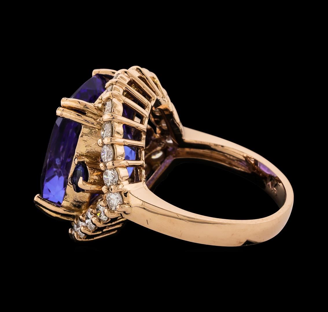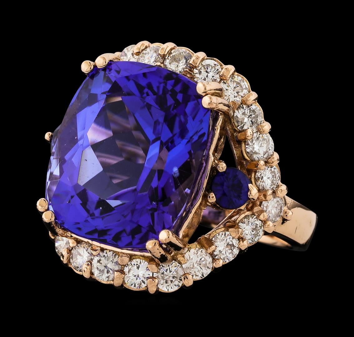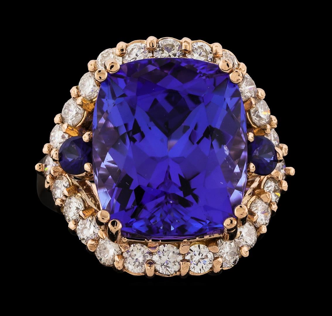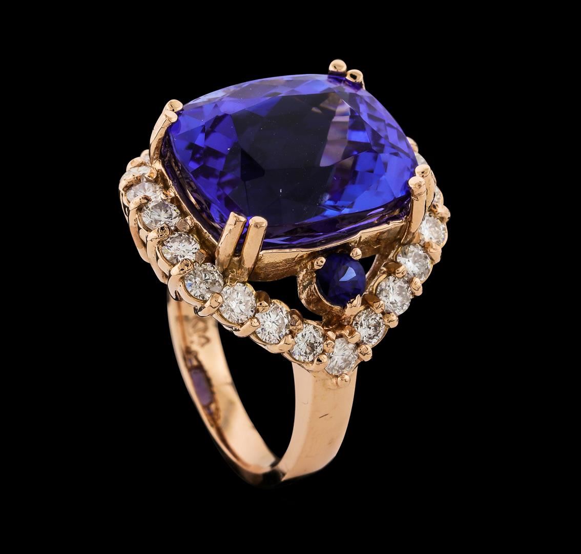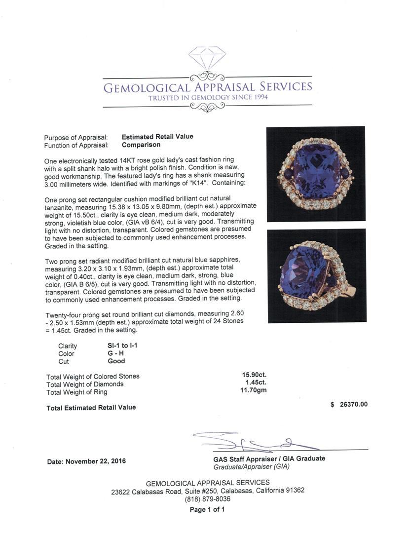 One electronically tested 14KT rose gold lady's cast fashion ring with a split shank halo with a bright polish finish. The featured lady's ring has a shank measuring 3.00 millimeters wide. Identified with markings of 'K14'. Condition is new, good workmanship. Containing: One prong set rectangular cushion modified brilliant cut natural tanzanite, measuring 15.38 x 13.05 x 9.80mm, (depth est.) approximate weight of 15.50ct., clarity is eye clean, medium dark, moderately strong, violetish blue color, (GIA vB 6/4), cut is very good. Transmitting light with no distortion, transparent. Colored gemstones are presumed to have been subjected to commonly used enhancement processes. Graded in the setting. Two prong set radiant modified brilliant cut natural blue sapphires, measuring 3.20 x 3.10 x 1.93mm, (depth est.) approximate total weight of 0.40ct., clarity is eye clean, medium dark, strong, blue color, (GIA B 6/5), cut is very good. Transmitting light with no distortion, transparent. Colored gemstones are presumed to have been subjected to commonly used enhancement processes. Graded in the setting. Twenty-Four prong set round brilliant cut diamonds, measuring 2.60 - 2.50 x 1.53mm (depth est.) approximate total weight of 24 Stones = 1.45ct. Graded in the setting. Clarity SI-1 to I-1. Color: G - H Cut Good. Total Weight of Colored Stones 15.90ct.. Total Weight of Diamonds 1.45ct.. Total Weight of Ring 11.70gm. GAS Appraised at $26,370.00.