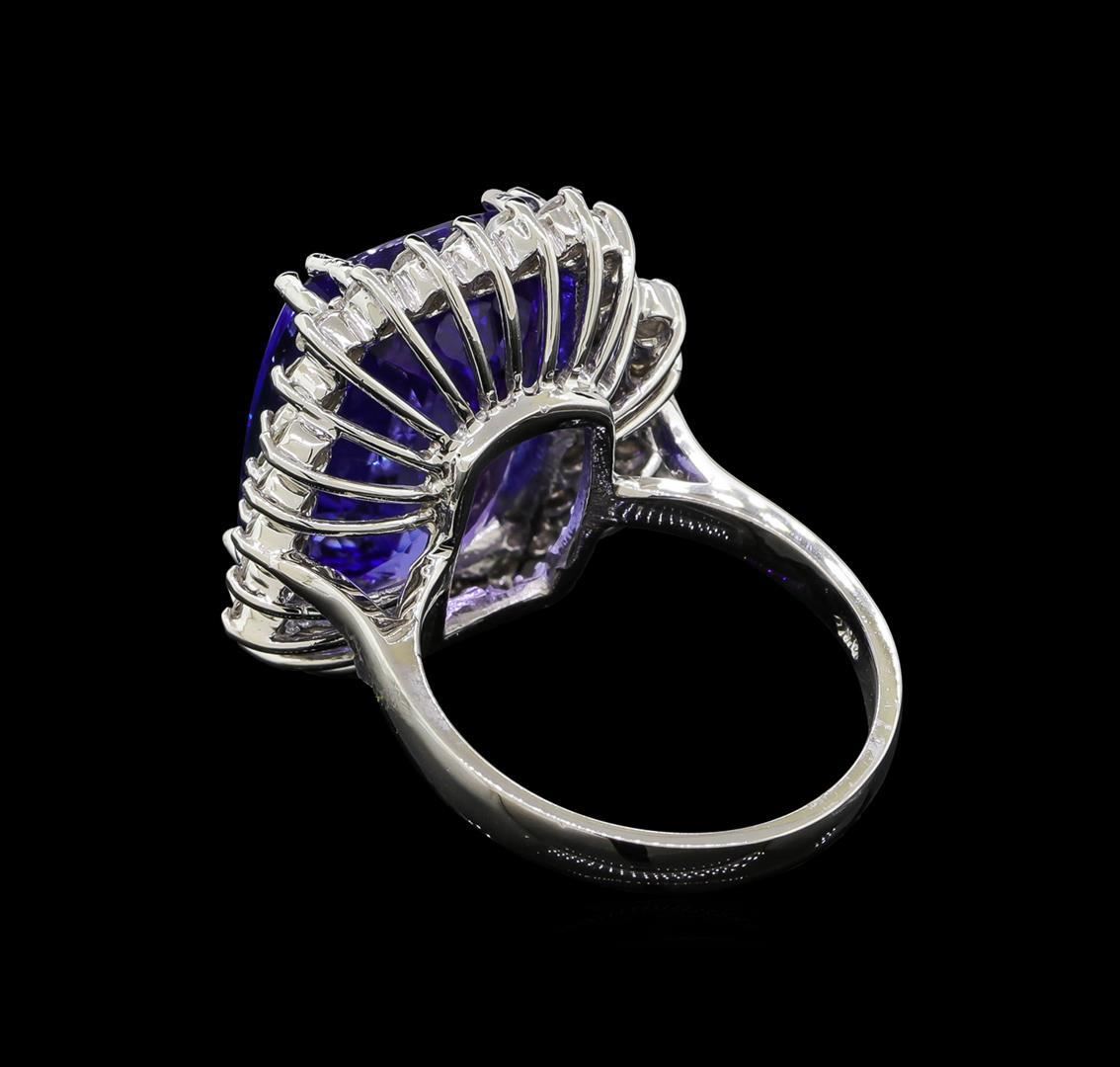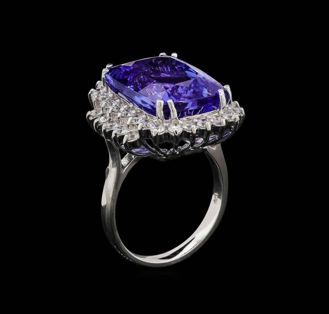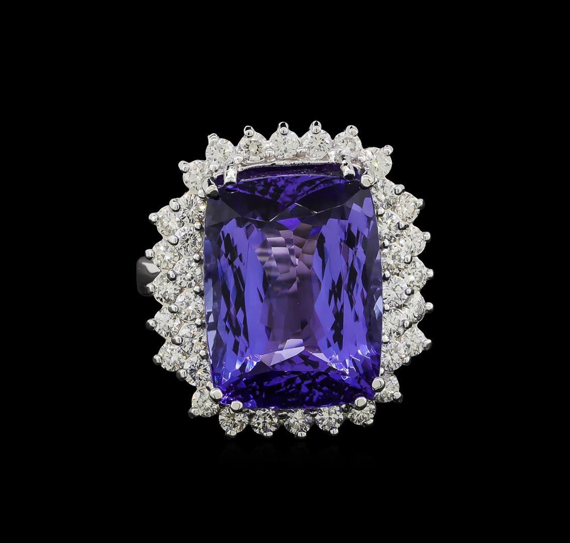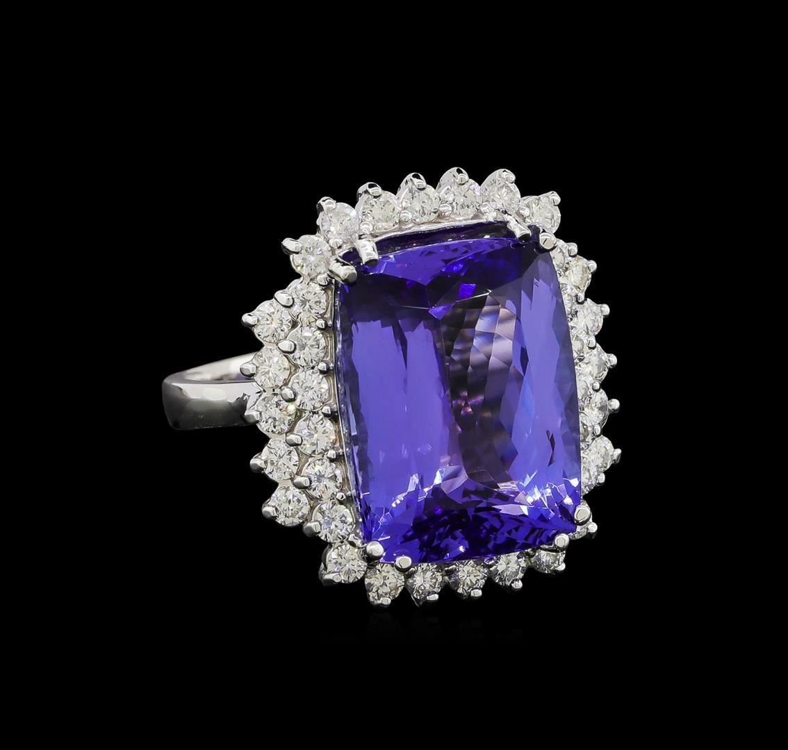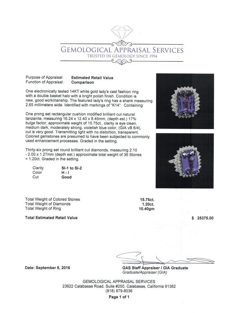 One electronically tested 14KT white gold lady's cast fashion ring with a double basket halo with a bright polish finish. The featured lady's ring has a shank measuring 2.65 millimeters wide. Identified with markings of 'K14'. Condition is new, good workmanship. Containing: One prong set rectangular cushion modified brilliant cut natural tanzanite, measuring 16.24 x 12.40 x 8.45mm, (depth est.) 17%. bulge factor, approximate weight of 15.75ct., clarity is eye clean, medium dark, moderately strong, violetish blue color, (GIA vB 6/4), cut is very good. Transmitting light with no distortion, transparent. Colored gemstones are presumed to have been subjected to commonly used enhancement processes. Graded in the setting. Thirty-Six prong set round brilliant cut diamonds, measuring 2.10 - 2.00 x 1.27mm (depth est.) approximate total weight of 36 Stones = 1.20ct. Graded in the setting. Clarity SI-1 to SI-2. Color: H - I Cut Good. Total Weight of Colored Stones 15.75ct.. Total Weight of Diamonds 1.20ct.. Total Weight of Ring 10.40gm GAS Appraised.