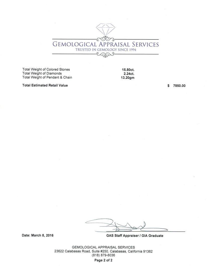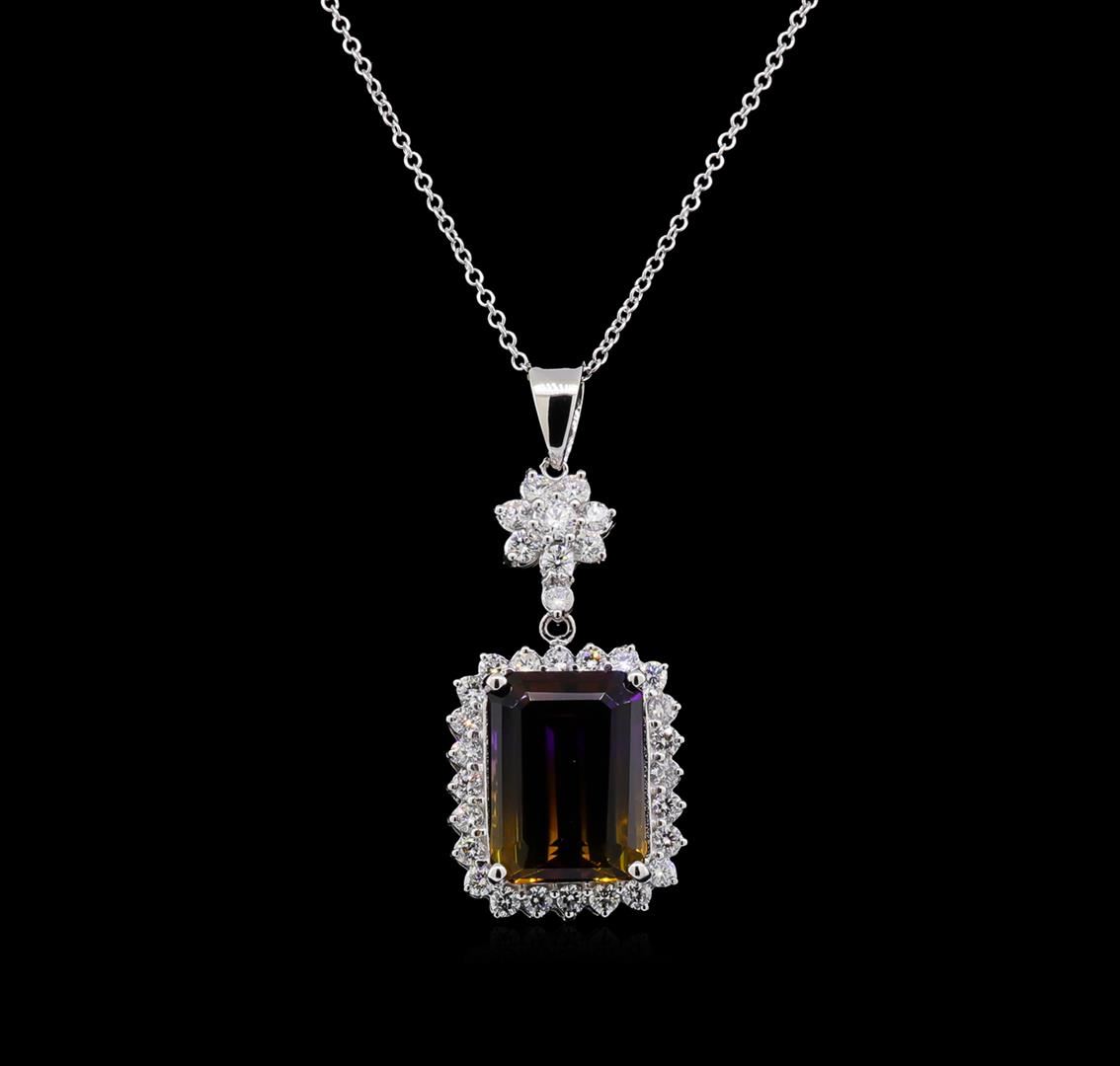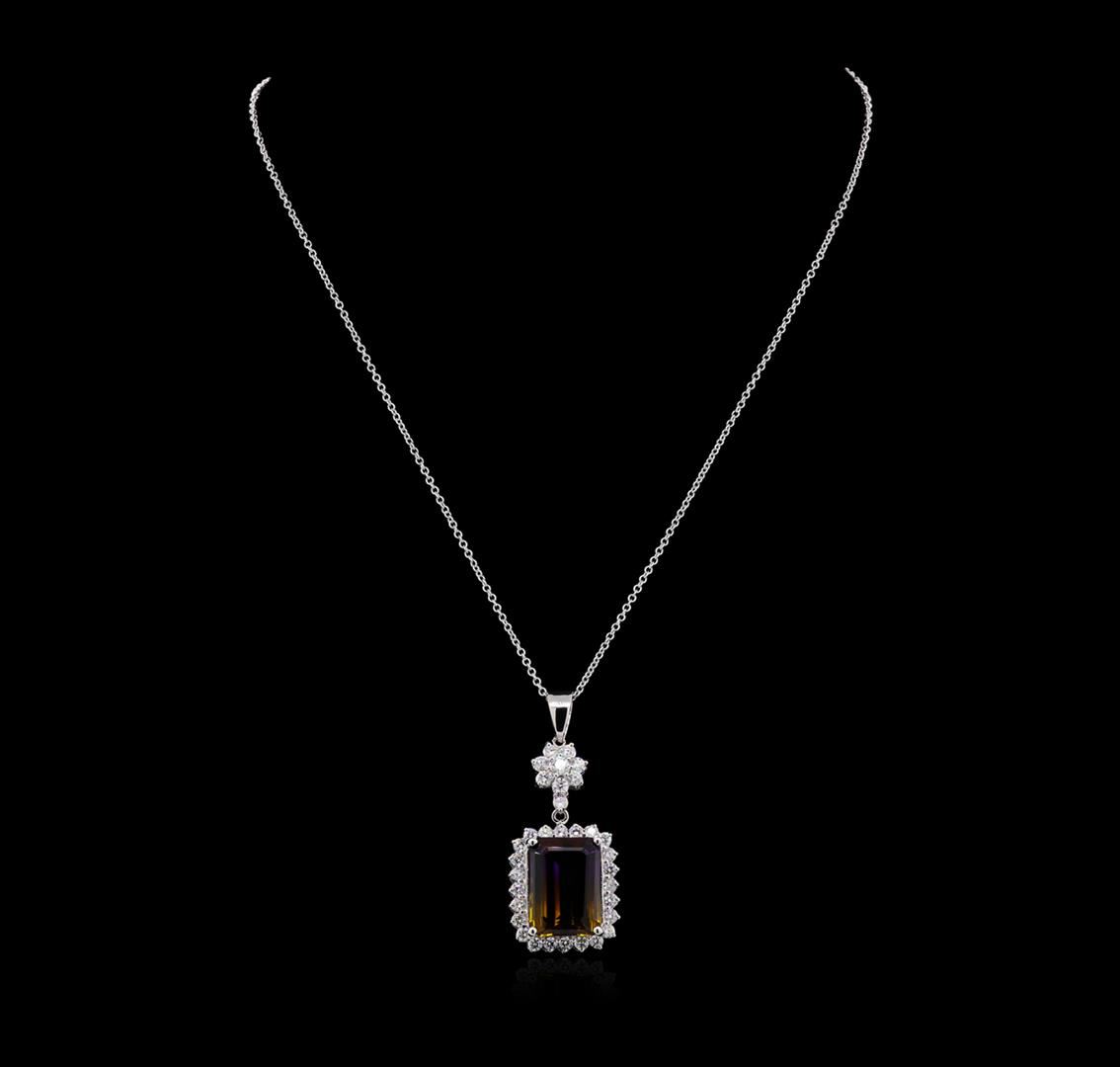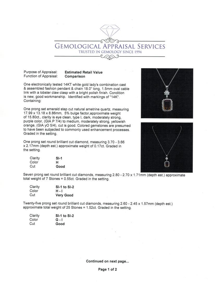 One electronically tested 14KT white gold lady's combination cast & assembled fashion pendant & chain 18.0" long, 1.5mm oval cable link with a lobster claw clasp with a bright polish finish. Identified with markings of "14K". Condition is new, good workmanship. Containing: One prong set emerald step cut natural ametrine quartz, measuring 17.99 x 13.18 x 8.86mm, 5%. bulge factor, approximate weight of 15.80 ct., clarity is eye clean, type I, dark, moderately strong, purple color, (GIA P 7/4) to medium, moderately strong, yellowish orange, (GIA yO 5/4), cut is good. Colored gemstones are presumed to have been subjected to commonly used enhancement processes. Graded in the setting. One prong set round brilliant cut diamond, measuring 3.70 - 3.66 x 2.17mm (depth est.) approximate weight of 0.17ct. Graded in the setting. Clarity: SI-1. Color: Good Seven prong set round brilliant cut diamonds, measuring 2.80 - 2.70 x 1.71mm (depth est.) approximate total weight of 7 Stones = 0.55ct. Graded in the setting. Clarity: SI-1 to SI-2. Color: H - I. Cut Very Good Twenty-Five prong set round brilliant cut diamonds, measuring 2.60 - 2.45 x 1.57mm (depth est.) approximate total weight of 25 Stones = 1.52ct. Graded in the setting. Clarity: SI-1 to SI-2. Color: G - I. Cut Good. Total Weight of Colored Stones 15.80 ct. Total Weight of Diamonds 2.24ct. Total Weight of Pendant & Chain 13.20gm. GAS Appraised.