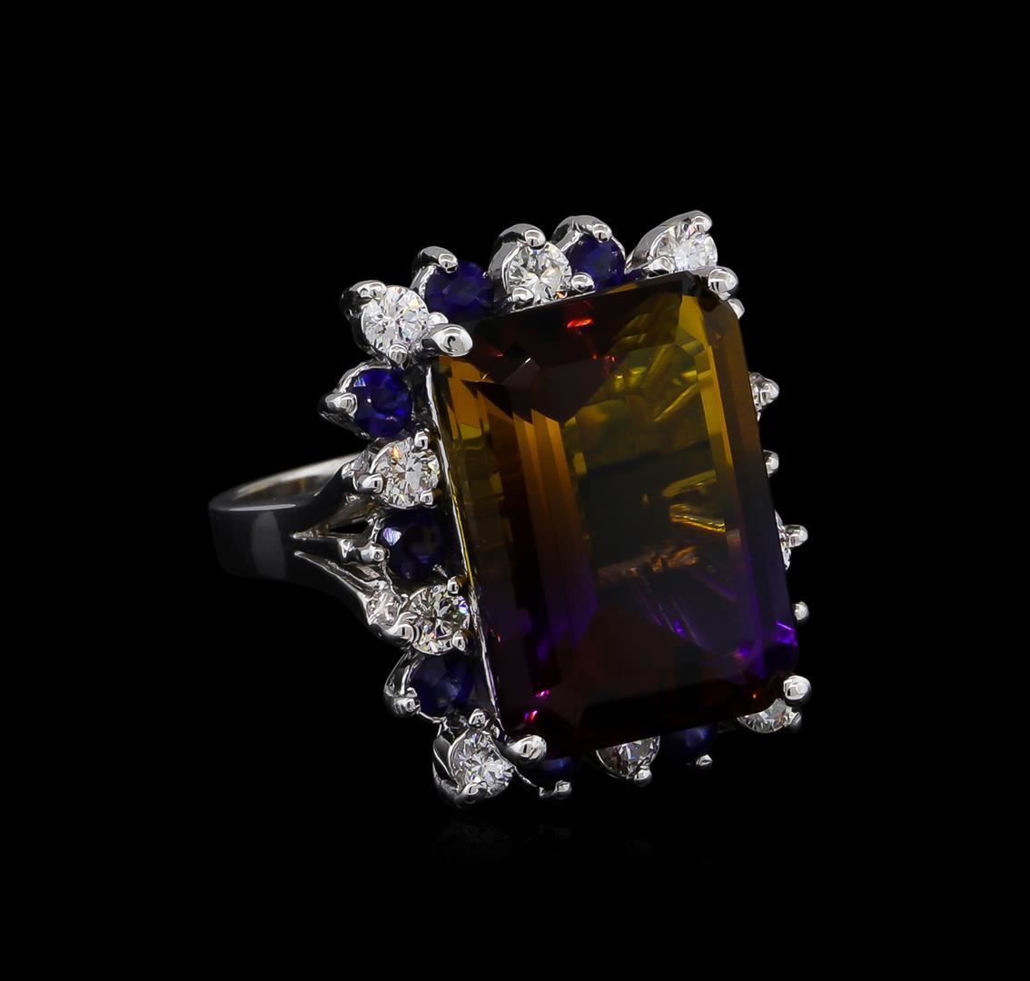 One electronically tested 14KT white gold ladies cast ametrine, sapphire and diamond ring with a bright polish finish. The featured ametrine is set within a sapphire and diamond bezel supported by a ribbed under gallery, completed by a three millimeter wide band. Identified with markings of "14K". Condition is new, good workmanship. Containing: One prong set rectangular step cut natural ametrine quartz, measuring 18.00 x 13.20 x 9.00mm, approximate weight of 15.97ct., clarity is eye clean, type I, dark, moderately strong, purple color, (GIA P 7/4) to medium dark, moderately strong, orangy yellow, (GIA oY 6/4), cut is good. Transmitting light with no distortion, transparent. Graded in the setting. Ten prong set round mixed cut natural blue sapphires approximate. Total Weight of 1.08ct., clarity is slightly included, type II, dark, moderately strong, blue color, (GIA B 7/4), cut is good. Transmitting light with a minimum of distortion, transparent. Naturally occurring internal & external characteristics are present. Indications of laboratory high temperature diffusion treatment. Color grade is an average for the group. Graded in the setting. Ten prong set round brilliant cut diamonds approximate. Total Weight of 10 Stones = 0.75ct. Graded in the setting. Clarity: SI-1 to SI-2. Color: E - F. Total Weight of Colored Stones 17.05ct. Total Weight of Diamonds 0.75ct. Total Weight of Ring 13.48gm. AIG Appraised.