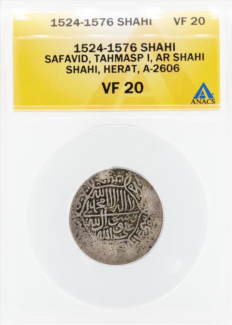 One 1524-1576 Shahi Safavid Tahmasp I AR Shahi Herat Coin ANACS VF20. ANACS Appraised.