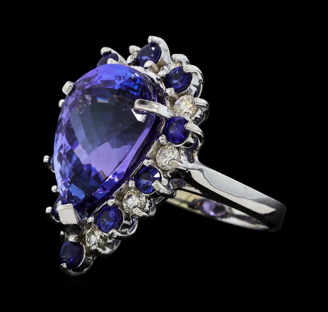 One electronically tested 14KT white gold lady's cast fashion ring with a staggered basket halo with a bright polish finish. The featured lady's ring has a shank measuring 2.80 millimeters wide. Identified with markings of 'K14'. Condition is new, good workmanship. Containing: One prong set pear modified brilliant cut natural tanzanite, measuring 16.62 x 13.35 x 10.82mm, (depth est.) approximate weight of 16.06ct., clarity is eye clean, medium, moderately strong, violetish blue color, (GIA vB 5/4), cut is very good. Transmitting light with no distortion, transparent. Colored gemstones are presumed to have been subjected to commonly used enhancement processes. Graded in the setting. Ten prong set round modified brilliant cut natural blue sapphires, measuring 2.90 - 2.80 x 1.86 mm, (depth est.) approximate total weight of 1.22ct., clarity is eye clean, medium, strong, blue color, (GIA B 5/5), cut is good. Transmitting light with no distortion, transparent. Colored gemstones are presumed to have been subjected to commonly used enhancement processes. Graded in the setting. Ten prong set round brilliant cut diamonds, measuring 2.75 - 2.65 x 1.67mm (depth est.) approximate total weight of 10 Stones = 0.75ct. Graded in the setting. Clarity SI-1 to SI-3. Color: H - I Cut Good. Total Weight of Colored Stones 17.28ct.. Total Weight of Diamonds 0.75ct.. Total Weight of Ring 10.60gm. GAS Appraised.